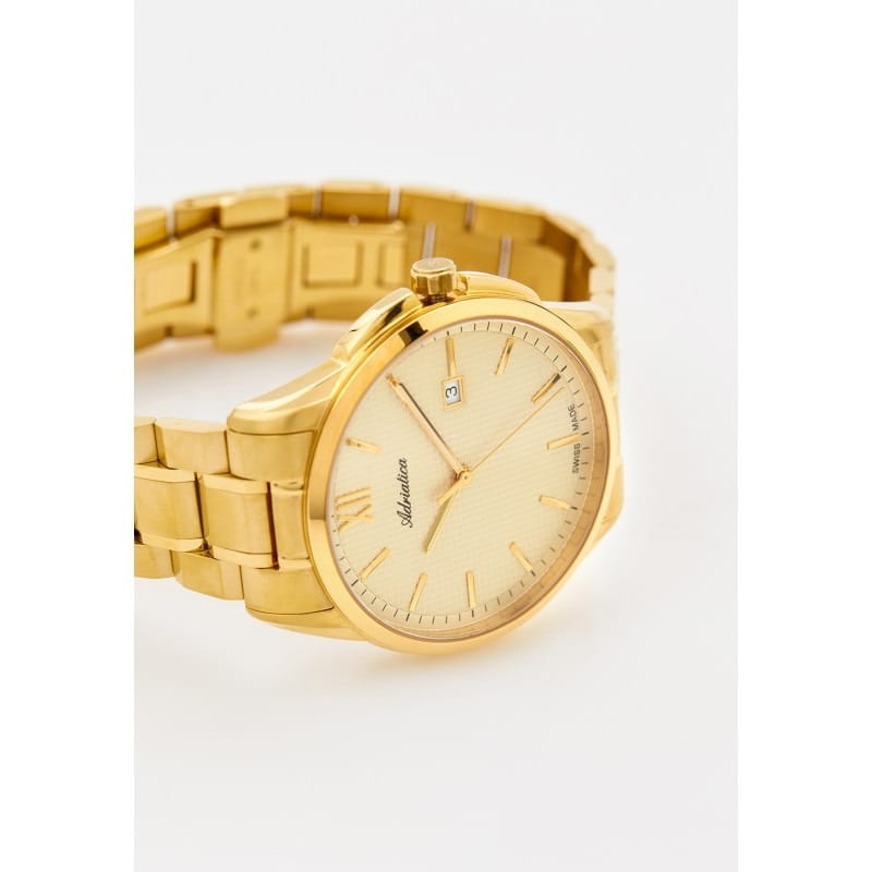 Часы Adriatica A1290.1161Q представляют собой идеальное сочетание элегантности и функциональности, разработанное для современных мужчин. Их стильный циферблат защищен сапфировым стекломСапфировое стеклоПрочный и надёжный материал из кристалла сапфира синтетического происхождения, характеризующийся особой твёрдостью и устойчивостью к царапинам и повреждениям., что придает дополнительную устойчивость к царапинам. Золотистый корпус и безельБезельВнешний ободок, закрепляющий стекло. В спортивных часах так называется поворотное кольцо с делениями на циферблате, выполняет роль таймера – замеряет отрезки времени на шкале. Неподвижный безель – элемент декора. Однонаправленно вращающийся безель на дайверских часах позволяет фиксировать моменты погружения и выныривания на поверхность. выполнен из нержавеющей стали с PVDPVDУльтратонкое покрытие наносится в технике вакуумного напыления, сочетает в себе нитрид титана особой прочности со слоем золота или оксида хрома. Несёт в себе декоративную или защитную функцию. покрытием, подчеркивая их изысканность и долговечность. Надежный кварцевый механизм с калибром ETA F06 (PreciDrive) гарантирует точность времени, а водозащита WR 50 (5 ATM) обеспечивает защиту от воды в различных условиях. Браслет из нержавеющей стали, с PVDPVDУльтратонкое покрытие наносится в технике вакуумного напыления, сочетает в себе нитрид титана особой прочности со слоем золота или оксида хрома. Несёт в себе декоративную или защитную функцию.-покрытием и с застежкой «бабочка»Застёжка "бабочка"Такой вид застёжки дополняется предохранителями, помогающими избежать случайного раскрытия браслета. Обладают изящным исполнением. гармонично дополняет общий дизайн и обеспечивает комфортное ношение на запястье. Часы оснащены функцией отображения даты в окошке в положении 3 часа, что добавляет практичности в повседневной жизни. Люминесцентное покрытиеЛюминесцентное покрытиеПозволяет считывать показания времени в темноте. Производители наносят на стрелки, часовые индексы, безель или поверхность циферблата светонакопительный состав, дающий холодное свечение. на стрелках и метках обеспечивает отличную видимость в темноте.