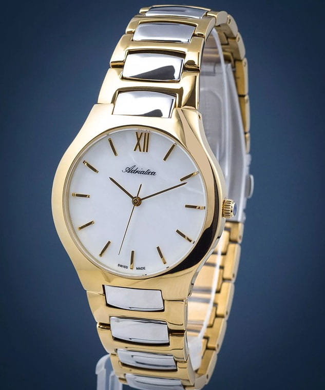 Часы Adriatica A3425.216FQ воплощают в себе утонченность и надежность швейцарского часового искусства. Эти часы идеально подойдут для тех, кто ценит стиль и качество в одном изделии. Перламутровый циферблат защищен минеральным стекломМинеральное стеклоМинеральное стекло представляет собой искусственно выращенный минерал кварца. Такое стекло отличается особой устойчивостью к повреждениям и царапинам. Уступает по некоторым качествам сапфировому стеклу. и заключен в корпус из нержавеющей стали с PVDPVDУльтратонкое покрытие наносится в технике вакуумного напыления, сочетает в себе нитрид титана особой прочности со слоем золота или оксида хрома. Несёт в себе декоративную или защитную функцию. покрытием цвета желтого золота, которое придает дополнительную прочность и элегантный вид. Часы оснащены кварцевым механизмом Ronda 763, обеспечивающим высокую точность и надежность. Водозащита 50WR делает их устойчивыми к воздействию воды, что позволяет не беспокоиться о случайных брызгах. Стальной браслет с частичным PVDPVDУльтратонкое покрытие наносится в технике вакуумного напыления, сочетает в себе нитрид титана особой прочности со слоем золота или оксида хрома. Несёт в себе декоративную или защитную функцию. покрытием цвета желтого золота с раскладной застёжкойРаскладная застёжкаТакой тип застёжки используется только на браслетах из металла. Она никогда не раскрывается полностью, происходит разделение на 2 и более частей. Раскладывающая застёжка снизит вероятность потери часов к минимуму. подчеркивает современный стиль и обеспечивает комфортное ношение.