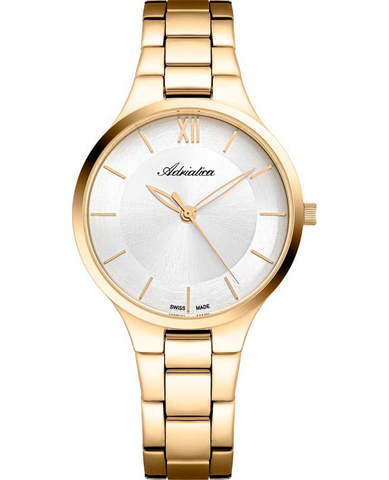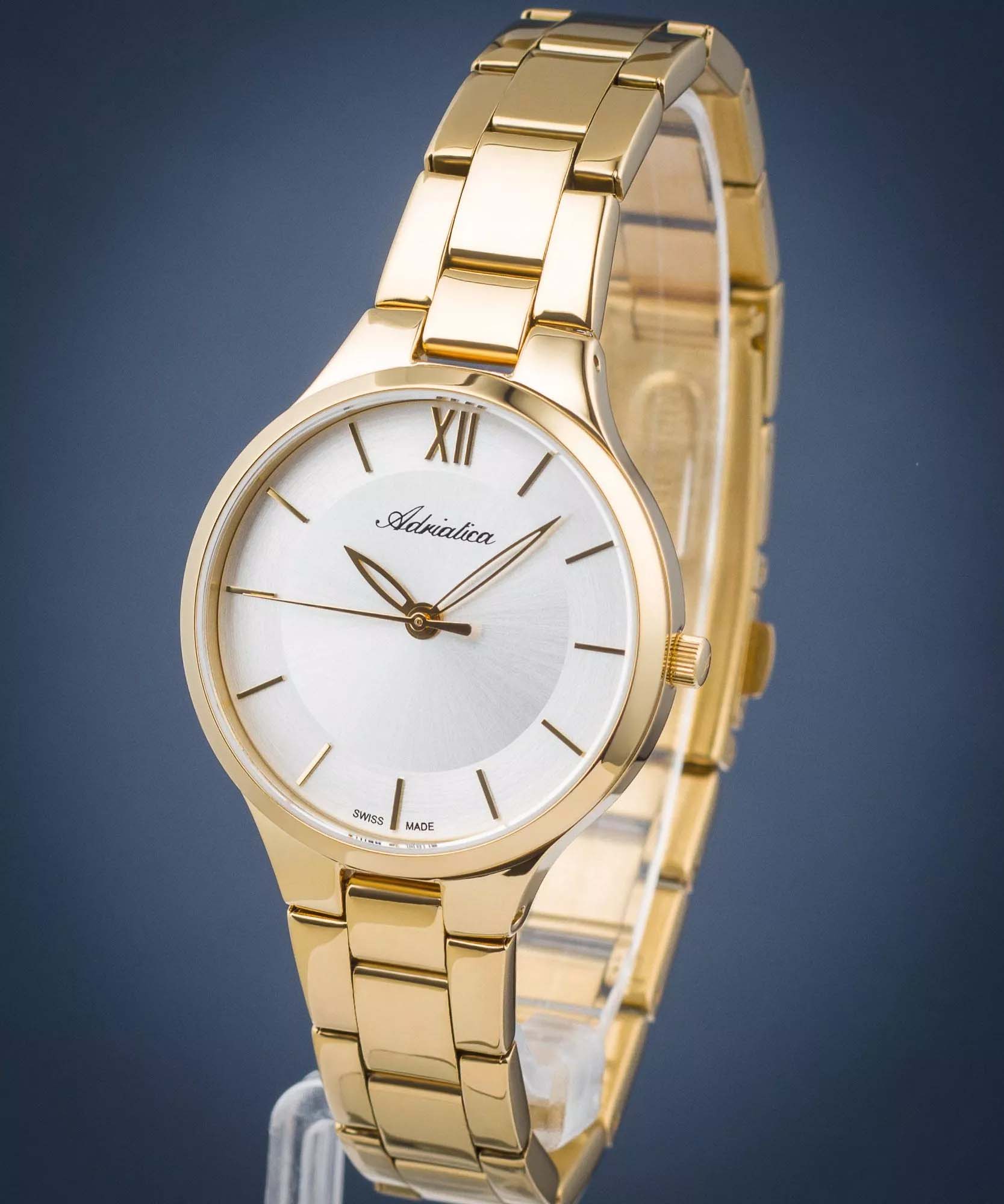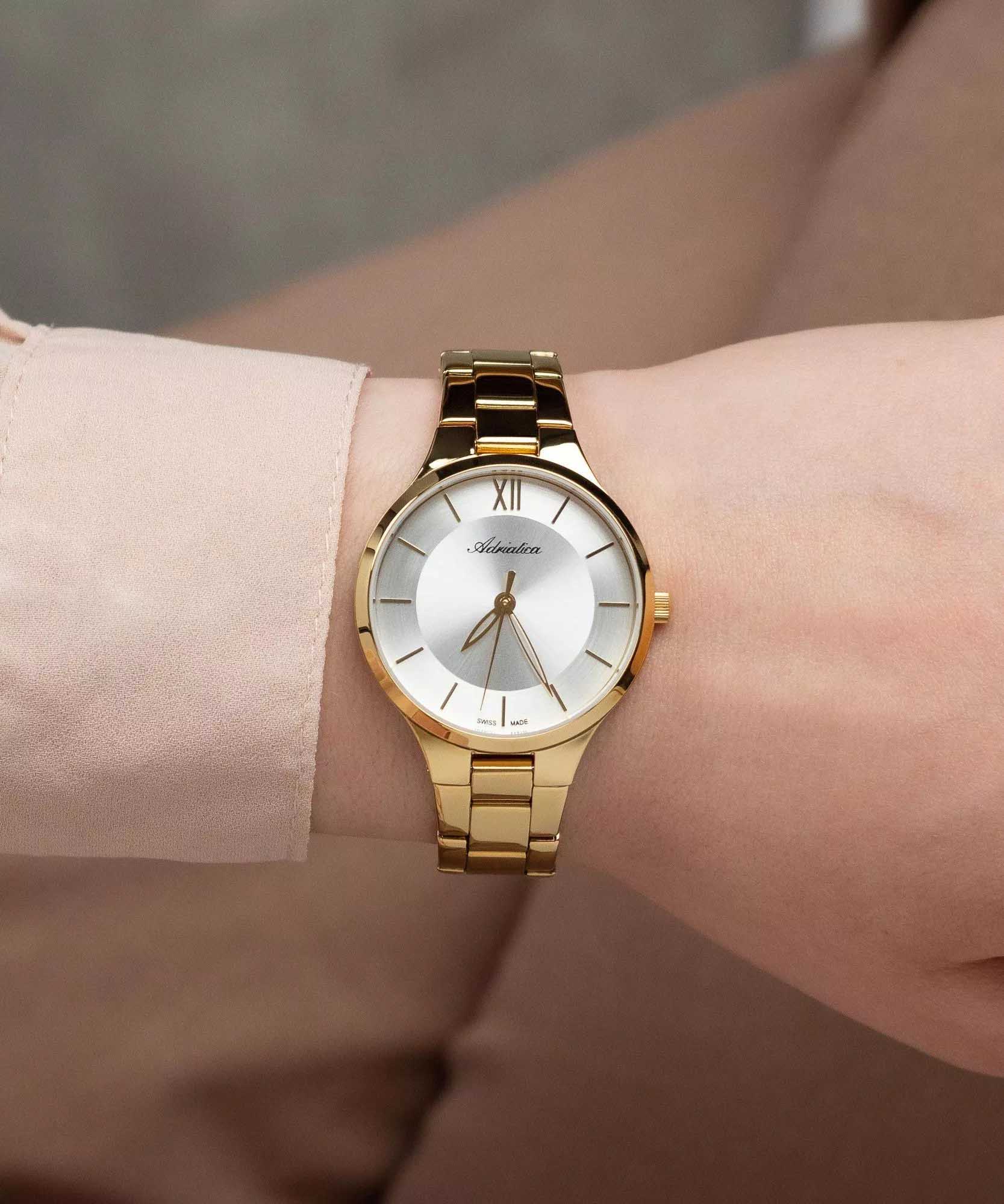 Женские кварцевые часы Adriatica A3823.1163Q — это элегантный аксессуар швейцарского производства с корпусом круглой формы, выполненным из нержавеющей стали с PVD-покрытиемPVDУльтратонкое покрытие наносится в технике вакуумного напыления, сочетает в себе нитрид титана особой прочности со слоем золота или оксида хрома. Несёт в себе декоративную или защитную функцию. в цвете жёлтое золото. Циферблат серебристого цвета оформлен с эффектом «солнечных лучей» (Sunray), дополнен центральной секундной стрелкой. Защиту обеспечивает минеральное стеклоМинеральное стеклоМинеральное стекло представляет собой искусственно выращенный минерал кварца. Такое стекло отличается особой устойчивостью к повреждениям и царапинам. Уступает по некоторым качествам сапфировому стеклу.. Браслет из нержавеющей стали с PVD-покрытиемPVDУльтратонкое покрытие наносится в технике вакуумного напыления, сочетает в себе нитрид титана особой прочности со слоем золота или оксида хрома. Несёт в себе декоративную или защитную функцию. фиксируется на раскладной застёжкеРаскладная застёжкаТакой тип застёжки используется только на браслетах из металла. Она никогда не раскрывается полностью, происходит разделение на 2 и более частей. Раскладывающая застёжка снизит вероятность потери часов к минимуму.. Водонепроницаемость 30 метров, позволит защитить корпус от случайных брызг или капель дождя.