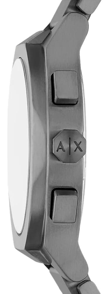 Мужские наручные часы-хронографХронографФункция позволяет измерять отрезки времени с особой точностью: часы, минуты, секунды. Верным признаком хронографа является наличие на циферблате 3 дополнительных окошек-счётчиков. Armani Exchange Rafael AX4182 сочетают в себе практичность и стильный дизайн, идеально подходя как для повседневной носки, так и для занятий спортом. Часы оснащены круглым корпусом из нержавеющей стали с IP-покрытиемIP-покрытиеМетод ионного напыления. Демонстрирует повышенную устойчивость к истиранию, окислению и химическим веществам. Под воздействием высокого давления и температуры около 1500°C молекулы металла надёжно соединяются с частицами корпуса часов. серого цвета, диаметром 42 мм. Особенностью модели является наличие окошка даты, расположенного между отметками 4 и 5 часов, что добавляет функциональности аксессуару. Стрелки обладают люминесцентным покрытиемЛюминесцентное покрытиеПозволяет считывать показания времени в темноте. Производители наносят на стрелки, часовые индексы, безель или поверхность циферблата светонакопительный состав, дающий холодное свечение., которое светится в темноте после зарядки на свету, обеспечивая отличную видимость в любых условиях. Защиту циферблата обеспечивают минеральное стеклоМинеральное стеклоМинеральное стекло представляет собой искусственно выращенный минерал кварца. Такое стекло отличается особой устойчивостью к повреждениям и царапинам. Уступает по некоторым качествам сапфировому стеклу., которое устойчиво к царапинам и сохраняет прозрачность на протяжении всего срока службы. Стальной браслет на раскладной застёжкеРаскладная застёжкаТакой тип застёжки используется только на браслетах из металла. Она никогда не раскрывается полностью, происходит разделение на 2 и более частей. Раскладывающая застёжка снизит вероятность потери часов к минимуму. не только комфортен в ношении, но и практичен благодаря своей прочности. Модель обладает водозащитой до 50 метров, что позволит защитить корпус от случайных брызг или капель дождя.