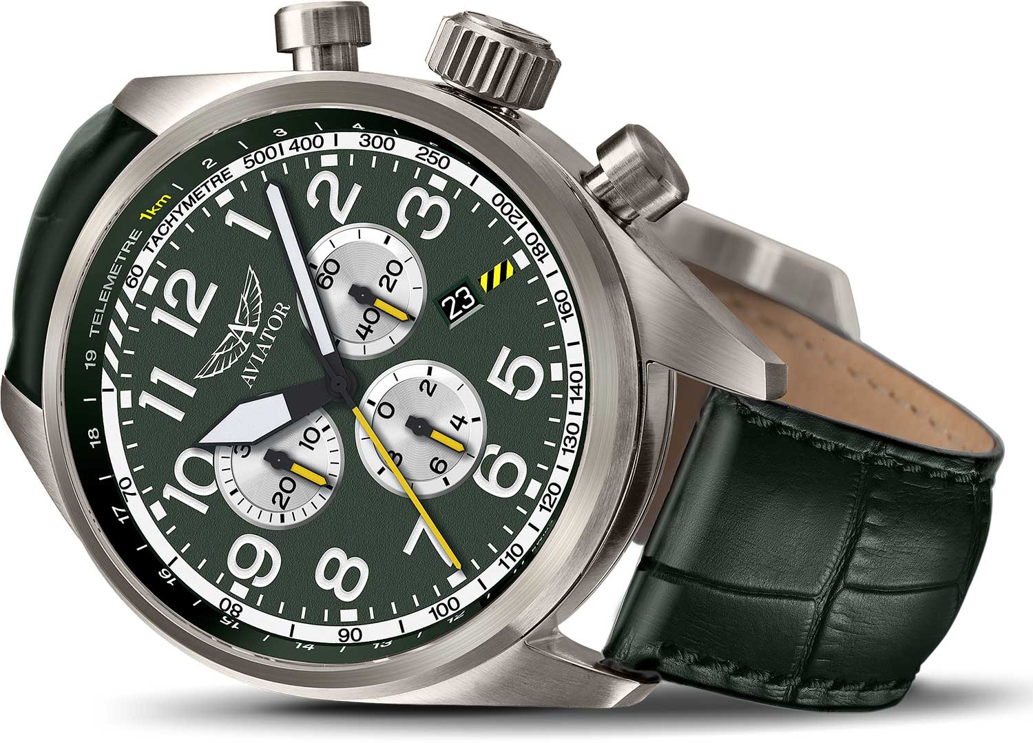 Aviator Airacobra V.2.25.7.171.4 — швейцарский GMT-хронограф в духе пилотских инструментов, объединяющий точность, удобство и лаконичный дизайн. Диаметр корпуса — 45 мм, выполнен из нержавеющей стали, что подчёркивает техническую надёжность в образе часов.