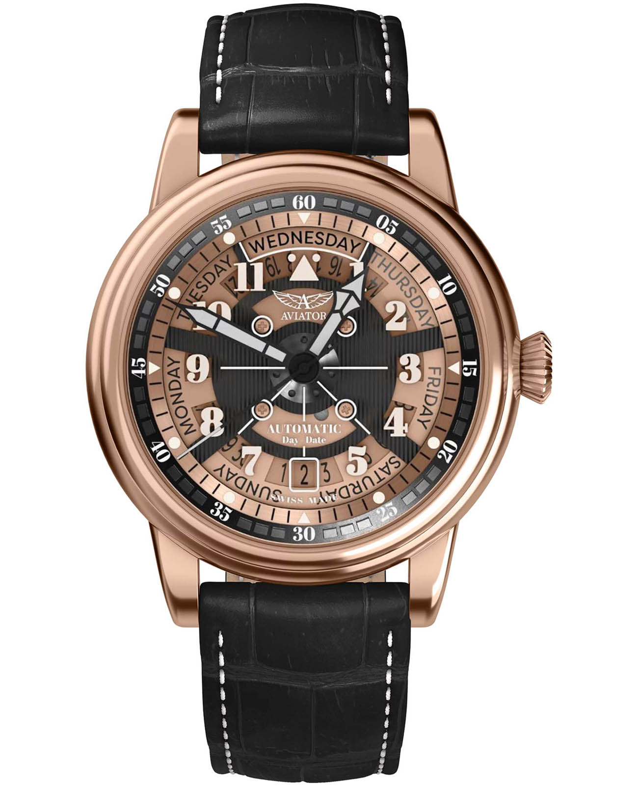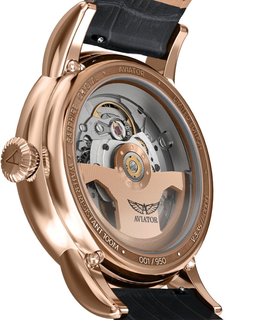 Aviator Douglas Day Date V.3.36.2.289.4 — швейцарские часы в классике авиадизайна, сочетающие безупречную читаемость и высокую надёжность. Лимитированная серия. Корпус диаметром 41 мм выполнен из нержавеющей стали 316L с PVD-покрытиемPVDУльтратонкое покрытие наносится в технике вакуумного напыления, сочетает в себе нитрид титана особой прочности со слоем золота или оксида хрома. Несёт в себе декоративную или защитную функцию. цвета розового золота. Накладные метки выполнены в виде арабских цифр. Окошко даты находится в положении 6 часов. День недели находится в положении 12 часов. Часовые метки и стрелки покрыты люминесцентным покрытиемЛюминесцентное покрытиеПозволяет считывать показания времени в темноте. Производители наносят на стрелки, часовые индексы, безель или поверхность циферблата светонакопительный состав, дающий холодное свечение. Superluminova, позволяющим легко определять время даже в тёмное время суток. Поверхность защищена прочным сапфировым стекломСапфировое стеклоПрочный и надёжный материал из кристалла сапфира синтетического происхождения, характеризующийся особой твёрдостью и устойчивостью к царапинам и повреждениям. с антибликовым покрытием, устойчивым к царапинам. Сердце модели — швейцарский механизм Sellita SW 240-2, известный своей точностью и долговечностью. Водозащита 100 метров, позволит плавать, нырять и заниматься другими водными видами спорта. Завинчивающаяся головка и задняя крышка обеспечивают уверенную ударопрочностьУдаропрочный корпусМеханизм заключён в корпус, выполненный из современных материалов, устойчивых к ударам, механическим повреждениям и падению с высоты: инновационный пластик, карбон, нержавеющая сталь, титан. и надёжную защиту от влаги и пыли. В механизме 26 камней, запас хода до 41 час. Модель дополнена кожаным ремешком с выразительной текстурой и классическим стилем, закреплённым с помощью застёжке-бабочке с кнопкамиЗастёжка "бабочка"Такой вид застёжки дополняется предохранителями, помогающими избежать случайного раскрытия браслета. Обладают изящным исполнением. — для максимального комфорта и лёгкости в повседневном использовании. Ротор механизма с заклепанными элементами и вырезанными окнами напоминает фюзеляж самолета. Aviator — это образец лётной точности, инженерной чёткости и сдержанной роскоши, идеально подходящий для тех, кто ценит функциональность и уверенность в каждом элементе.