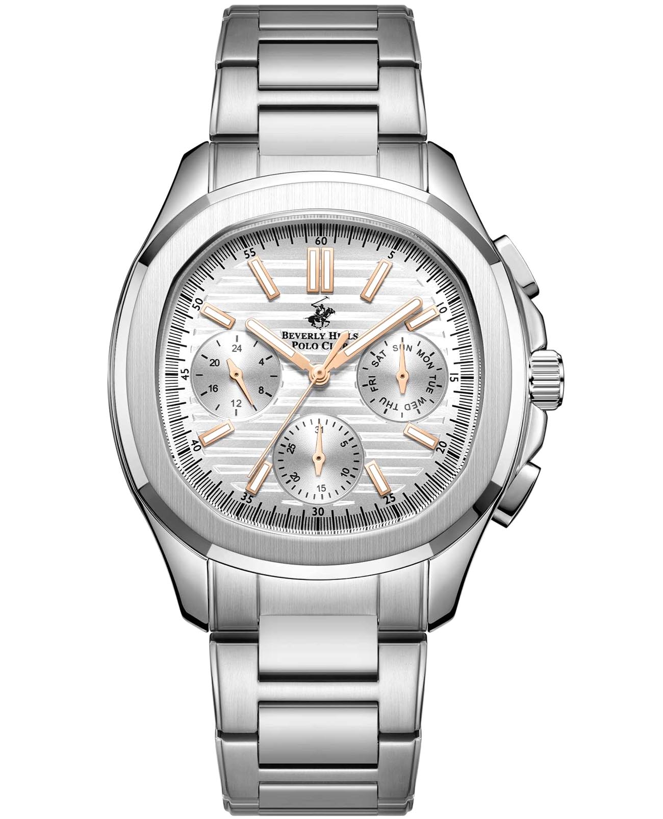 Американские мужские часы Beverly Hills Polo Club BP3212X.331 - это стильный мужской аксессуар, который сочетает элегантный дизайн и практичность. Корпус выполнен из нержавеющей стали диаметром 42 мм, что обеспечивает долговечность и утончённый внешний вид. Надежное минеральное стеклоМинеральное стеклоМинеральное стекло представляет собой искусственно выращенный минерал кварца. Такое стекло отличается особой устойчивостью к повреждениям и царапинам. Уступает по некоторым качествам сапфировому стеклу. с сапфировым покрытием защищает циферблат от царапин и обеспечивает долговечность. Модель оснащена кварцевым механизмом, обеспечивающим высокую точность хода. Стрелки и метки покрыты люминесцентным покрытиемЛюминесцентное покрытиеПозволяет считывать показания времени в темноте. Производители наносят на стрелки, часовые индексы, безель или поверхность циферблата светонакопительный состав, дающий холодное свечение., обеспечивая удобное считывание показаний в условиях недостаточного освещения. Стальной браслет на раскладной застёжкеРаскладная застёжкаТакой тип застёжки используется только на браслетах из металла. Она никогда не раскрывается полностью, происходит разделение на 2 и более частей. Раскладывающая застёжка снизит вероятность потери часов к минимуму. обеспечивает комфортное ношение. Функциональность модели расширена за счёт индикации дня недели и 24-часового формата времени. Водозащита 50 метров позволит защитить корпус от случайных брызг или капель дождя. Эта модель – отличный выбор для тех, кто ищет сочетание стиля, качества и функциональности. Часы станут не только полезным аксессуаром, но и выразительным элементом вашего имиджа.