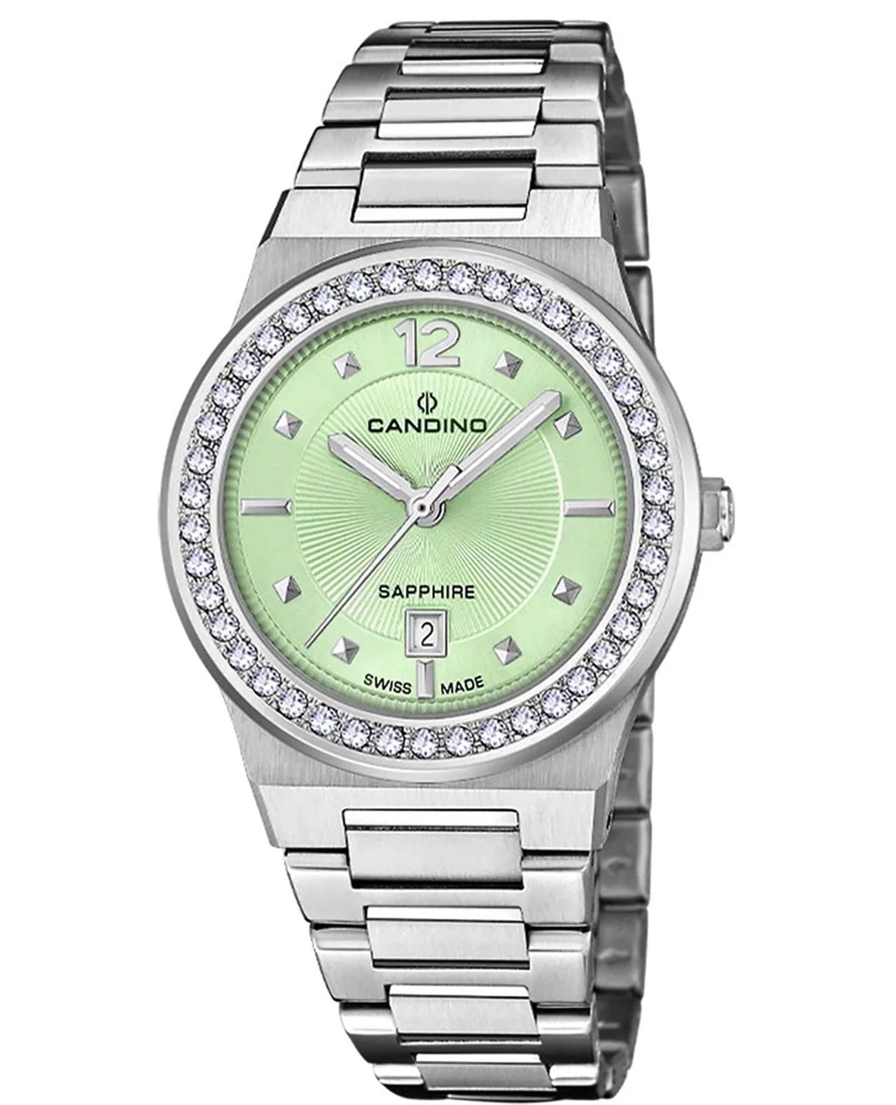 Женские кварцевые часы Candino из коллекции Lady Elegance — это элегантный аксессуар швейцарского производства, сочетающий изысканный дизайн и надёжность. Корпус круглой формы выполнен из стали серебряного цвета и защищён сапфировым стекломСапфировое стеклоПрочный и надёжный материал из кристалла сапфира синтетического происхождения, характеризующийся особой твёрдостью и устойчивостью к царапинам и повреждениям.. Безель украшен кристаллами, подчёркивая роскошь модели. Циферблат зелёного цвета оформлен точками в качестве индикации, окошко даты расположено на отметке 6 часов. Стрелки и метки оснащены люминесцентным покрытиемЛюминесцентное покрытиеПозволяет считывать показания времени в темноте. Производители наносят на стрелки, часовые индексы, безель или поверхность циферблата светонакопительный состав, дающий холодное свечение. Luminova, обеспечивающим хорошую читаемость в темноте. Браслет из стали серебряного цвета фиксируется на раскладной застёжкеРаскладная застёжкаТакой тип застёжки используется только на браслетах из металла. Она никогда не раскрывается полностью, происходит разделение на 2 и более частей. Раскладывающая застёжка снизит вероятность потери часов к минимуму.. Водонепроницаемость составляет 50 WR, что позволяет использовать часы в повседневных условиях, защищая от случайных брызг и капель дождя. Модель идеально подходит для повседневного ношения, подчёркивая утончённый стиль и женственность.