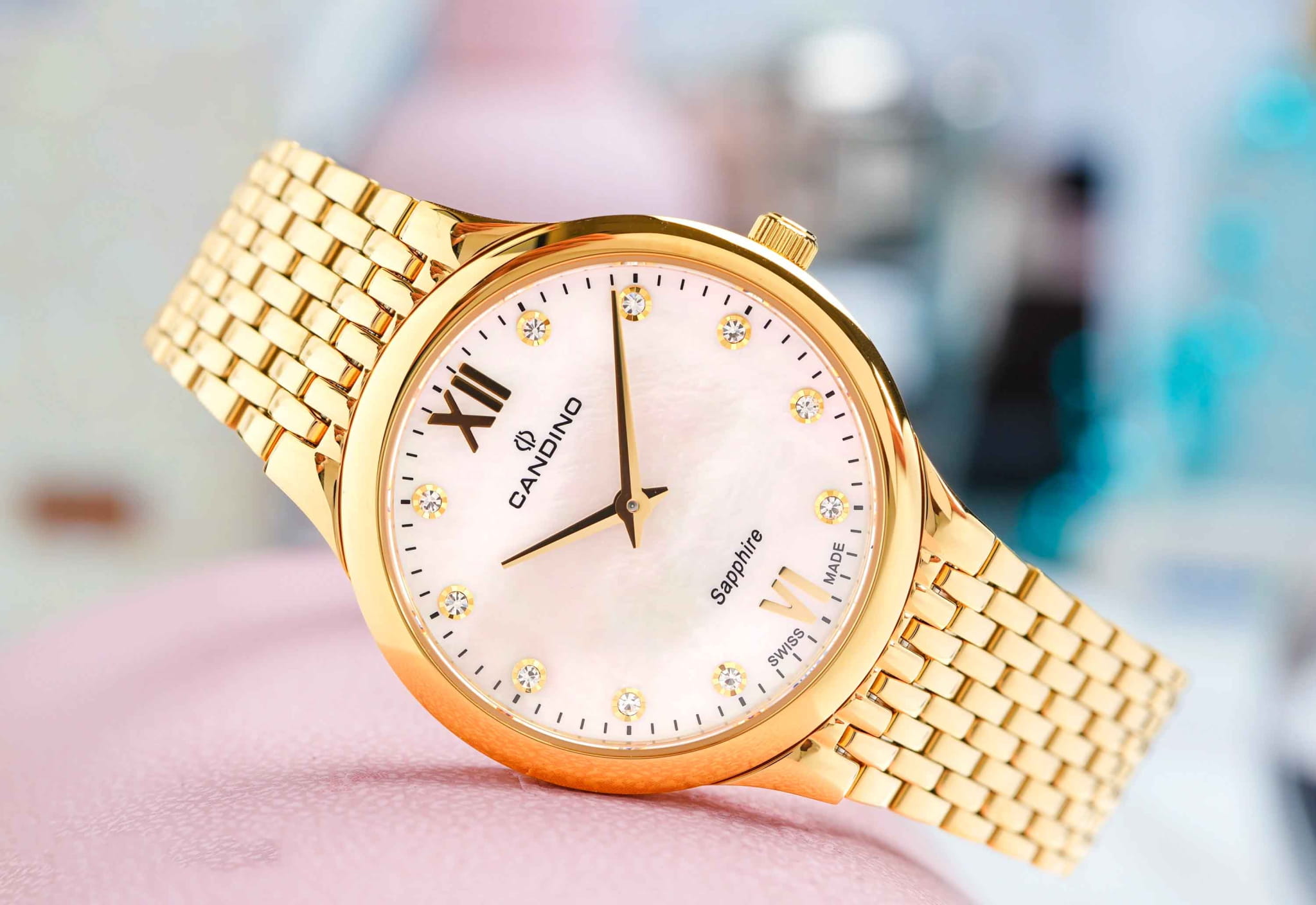Женские кварцевые часы Candino из коллекции Series 1947 — это утончённый аксессуар, сочетающий минимализм и швейцарское качество. Корпус диаметром 33,5 мм и толщиной 6 мм выполнен из нержавеющей стали 316L с PVD-покрытиемPVDУльтратонкое покрытие наносится в технике вакуумного напыления, сочетает в себе нитрид титана особой прочности со слоем золота или оксида хрома. Несёт в себе декоративную или защитную функцию. жёлтого золота. Циферблат бежевого цвета оформлен двумя стрелками без индикации даты, что придаёт дизайну чистоту и элегантность. Циферблат защищён сапфировым стекломСапфировое стеклоПрочный и надёжный материал из кристалла сапфира синтетического происхождения, характеризующийся особой твёрдостью и устойчивостью к царапинам и повреждениям., устойчивым к царапинам. Метки циферблата выполнены из циркония. Механизм — кварцевый произведённый в Швейцарии. Часы оснащены стальным браслетом с PVD-покрытиемPVDУльтратонкое покрытие наносится в технике вакуумного напыления, сочетает в себе нитрид титана особой прочности со слоем золота или оксида хрома. Несёт в себе декоративную или защитную функцию. жёлтого золота на застёжке «бабочка» с кнопкамиЗастёжка "бабочка"Такой вид застёжки дополняется предохранителями, помогающими избежать случайного раскрытия браслета. Обладают изящным исполнением. . Водонепроницаемость 50 м позволяет использовать часы в повседневных условиях. Гарантия — 2 года. Идеальный выбор для тех, кто ценит лаконичный стиль, точность и надёжность.