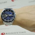 Крупный синий циферблат имеет золотистые элементы, каждая деталь навевает мысли о приборной панели автомобиля. Броский аксессуар станет стильным завершением индивидуального образа, наделив его спортивными чертами. Яркий хронографХронографФункция позволяет измерять отрезки времени с особой точностью: часы, минуты, секунды. Верным признаком хронографа является наличие на циферблате 3 дополнительных окошек-счётчиков. оснащён кварцевым механизмом с высокой точностью хода. Заводная головка с защитой и завинчивающаяся задняя крышка дополнительно способствуют сохранению водонепроницаемости до 10 бар. Минеральное стекло. Секундомер, окошко даты. Люминесцентная подсветкаЛюминесцентное покрытиеПозволяет считывать показания времени в темноте. Производители наносят на стрелки, часовые индексы, безель или поверхность циферблата светонакопительный состав, дающий холодное свечение.. Корпус из нержавеющей стали с частичным IP-покрытиемIP-покрытиеМетод ионного напыления. Демонстрирует повышенную устойчивость к истиранию, окислению и химическим веществам. Под воздействием высокого давления и температуры около 1500°C молекулы металла надёжно соединяются с частицами корпуса часов.. Габариты: 53,5 x 48,7 x 12,6 мм.