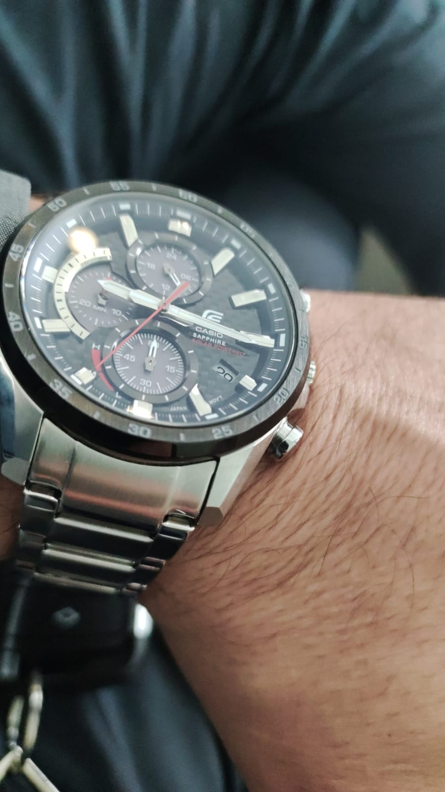 Габаритные наручные часы станут ключевой деталью для повседневного образа, привлекательно выглядят элементы красного цвета. Интерес вызывает необычный тёмный циферблат, имеющий карбоновую текстуру, переплетённые волокна образуют оригинальный узор. Ударопрочный корпусУдаропрочный корпусМеханизм заключён в корпус, выполненный из современных материалов, устойчивых к ударам, механическим повреждениям и падению с высоты: инновационный пластик, карбон, нержавеющая сталь, титан. и браслет на раскладной застёжкеРаскладная застёжкаТакой тип застёжки используется только на браслетах из металла. Она никогда не раскрывается полностью, происходит разделение на 2 и более частей. Раскладывающая застёжка снизит вероятность потери часов к минимуму. сделаны из стали 316L с антикоррозионными свойствами, за счёт чего часы надолго сохранят безупречный внешний вид. Модель получает питание от солнечного света Tough SolarTough SolarТехнология основана на подзарядке аккумулятора от источника солнечного света, специальная панель улавливает солнечные лучи и преобразует их в энергию для работы часов. Достаточно пары минут нахождения на солнце для функционирования часов в течении суток., состояние заряда можно отслеживать благодаря наличию особого индикатора. БезельБезельВнешний ободок, закрепляющий стекло. В спортивных часах так называется поворотное кольцо с делениями на циферблате, выполняет роль таймера – замеряет отрезки времени на шкале. Неподвижный безель – элемент декора. Однонаправленно вращающийся безель на дайверских часах позволяет фиксировать моменты погружения и выныривания на поверхность. с чёрным IP-покрытиемIP-покрытиеМетод ионного напыления. Демонстрирует повышенную устойчивость к истиранию, окислению и химическим веществам. Под воздействием высокого давления и температуры около 1500°C молекулы металла надёжно соединяются с частицами корпуса часов.. Закручивающаяся крышка с резьбовым соединением. Водонепроницаемость 100 метров. Подсветка NeobriteПодсветка NeobriteИспользование светонакопительных составов на основе сульфида цинка или алюмината стронция, яркий свет можно наблюдать на протяжении 6-10 часов после «зарядки» часов около источника света.. Сапфировое стеклоСапфировое стеклоПрочный и надёжный материал из кристалла сапфира синтетического происхождения, характеризующийся особой твёрдостью и устойчивостью к царапинам и повреждениям.. Часы-хронографХронографФункция позволяет измерять отрезки времени с особой точностью: часы, минуты, секунды. Верным признаком хронографа является наличие на циферблате 3 дополнительных окошек-счётчиков. с секундомеромСекундомерСекундоме́р — прибор, способный измерять интервалы времени с точностью до долей секунды. с точностью показаний 1с и временем измерения 30мин. Габариты: 51,5 x 47,6 x 12 мм.
