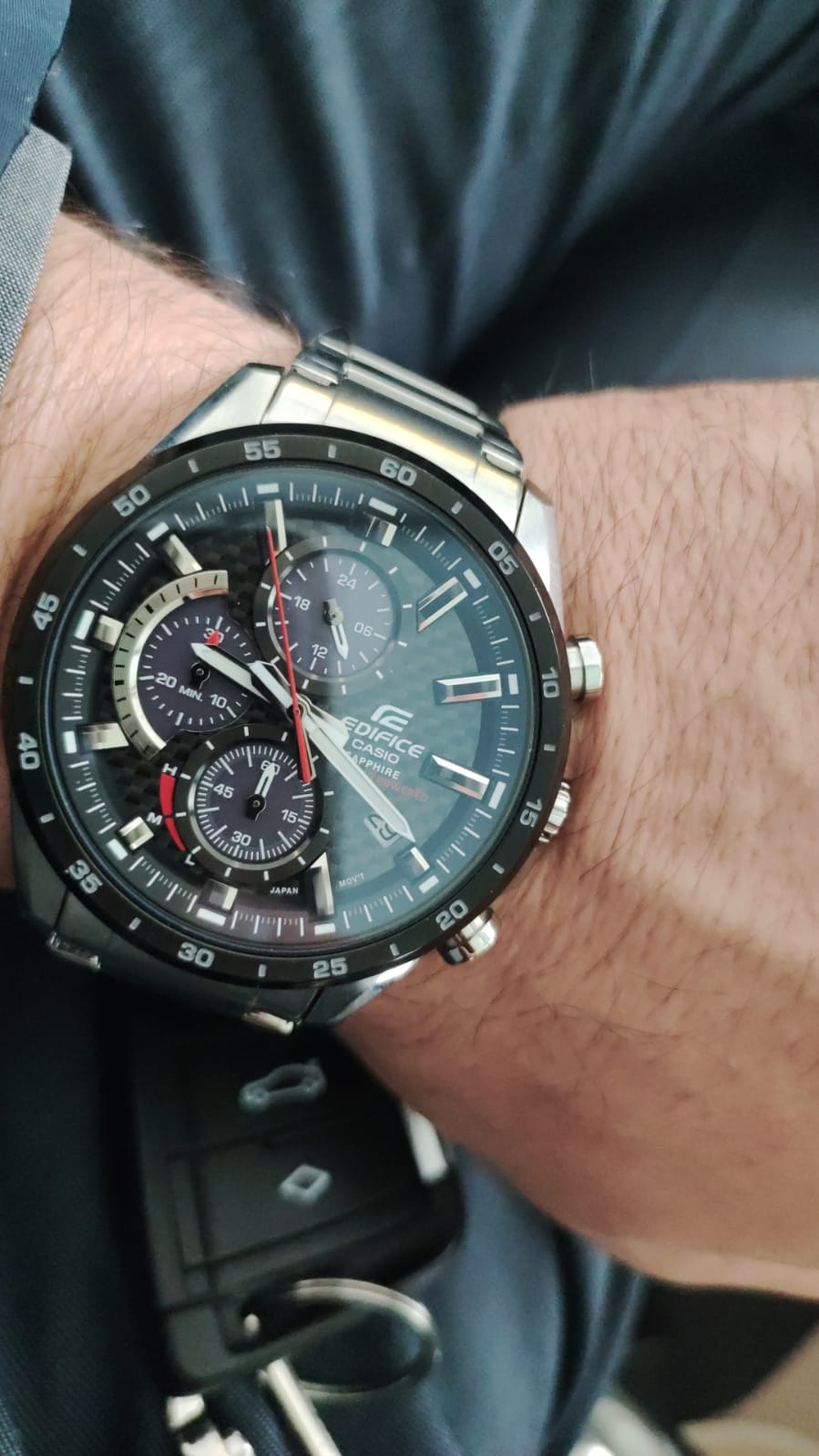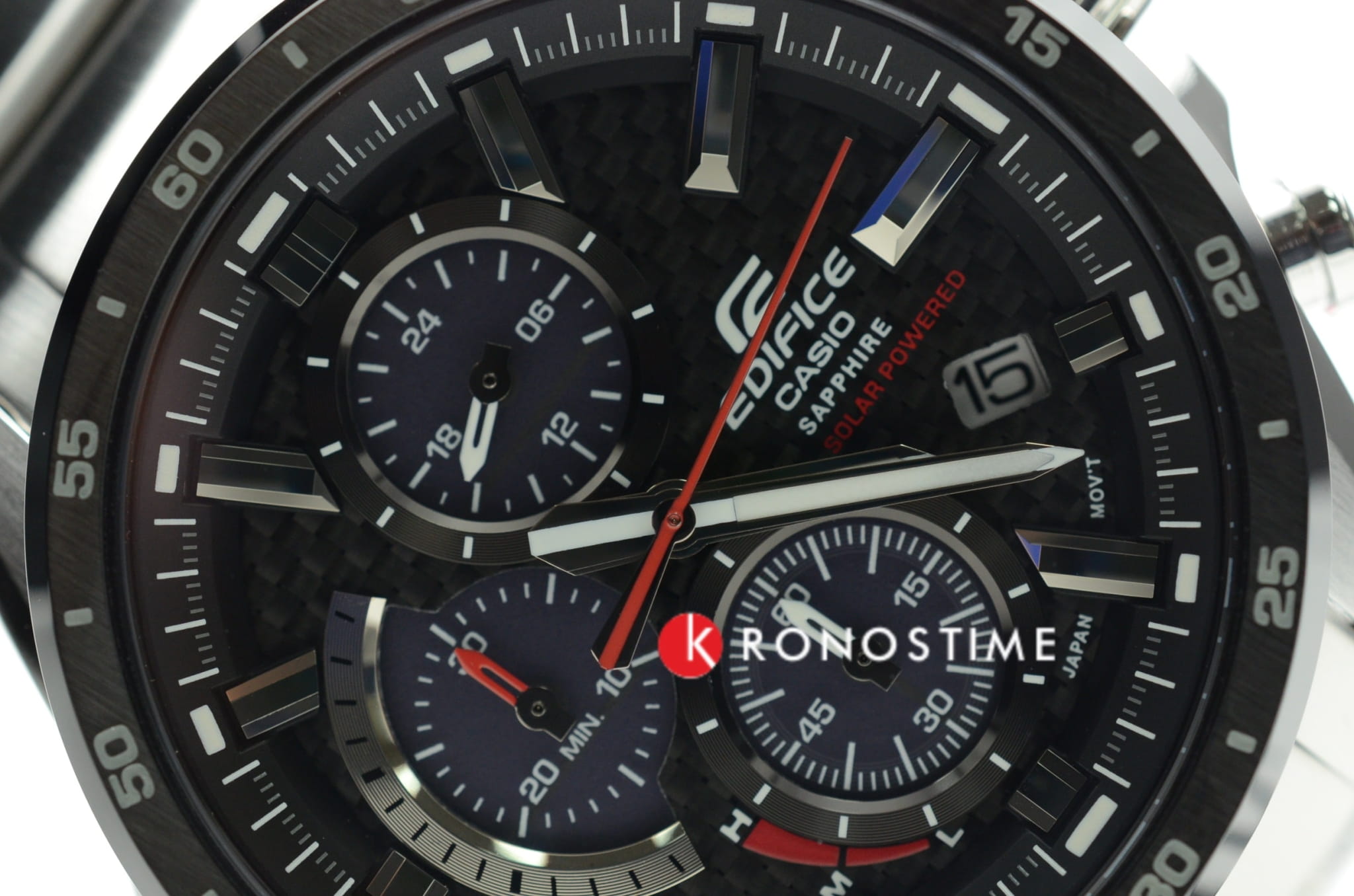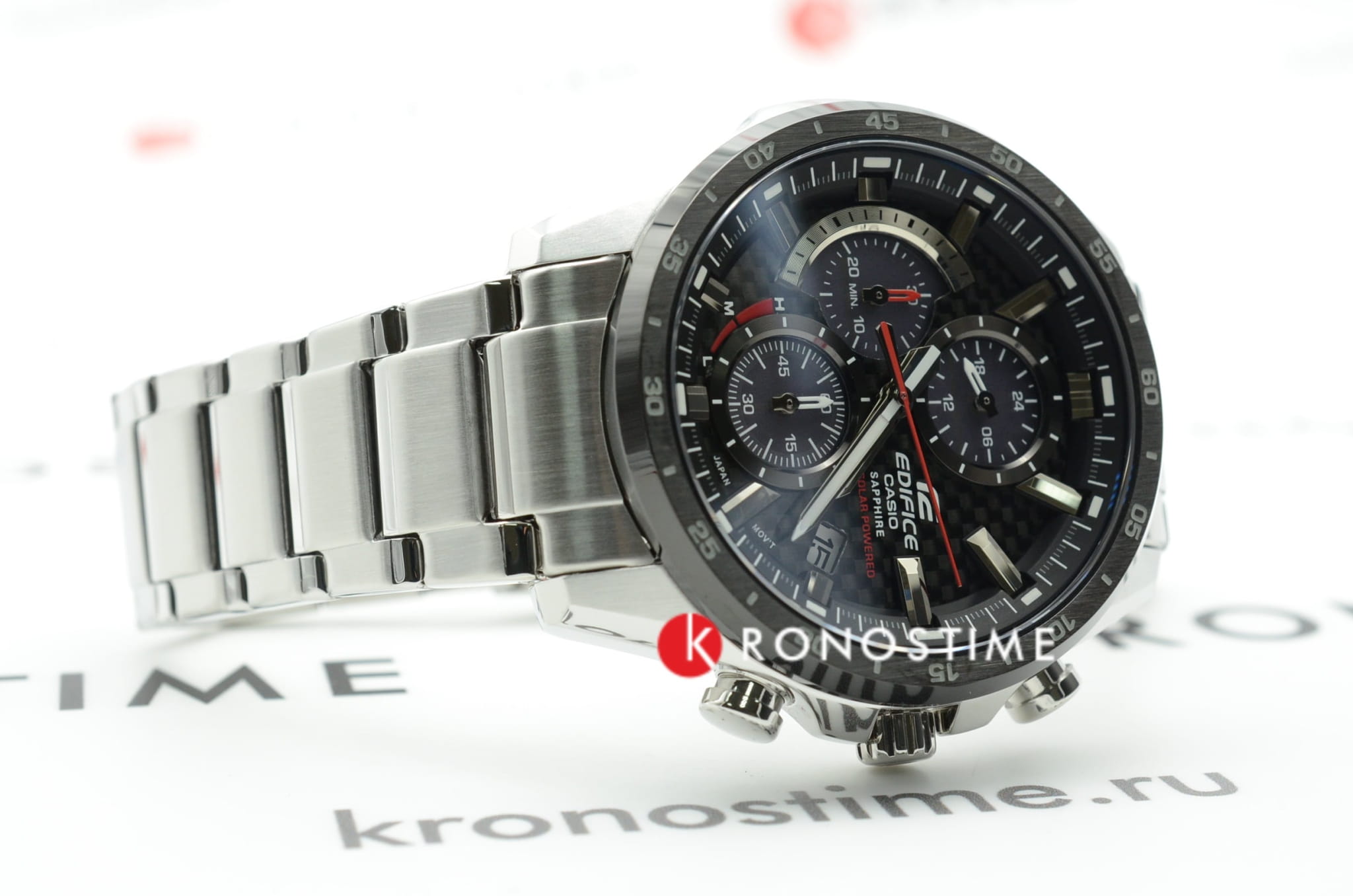Габаритные наручные часы станут ключевой деталью для повседневного образа, привлекательно выглядят элементы красного цвета. Интерес вызывает необычный тёмный циферблат, имеющий карбоновую текстуру, переплетённые волокна образуют оригинальный узор. Ударопрочный корпусУдаропрочный корпусМеханизм заключён в корпус, выполненный из современных материалов, устойчивых к ударам, механическим повреждениям и падению с высоты: инновационный пластик, карбон, нержавеющая сталь, титан. и браслет на раскладной застёжкеРаскладная застёжкаТакой тип застёжки используется только на браслетах из металла. Она никогда не раскрывается полностью, происходит разделение на 2 и более частей. Раскладывающая застёжка снизит вероятность потери часов к минимуму. сделаны из стали 316L с антикоррозионными свойствами, за счёт чего часы надолго сохранят безупречный внешний вид. Модель получает питание от солнечного света Tough SolarTough SolarТехнология основана на подзарядке аккумулятора от источника солнечного света, специальная панель улавливает солнечные лучи и преобразует их в энергию для работы часов. Достаточно пары минут нахождения на солнце для функционирования часов в течении суток., состояние заряда можно отслеживать благодаря наличию особого индикатора. БезельБезельВнешний ободок, закрепляющий стекло. В спортивных часах так называется поворотное кольцо с делениями на циферблате, выполняет роль таймера – замеряет отрезки времени на шкале. Неподвижный безель – элемент декора. Однонаправленно вращающийся безель на дайверских часах позволяет фиксировать моменты погружения и выныривания на поверхность. с чёрным IP-покрытиемIP-покрытиеМетод ионного напыления. Демонстрирует повышенную устойчивость к истиранию, окислению и химическим веществам. Под воздействием высокого давления и температуры около 1500°C молекулы металла надёжно соединяются с частицами корпуса часов.. Закручивающаяся крышка с резьбовым соединением. Водонепроницаемость 100 метров. Подсветка NeobriteПодсветка NeobriteИспользование светонакопительных составов на основе сульфида цинка или алюмината стронция, яркий свет можно наблюдать на протяжении 6-10 часов после «зарядки» часов около источника света.. Сапфировое стеклоСапфировое стеклоПрочный и надёжный материал из кристалла сапфира синтетического происхождения, характеризующийся особой твёрдостью и устойчивостью к царапинам и повреждениям.. Часы-хронографХронографФункция позволяет измерять отрезки времени с особой точностью: часы, минуты, секунды. Верным признаком хронографа является наличие на циферблате 3 дополнительных окошек-счётчиков. с секундомеромСекундомерСекундоме́р — прибор, способный измерять интервалы времени с точностью до долей секунды. с точностью показаний 1с и временем измерения 30мин. Габариты: 51,5 x 47,6 x 12 мм.