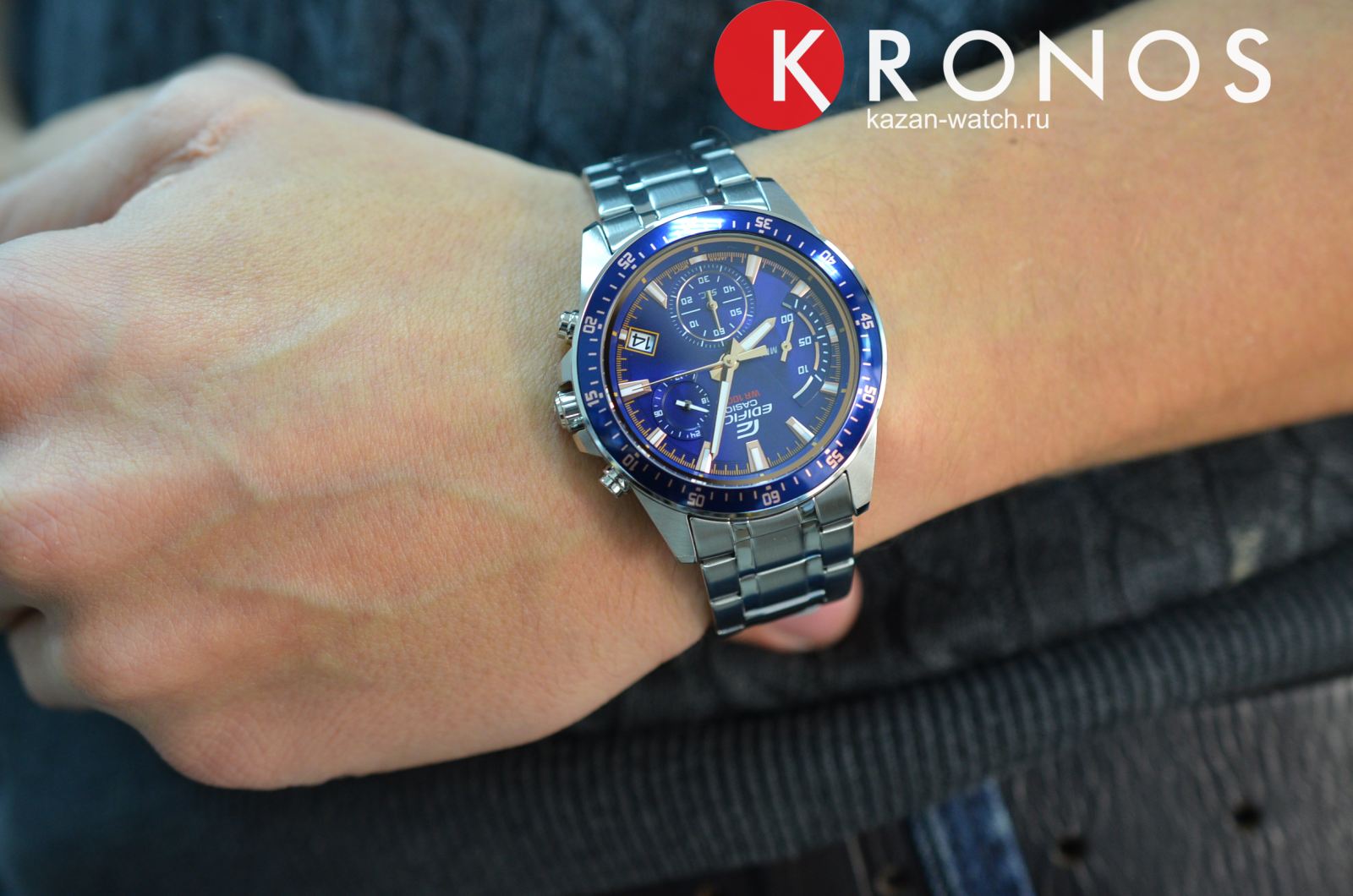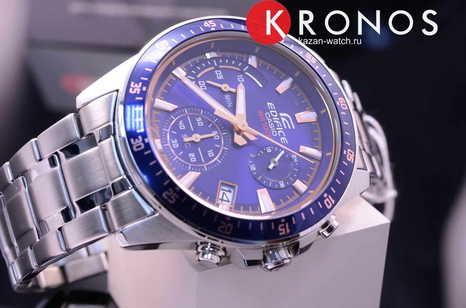 Мужские часы-хронографХронографФункция позволяет измерять отрезки времени с особой точностью: часы, минуты, секунды. Верным признаком хронографа является наличие на циферблате 3 дополнительных окошек-счётчиков. Casio Edifice EFV-540D-2A, кварцевый механизм с высокой точностью. Минеральное стеклоМинеральное стеклоМинеральное стекло представляет собой искусственно выращенный минерал кварца. Такое стекло отличается особой устойчивостью к повреждениям и царапинам. Уступает по некоторым качествам сапфировому стеклу. устойчивое к появлению царапин, обладающее высокой прозрачностью. СекундомерСекундомерСекундоме́р — прибор, способный измерять интервалы времени с точностью до долей секунды. с точностью показаний 1/10с и временем измерения 1ч. Корпус изготовлен из нержавеющей стали. БезельБезельВнешний ободок, закрепляющий стекло. В спортивных часах так называется поворотное кольцо с делениями на циферблате, выполняет роль таймера – замеряет отрезки времени на шкале. Неподвижный безель – элемент декора. Однонаправленно вращающийся безель на дайверских часах позволяет фиксировать моменты погружения и выныривания на поверхность. изготовлен из стали с IP-покрытиемIP-покрытиеМетод ионного напыления. Демонстрирует повышенную устойчивость к истиранию, окислению и химическим веществам. Под воздействием высокого давления и температуры около 1500°C молекулы металла надёжно соединяются с частицами корпуса часов.. Светонакопительное покрытие NeobriteПодсветка NeobriteИспользование светонакопительных составов на основе сульфида цинка или алюмината стронция, яркий свет можно наблюдать на протяжении 6-10 часов после «зарядки» часов около источника света. продолжает светиться в темноте даже после непродолжительного пребывания на свету. Окошко даты находится в положении 4 часов. Класс водозащиты: 100 метров, позволит плавать, нырять и заниматься другими водными видами спорта. Заводная головка с защитой. Кожаный ремешок на стандартной застежке. Стальной браслет на раскладной застёжкеРаскладная застёжкаТакой тип застёжки используется только на браслетах из металла. Она никогда не раскрывается полностью, происходит разделение на 2 и более частей. Раскладывающая застёжка снизит вероятность потери часов к минимуму..