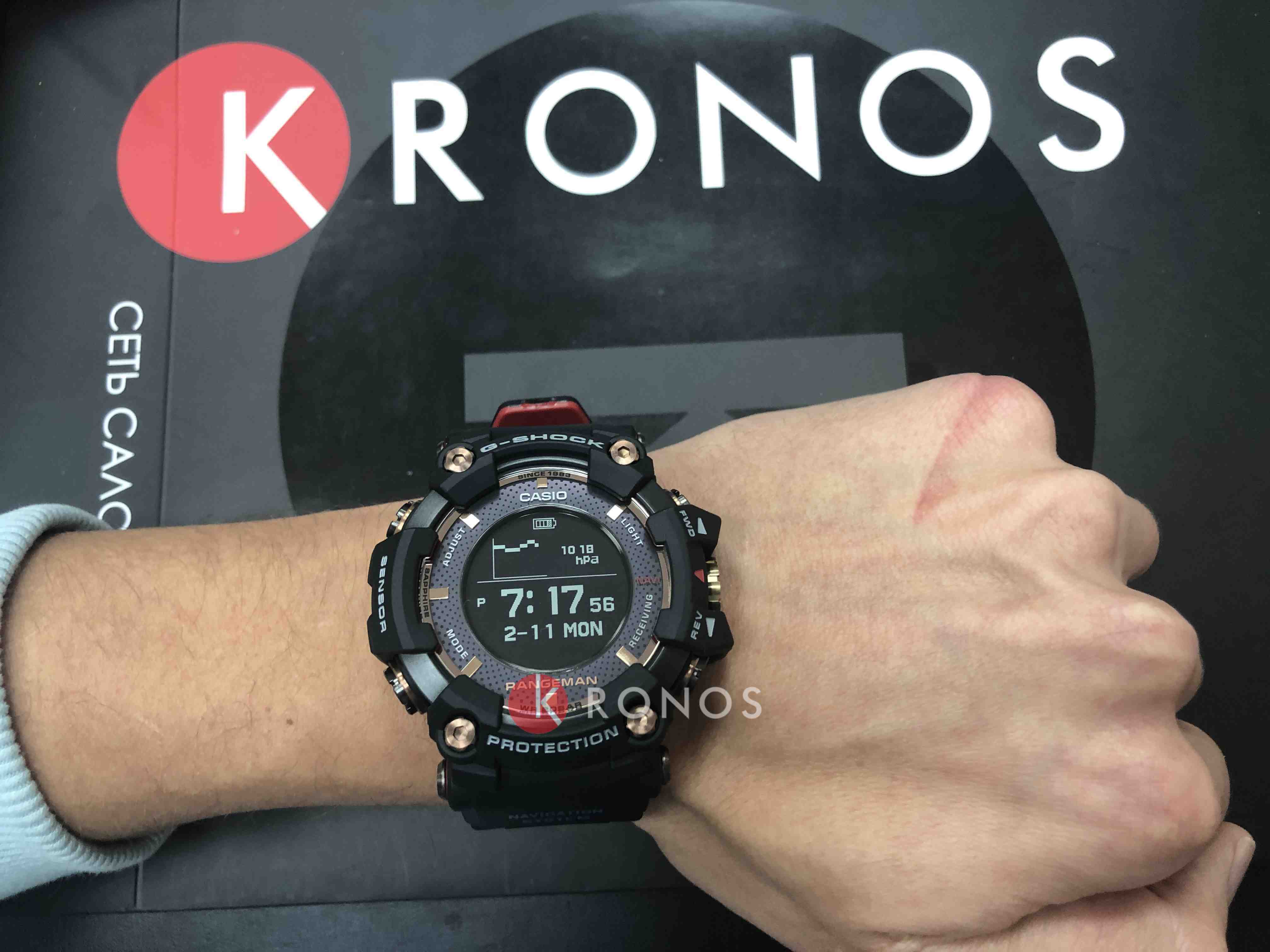 Дизайн отсылается к опасным и завораживающим потокам лавы, цветовая палитра выражена в чёрном, красном, золотом оттенках. Модель выдержит любые погодные условия и температуру до -20°C, ей не страшны удары, вибрации и падения с высоты. Массивные и брутальные часы стильно смотрятся на руке, не вызывая дискомфорта при ношении. Идеальным дополнением стал ремешок из карбона и полимера cо внутренней стороной красного цвета. Аксессуар станет универсальным помощником в путешествиях и походах, ведь в вашем распоряжении появляется множество функций: цифровой компас, хронографХронографФункция позволяет измерять отрезки времени с особой точностью: часы, минуты, секунды. Верным признаком хронографа является наличие на циферблате 3 дополнительных окошек-счётчиков., будильник, барометр, высотомер, лунный календарь, GPS, термометр, Bluetooth-синхронизацияBluetoothСовременная технология, позволяющая синхронизировать часы с телефоном и переносить данные. Часы с Bluetooth расширяют возможности вашего смартфона и делают его использование ещё более удобным., а также функция энергосбережения. Стальной безельБезельВнешний ободок, закрепляющий стекло. В спортивных часах так называется поворотное кольцо с делениями на циферблате, выполняет роль таймера – замеряет отрезки времени на шкале. Неподвижный безель – элемент декора. Однонаправленно вращающийся безель на дайверских часах позволяет фиксировать моменты погружения и выныривания на поверхность. с IP-покрытиемIP-покрытиеМетод ионного напыления. Демонстрирует повышенную устойчивость к истиранию, окислению и химическим веществам. Под воздействием высокого давления и температуры около 1500°C молекулы металла надёжно соединяются с частицами корпуса часов.. Технология . Стекло из сапфира с антибликовым покрытием. Подсветка циферблата. Водостойкость 200 метров. Габариты: 60,3 x 57,7 x 20,2 мм.
