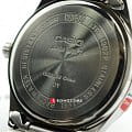 Сдержанный цветовой дизайн модели выдержан в серебристом и черном цвете. Стальной браслет имеет раскладывающуюся застежку, состоит из нескольких звеньев и прочно закреплен с корпусом из латуни. Аккуратные временные отметки сделаны в виде штрихов. На стрелки нанесено светящееся необритовое покрытие. В качестве полезной особенности на циферблате имеется календарь. Водонепроницаемость часов равна 50WR. Тип механизма — кварцевый.