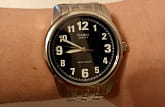 Сдержанный дизайн ориентирован на удобство и универсальность в ношении аксессуара. Благодаря крупным белым цифрам на черном циферблате, определить время не составит труда. Подсветка NeobriteПодсветка NeobriteИспользование светонакопительных составов на основе сульфида цинка или алюмината стронция, яркий свет можно наблюдать на протяжении 6-10 часов после «зарядки» часов около источника света. обеспечивает видимость показателей в темноте. Аккуратный латунный корпус надежно соединен с браслетом из нержавеющей стали. Раскладывающаяся застежка прочно обхватывает запястье и сводит к минимуму потерю аксессуара. Тип механизма - кварцевый. Батарейка служит 3 года. Вес аксессуара равен 91 граммам.