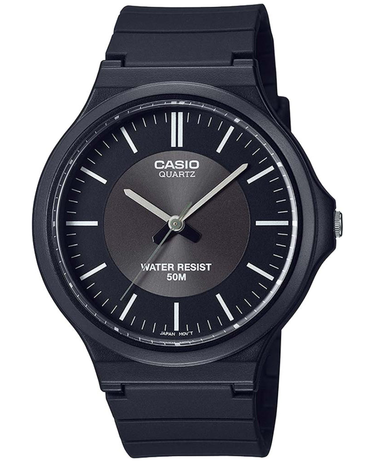 Японские мужские часы в спортивном стиле Casio Collection MW-240-1E3, кварцевый механизм с высокой точностью. Класс водозащиты: 50 метров, позволит защитить корпус от случайных брызг или капель дождя. Корпус часов изготовлен из пластика, черного цвета.