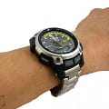 Многофункциональные часы с противоударной конструкцией и хорошей водозащитой. Часы работают на солнечных элементах. Cветодиодная подсветка автоматически включается при тусклом, темном свете и отключается при хорошем освещении. Часы рассчитаны на работу при температуре ниже нуля. В режиме "Мировое время" можно просмотреть местное время в некоторых основных городах и определенных регионах мира. В режиме Секундомера можно фиксировать отдельные отрезки времени с точностью показаний 1/100 сек и временем измерения 24 часа. Часы оснащены цифровым компасом, альтиметром, барометром, датчиком температуры. Альтиметр – датчик барометрического давления с выводом результата в единицах высоты над уровнем моря. Максимальная высота измерения – 10000 метров над уровнем моря. Индикатор уровня заряда элемента питания. Календарь автоматический: автоматически учитываются месяцы разной продолжительности и високосные годы. Габаритные размеры - 56,8х49,3х14,3. Вес 113г.
