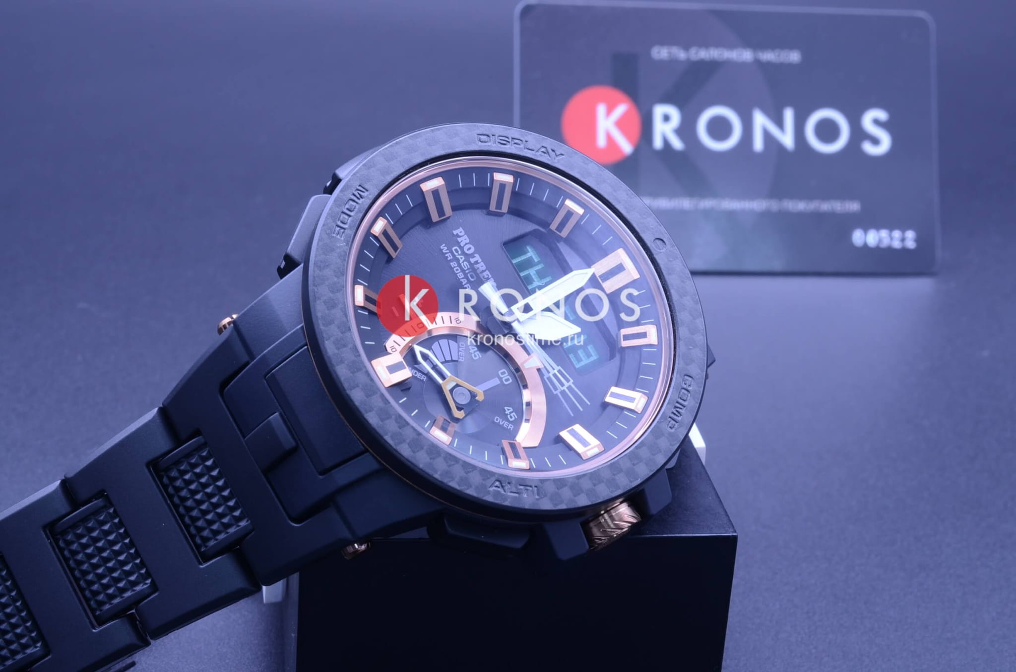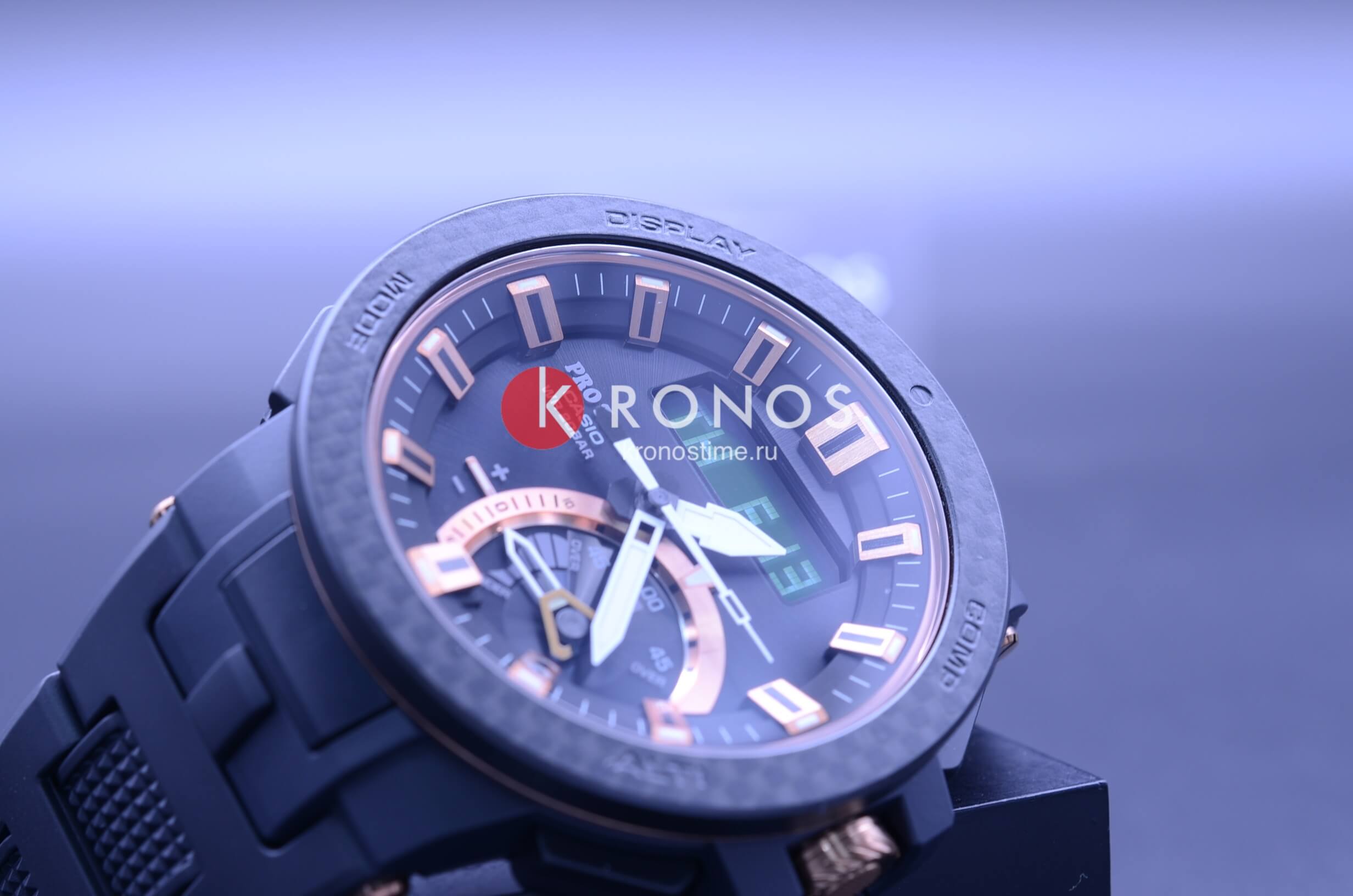 Перед вами лимитированная модель PRO TREK из серии PRW-7000 в черном корпусе с деталями цвета розового золота и карбоновым безелем вокруг аналого-цифрового циферблата Модель на композитном браслете визуально выглядит массивно но на деле очень легкая и это действительно фантастика, лимитированная модель выпущена ограниченным тиражом в 1300 экземпляров на весь мир, в Россию поступили несколько экземпляров