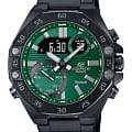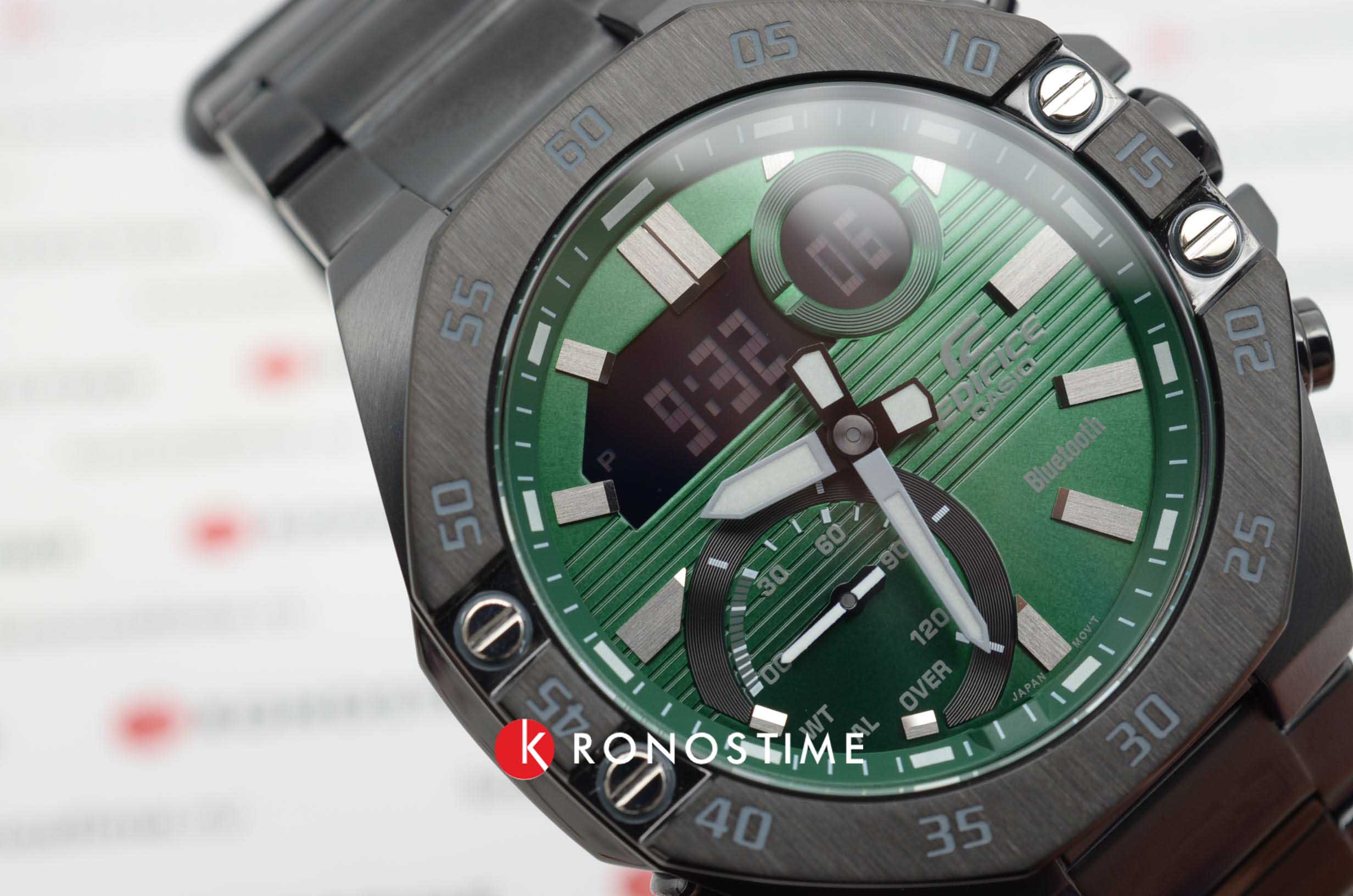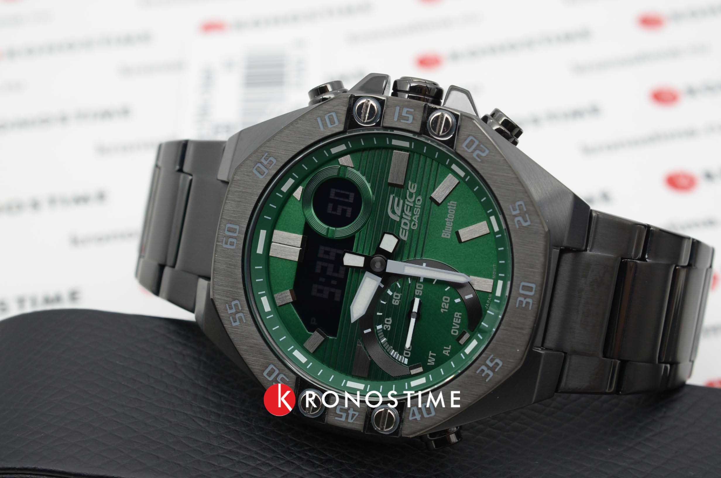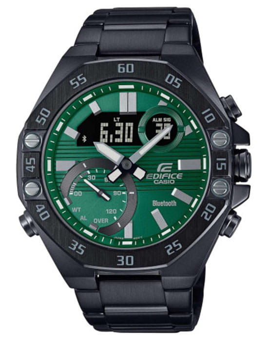 Casio Edifice ECB-10DC-3A – современные мужские часы, сочетающие спортивный дизайн и передовые технологии. Корпус размером 51×48,5 мм и толщиной 12,5 мм выполнен из нержавеющей стали с IP-покрытиемIP-покрытиеМетод ионного напыления. Демонстрирует повышенную устойчивость к истиранию, окислению и химическим веществам. Под воздействием высокого давления и температуры около 1500°C молекулы металла надёжно соединяются с частицами корпуса часов. чёрного цвета, обеспечивая прочность и устойчивость к коррозии. Зелёный циферблат с аналогово-цифровым отображением времени защищён минеральным стекломМинеральное стеклоМинеральное стекло представляет собой искусственно выращенный минерал кварца. Такое стекло отличается особой устойчивостью к повреждениям и царапинам. Уступает по некоторым качествам сапфировому стеклу., устойчивым к царапинам.