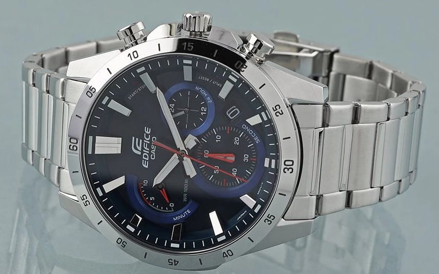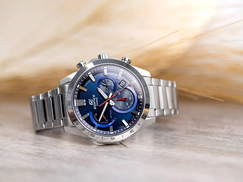 Мужские японские часы-хронографХронографФункция позволяет измерять отрезки времени с особой точностью: часы, минуты, секунды. Верным признаком хронографа является наличие на циферблате 3 дополнительных окошек-счётчиков. Casio Edifice EFR-573D-2A, кварцевый механизм с высокой точностью. Класс водозащиты: 100 метров, позволит плавать, нырять и заниматься другими водными видами спорта. Корпус часов изготовлен из стали. Крупные индексные метки и встроенные циферблаты дополняют обтекаемый дизайн с холодным синим циферблатом и раскаленными стрелками для придания дополнительного спортивного стиля. Динамичный мужской аксессуар подтолкнет вас на покорение новых высот. Подсветка NeobriteПодсветка NeobriteИспользование светонакопительных составов на основе сульфида цинка или алюмината стронция, яркий свет можно наблюдать на протяжении 6-10 часов после «зарядки» часов около источника света. обеспечивает длительное послесвечение в темноте даже после кратковременного нахождения на свету. Часы-хронографХронографФункция позволяет измерять отрезки времени с особой точностью: часы, минуты, секунды. Верным признаком хронографа является наличие на циферблате 3 дополнительных окошек-счётчиков. с секундомеромСекундомерСекундоме́р — прибор, способный измерять интервалы времени с точностью до долей секунды. с разрешением показаний 1с и временем измерения 10мин. 12-ти и 24-х часовой формат времени. Окошко даты. Ретроградный указатель минутной стрелки хронографаХронографФункция позволяет измерять отрезки времени с особой точностью: часы, минуты, секунды. Верным признаком хронографа является наличие на циферблате 3 дополнительных окошек-счётчиков.. Завинчивающаяся задняя крышка. Рифленая заводная головка с защитой. Стальной браслет на раскладной застёжкеРаскладная застёжкаТакой тип застёжки используется только на браслетах из металла. Она никогда не раскрывается полностью, происходит разделение на 2 и более частей. Раскладывающая застёжка снизит вероятность потери часов к минимуму., расстегиваемая одним касанием.