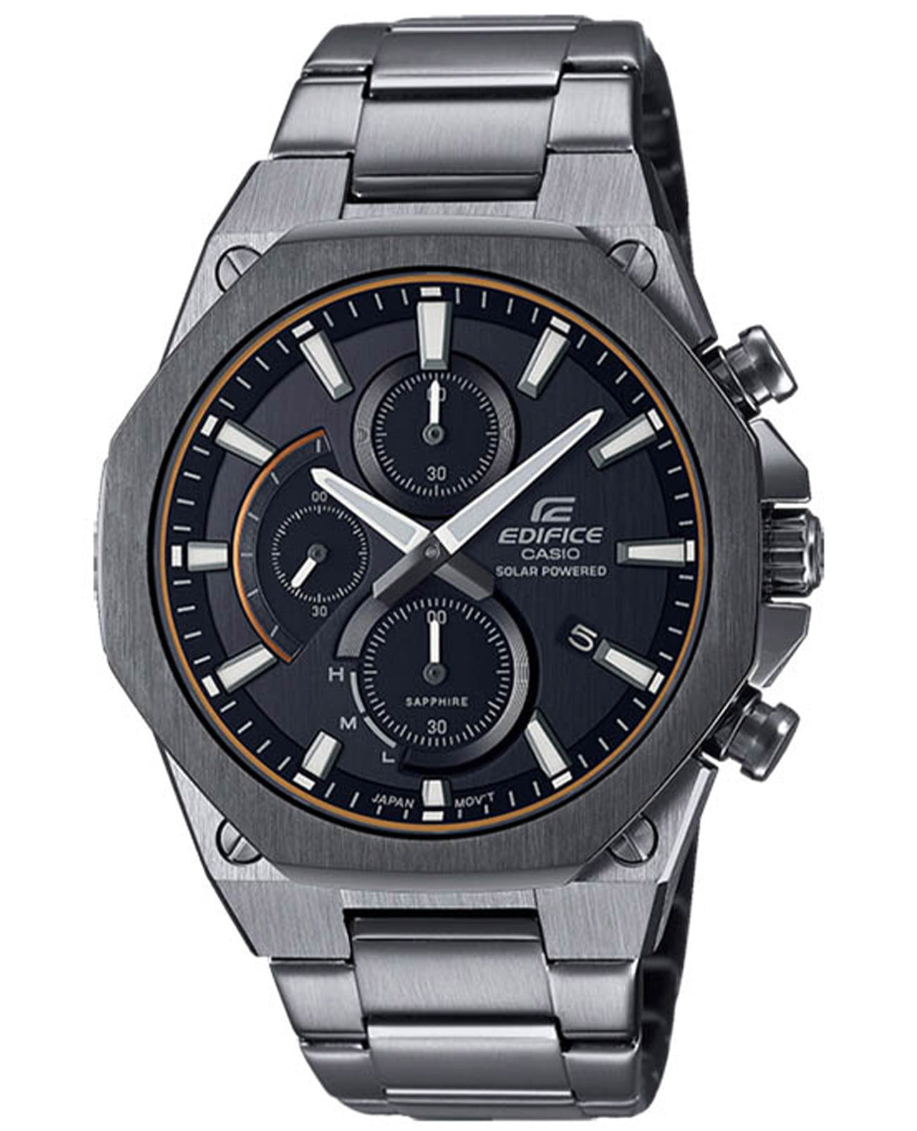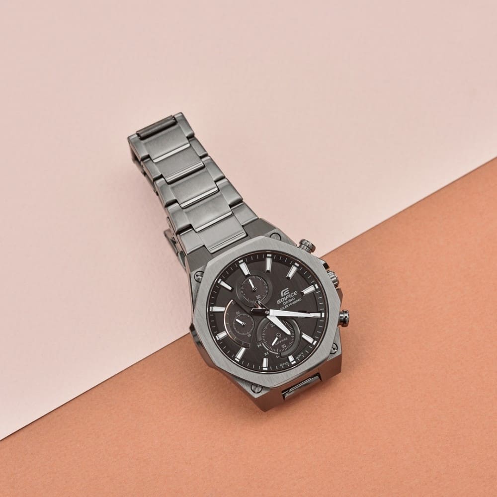 Японские мужские часы Casio Edifice EFS-S570DC-1A из коллекции Edifice раскрывают автомобильную тематику и универсальность. Наручные часы в сером исполнении привлекают контрастными бронзовыми деталями и лаконичным оформлением. Помогут идеально дополнить образ на каждый день. Аксессуар стал обладателем ультратонкого корпуса, по сравнению с большинством представителей Edifice – 9,7 мм. Модель изготовлена из стали 316L, материал устойчив к коррозии и механическим воздействиям. Японский кварцевый механизм обеспечивает питанием солнечная батарейка . Указатель минутной стрелки хронографаХронографФункция позволяет измерять отрезки времени с особой точностью: часы, минуты, секунды. Верным признаком хронографа является наличие на циферблате 3 дополнительных окошек-счётчиков. на секторной части циферблата. Сапфировое стекло с антибликовым покрытием. Водостойкость 100 метров. Люминесцентная подсветкаЛюминесцентное покрытиеПозволяет считывать показания времени в темноте. Производители наносят на стрелки, часовые индексы, безель или поверхность циферблата светонакопительный состав, дающий холодное свечение.. Застёжка с системой блокировки. Секундомер, отображение числа. Габариты: 49 x 44 x 9,7 мм.