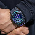 Аналого-цифровая модель с бирюзовыми и фиолетовыми акцентами обладает внушительным противоударным корпусомУдаропрочный корпусМеханизм заключён в корпус, выполненный из современных материалов, устойчивых к ударам, механическим повреждениям и падению с высоты: инновационный пластик, карбон, нержавеющая сталь, титан. с рифлеными кнопками. Привлекательно выглядят крупные детали, и стрелки с перфорацией. Аксессуар "Three-eye" с 3 счётчиками в верхней части циферблата оснащается высокоточным японским кварцевым механизмом. Батарейка рассчитана на 2 года. 12-ти и 24-х часовой формат отображения времени. Светодиодная подсветкаСветодиодная подсветкаСветодиодная или LED-подсветка обеспечивает появление яркого холодного свечения за счёт LED-элементов - маленьких лампочек. Они потребляют минимальное количество энергии, чаще всего можно встретить 1 светодиод, в нижней части циферблата. циферблата. Устойчивость к магнитным полям. Минеральное стекло. Функции: секундомер, расчёт скорости по указанной дистанции, таймер с автоповтором, , мировое времяМировое время Полезное часовое усложнение, отображающее время в основных городах и известных областях по всему миру, оно связано с часовыми поясами, удобно для путешественников и бизнесменов. , будильник, календарь до 2099 года, хронографХронографФункция позволяет измерять отрезки времени с особой точностью: часы, минуты, секунды. Верным признаком хронографа является наличие на циферблате 3 дополнительных окошек-счётчиков.. Габариты: 55 x 51,2 x 16,9 мм.