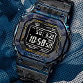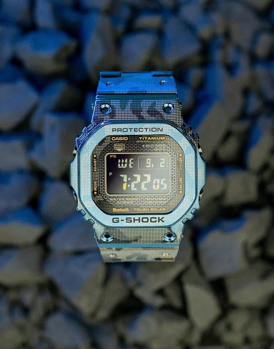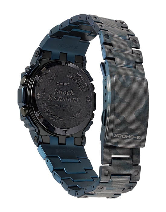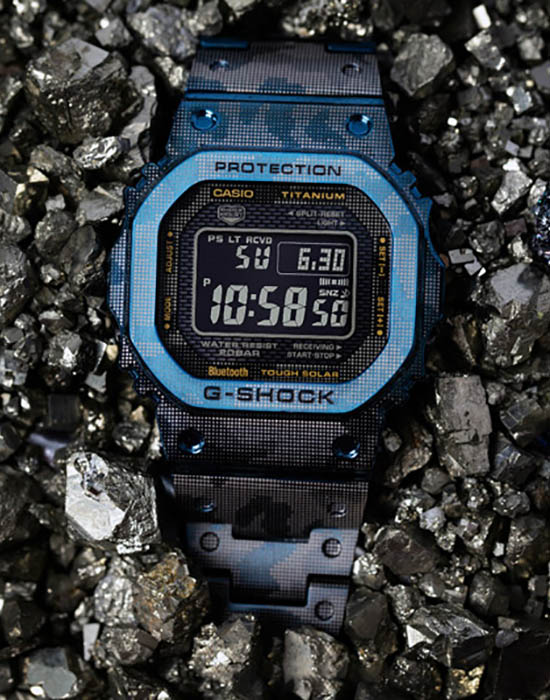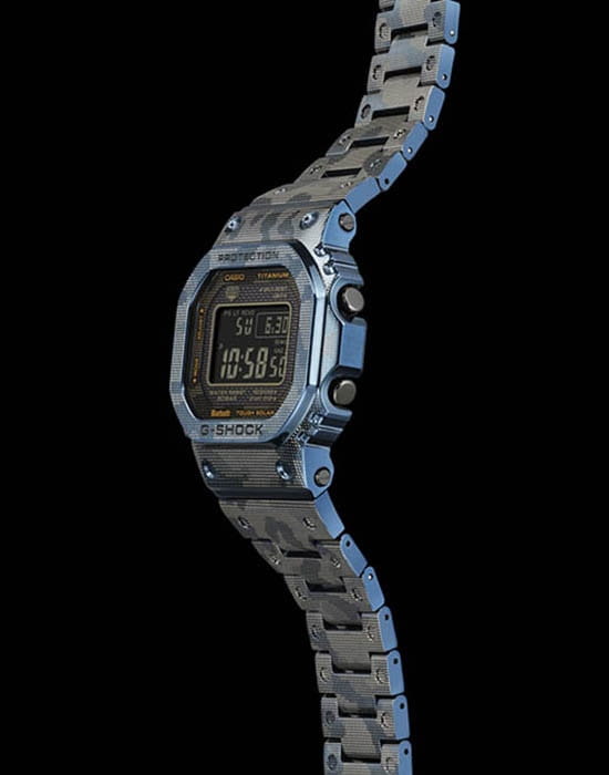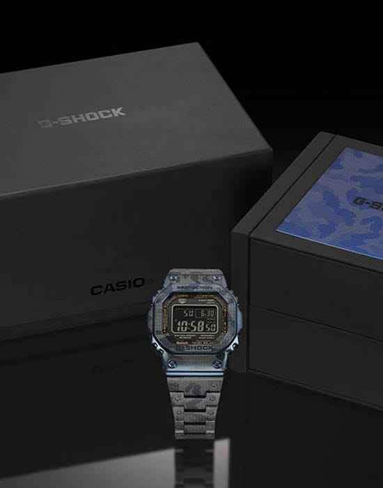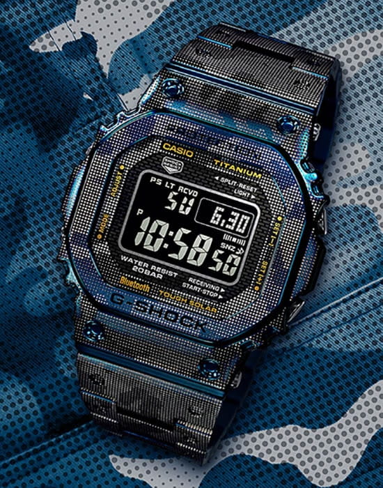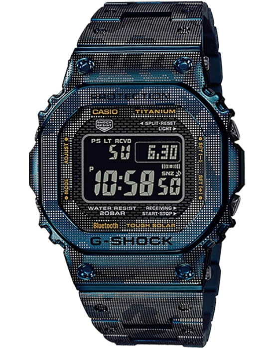 Мужские японские часы Limited Edition из коллекции G-shock относятся к премиальным моделям, представляя собой оригинальное сочетание ударопрочных характеристик и камуфляжного дизайна. Выпущены ограниченным тиражом в 500 экземпляров на весь мир. Для наручных часов в необычном «военном» исполнении была использована особая лазерная технология точечного нанесения рисунка. Легендарный 8-угольный ударопрочный корпусУдаропрочный корпусМеханизм заключён в корпус, выполненный из современных материалов, устойчивых к ударам, механическим повреждениям и падению с высоты: инновационный пластик, карбон, нержавеющая сталь, титан. и браслет сделаны из титана с IP-покрытиемIP-покрытиеМетод ионного напыления. Демонстрирует повышенную устойчивость к истиранию, окислению и химическим веществам. Под воздействием высокого давления и температуры около 1500°C молекулы металла надёжно соединяются с частицами корпуса часов., материал отличается устойчивостью к магнитным полям и перепадам температуры, не вызывает аллергии даже на чувствительной коже. Поверхность имеет DLC-покрытиеDLC-покрытиеDiamond like carbon - одно из лучших видов покрытия, представляющее собой углерод с алмазными свойствами. На поверхность материала наносятся распавшиеся молекулы углерода, превращающиеся в плёнку из алмазоподобных связей, которая перенимает твёрдость алмаза., защищающее от царапин и повреждений. Для полной ударопрочности конструкции дополнительно применили слой материала Alpha Gel®. Технология , индикатор состояния заряда батареи. Сапфировое стекло с антибликовым покрытием. Светодиодная подсветкаСветодиодная подсветкаСветодиодная или LED-подсветка обеспечивает появление яркого холодного свечения за счёт LED-элементов - маленьких лампочек. Они потребляют минимальное количество энергии, чаще всего можно встретить 1 светодиод, в нижней части циферблата.. Сохранение водонепроницаемости при давлении до 20 бар. Bluetooth-синхронизация со смартфономBluetoothСовременная технология, позволяющая синхронизировать часы с телефоном и переносить данные. Часы с Bluetooth расширяют возможности вашего смартфона и делают его использование ещё более удобным., функция поиска телефона. Секундомер, таймер, автоматический календарь, мировое времяМировое время Полезное часовое усложнение, отображающее время в основных городах и известных областях по всему миру, оно связано с часовыми поясами, удобно для путешественников и бизнесменов. .