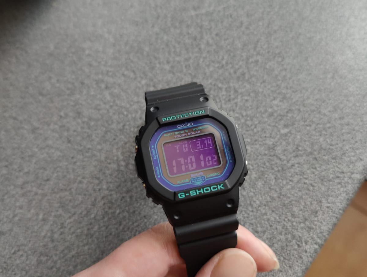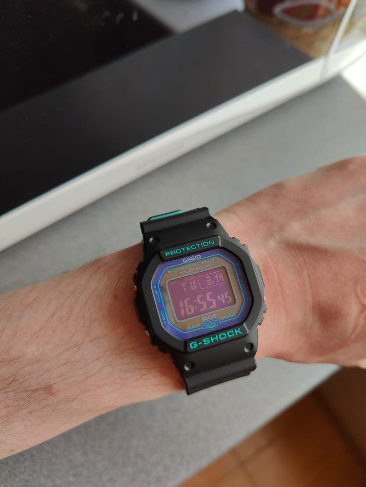 Модель сделана в цветовом оформлении духа 90-х, она имеет классический для часов Casio 8-угольный противоударный корпусУдаропрочный корпусМеханизм заключён в корпус, выполненный из современных материалов, устойчивых к ударам, механическим повреждениям и падению с высоты: инновационный пластик, карбон, нержавеющая сталь, титан., благодаря которому дизайн приобретает узнаваемые черты. Аксессуар выполнен из полимерного материала, устойчивого к ударам, повреждениям, вибрации, падению. Синхронизация времени и настройка функций осуществляется с помощью технологии BluetoothBluetoothСовременная технология, позволяющая синхронизировать часы с телефоном и переносить данные. Часы с Bluetooth расширяют возможности вашего смартфона и делают его использование ещё более удобным., управление возможностями происходит в приложении на телефоне G-Shock Connected. Японский кварцевый калибр. Питание от солнечного света . Автоматический переход в режим сохранения энергии для экономии расхода батареи. Минеральное стекло. Электролюминесцентная подсветкаЭлектролюминесцентная подсветкаЭлектролюминесцентная панель устанавливается под ЖК-экраном часов, при нажатии кнопки электричество преобразуется в свет за счёт подачи напряжения на атомы фосфора, такой тип подсветки позволяет освещать весь циферблат.. Водонепроницаемость до 200 метров. Секундомер, коррекция текущего времени радиосигналом, таймер, хронографХронографФункция позволяет измерять отрезки времени с особой точностью: часы, минуты, секунды. Верным признаком хронографа является наличие на циферблате 3 дополнительных окошек-счётчиков., будильник, мировое времяМировое время Полезное часовое усложнение, отображающее время в основных городах и известных областях по всему миру, оно связано с часовыми поясами, удобно для путешественников и бизнесменов. , календарь. Габариты: 48,9 x 42,8 x 13,4 мм.