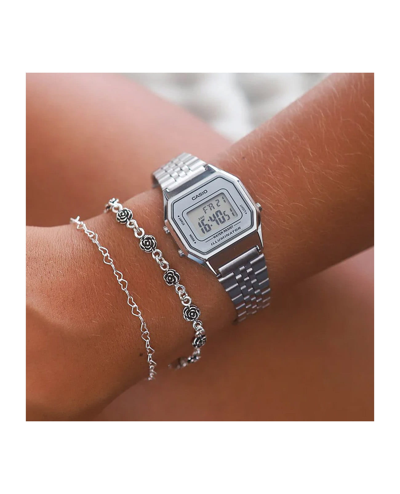 Японские женские часы-хронографХронографФункция позволяет измерять отрезки времени с особой точностью: часы, минуты, секунды. Верным признаком хронографа является наличие на циферблате 3 дополнительных окошек-счётчиков. с органическим стеклом Casio Vintage LA680WA-7DF, кварцевый механизм с высокой точностью. Корпус часов изготовлен из пластика. СекундомерСекундомерСекундоме́р — прибор, способный измерять интервалы времени с точностью до долей секунды. с точностью измерения 1/100 секунды и измерением 1 ч. 12-ти и 24-х часовой формат времени. БудильникБудильникБуди́льник — часы, в заданный момент времени подающие звуковой, световой и/или в редких случаях другой сигнал., ежечасный сигнал. Автоматический календарь: число, день недели. Батарея рассчитана на 5 лет. Класс водозащиты: 30 метров, позволит защитить корпус от случайных брызг или капель дождя. Стальной браслет на раскладной застёжкеРаскладная застёжкаТакой тип застёжки используется только на браслетах из металла. Она никогда не раскрывается полностью, происходит разделение на 2 и более частей. Раскладывающая застёжка снизит вероятность потери часов к минимуму..