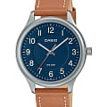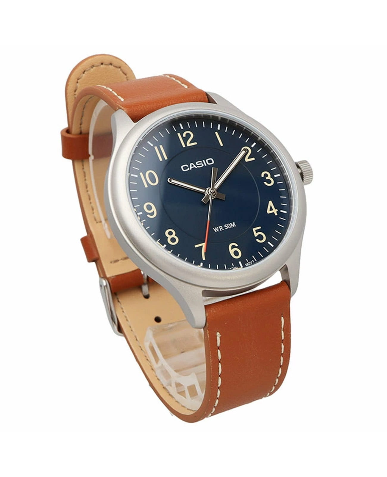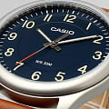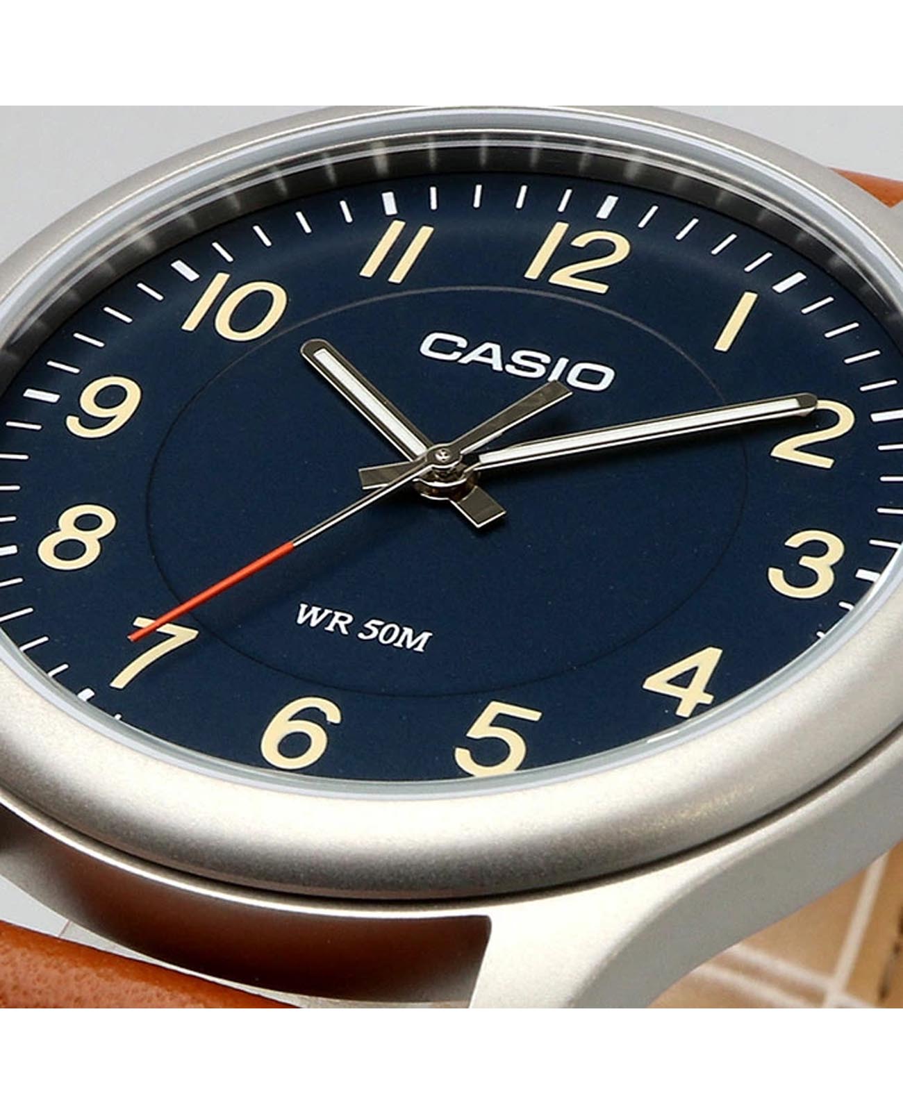 Японские мужские часы Casio Collection MTP-B160L-2BV с минеральным стекломМинеральное стеклоМинеральное стекло представляет собой искусственно выращенный минерал кварца. Такое стекло отличается особой устойчивостью к повреждениям и царапинам. Уступает по некоторым качествам сапфировому стеклу., устойчивым к мелким механическим повреждениям. Корпус часов изготовлен из нержавеющей стали. Стрелки с люминесцентным покрытиемЛюминесцентное покрытиеПозволяет считывать показания времени в темноте. Производители наносят на стрелки, часовые индексы, безель или поверхность циферблата светонакопительный состав, дающий холодное свечение.. Задняя крышка с винтовым фиксатором. Батарейка рассчитана на 3 года. Класс водозащиты: 50 метров, позволит защитить корпус от случайных брызг или капель дождя. Кожаный ремешок на стандартной застежке.