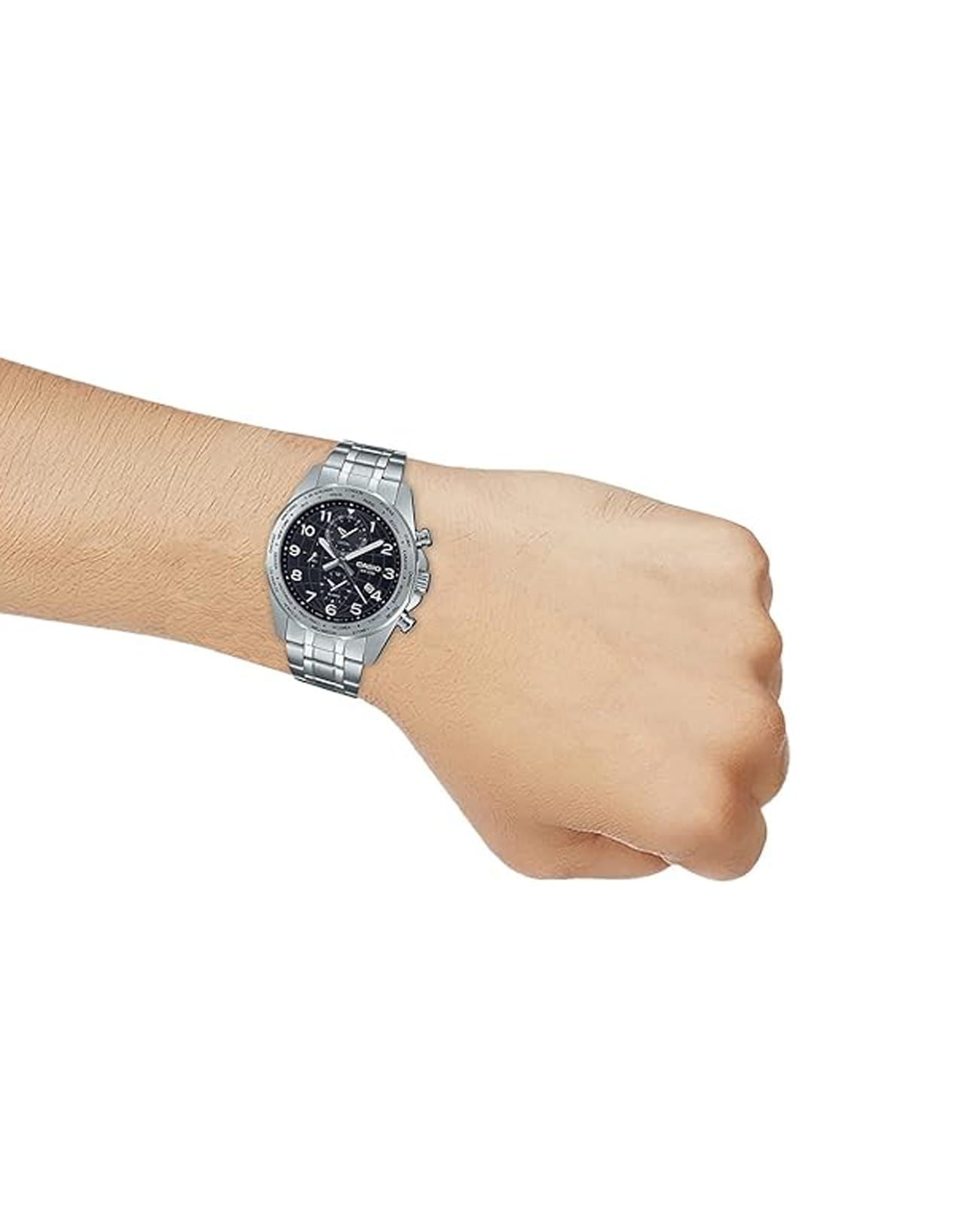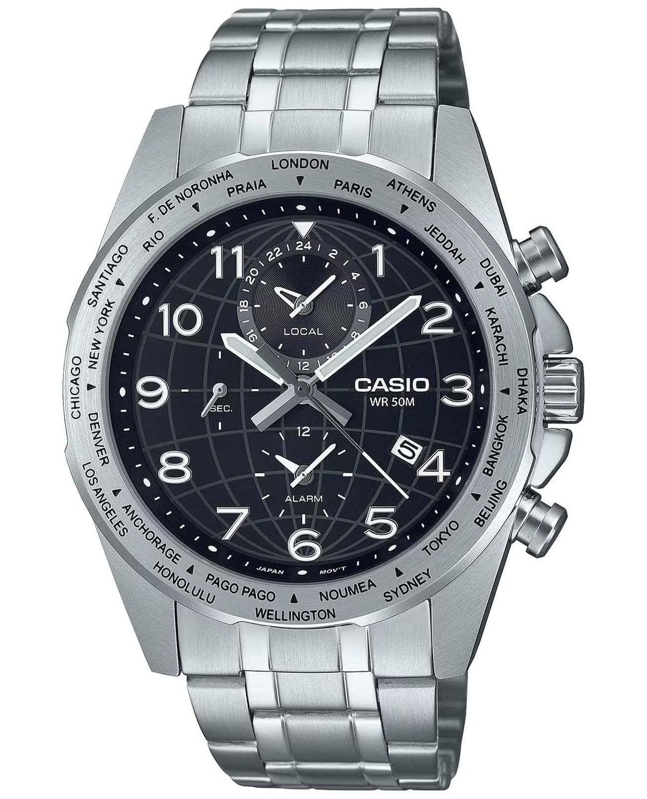 Японские мужские часы-хронографХронографФункция позволяет измерять отрезки времени с особой точностью: часы, минуты, секунды. Верным признаком хронографа является наличие на циферблате 3 дополнительных окошек-счётчиков. с секундомеромСекундомерСекундоме́р — прибор, способный измерять интервалы времени с точностью до долей секунды. Casio Collection MTP-W500D-1A, кварцевый механизм с высокой точностью. Класс водозащиты: 50 метров, позволит защитить корпус от случайных брызг или капель дождя. Корпус и браслет часов изготовлены из стали. Удобное отображение времени домашнего часового пояса и мирового времениМировое время Полезное часовое усложнение, отображающее время в основных городах и известных областях по всему миру, оно связано с часовыми поясами, удобно для путешественников и бизнесменов. (24 города - 24 зоны) позволяет ориентироваться при путешествиях. Браслет с раскладной застёжкойРаскладная застёжкаТакой тип застёжки используется только на браслетах из металла. Она никогда не раскрывается полностью, происходит разделение на 2 и более частей. Раскладывающая застёжка снизит вероятность потери часов к минимуму.. БудильникБудильникБуди́льник — часы, в заданный момент времени подающие звуковой, световой и/или в редких случаях другой сигнал./ежечасный сигнал. Минеральное стеклоМинеральное стеклоМинеральное стекло представляет собой искусственно выращенный минерал кварца. Такое стекло отличается особой устойчивостью к повреждениям и царапинам. Уступает по некоторым качествам сапфировому стеклу. устойчивое к мелким механическим повреждениям. Центральные часовая, минутная и секундная стрелки. Индикатор низкого заряда батареи. Синий циферблат с часовыми индексами в виде штрихов и цифр. Стрелки и метки с люминесцентным покрытиемЛюминесцентное покрытиеПозволяет считывать показания времени в темноте. Производители наносят на стрелки, часовые индексы, безель или поверхность циферблата светонакопительный состав, дающий холодное свечение..