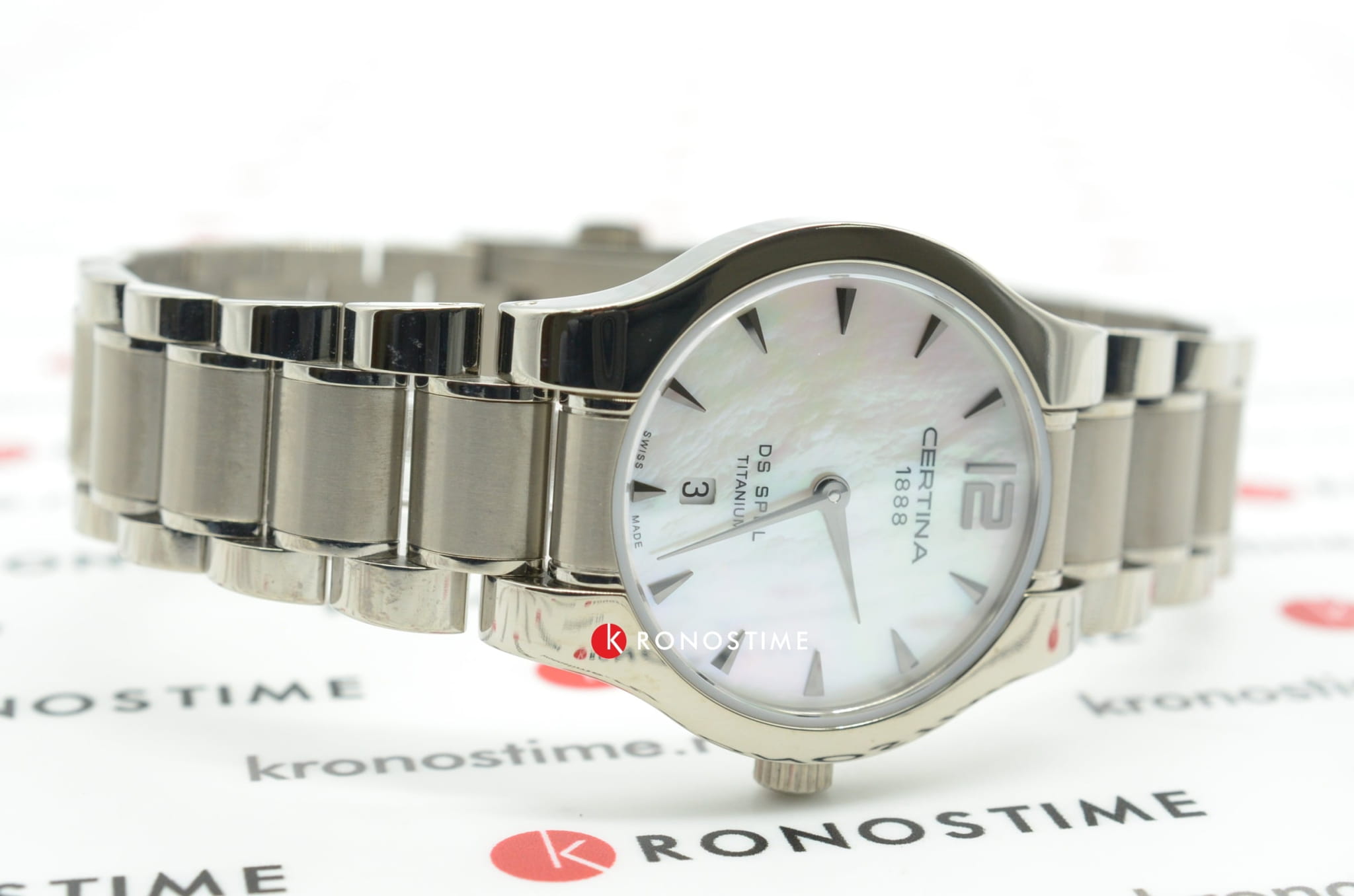 С виду женственная модель внутри – крепкий орешек. Корпус с концепцией DSDS ConceptDouble Security Concept, обозначает двойную надёжность и безупречную точность часов Certina. Двойная система защиты подразумевает обеспечение максимальной устойчивости к ударам и высоких показателей водонепроницаемости. выполнен из прочного гипоаллергенного титана. Перламутровый циферблат защищён сапфировым стеклом. Водозащита WR 100. Отображение числа.