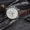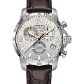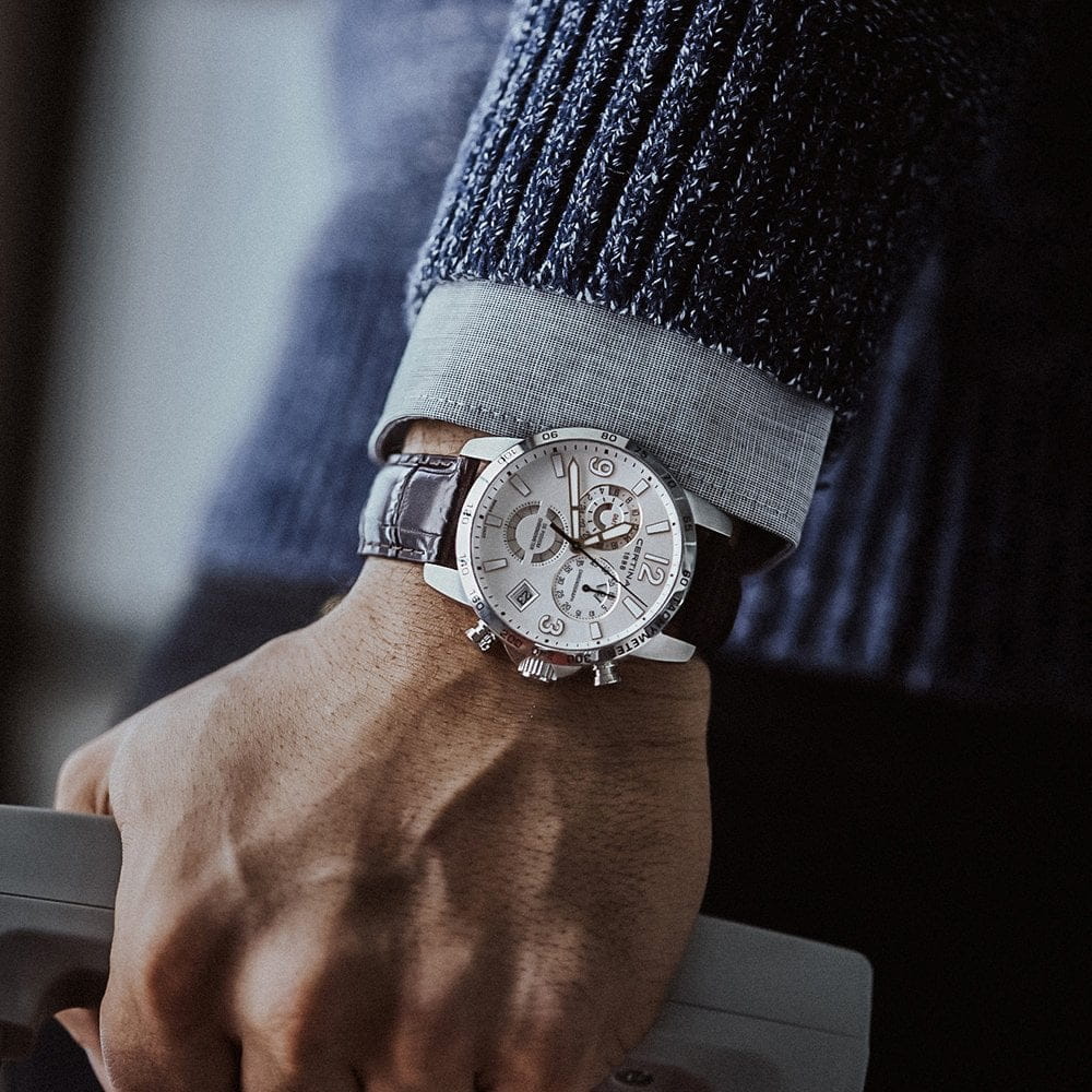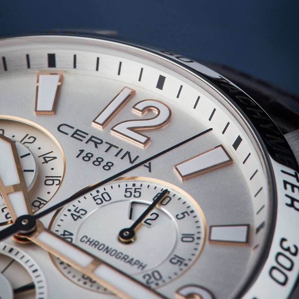 Аксессуар с серебристым циферблатом станет универсальным вариантом для делового или повседневного образа. Стильный хронографХронографФункция позволяет измерять отрезки времени с особой точностью: часы, минуты, секунды. Верным признаком хронографа является наличие на циферблате 3 дополнительных окошек-счётчиков. функционирует благодаря швейцарскому кварцевому механизму ETA G10.962 Precidrive™Precidrive™Инновационный кварцевый механизм Certina. Часы, оснащённые этим швейцарским калибром, приравниваются к точности к сертифицированным хронометрам, точность хода составляет +/-10 секунд в год.. Его абсолютная точность хода отмечена официальным сертификатом хронометра COSCСертификат COSCОфициальный сертификат, подтверждающий то, что часы ходят с особо высокой точностью. Для получения документа часы подвергаются тестовым испытаниям, разработанным швейцарским институтом тестирования хронометров COSC. Допустимая норма для механических часов -4/+6 секунд в день, для кварцевых моделей +/- 0,07 секунд в день.. Классический ремешок из натуральной кожи имеет поверхность с тиснением под кожу крокодила. Соблюдение DS ConceptDS ConceptDouble Security Concept, обозначает двойную надёжность и безупречную точность часов Certina. Двойная система защиты подразумевает обеспечение максимальной устойчивости к ударам и высоких показателей водонепроницаемости.. Сапфировое стекло с односторонним антибликовым покрытием. БезельБезельВнешний ободок, закрепляющий стекло. В спортивных часах так называется поворотное кольцо с делениями на циферблате, выполняет роль таймера – замеряет отрезки времени на шкале. Неподвижный безель – элемент декора. Однонаправленно вращающийся безель на дайверских часах позволяет фиксировать моменты погружения и выныривания на поверхность. со шкалой тахиметраТахиметрРазмеченная шкала, располагается на ободке или безеле часов. Тахиметр позволяет рассчитать скорость на определённом участке пути, расстояние измеряется в километрах или милях.. Водостойкость 100 метров. Люминесцентная подсветкаЛюминесцентное покрытиеПозволяет считывать показания времени в темноте. Производители наносят на стрелки, часовые индексы, безель или поверхность циферблата светонакопительный состав, дающий холодное свечение.. Защищённая заводная головка. Секундомер, GMTGMTОтображение времени второго часового пояса.Такая функция особенно актуальна для путешественников и бизнесменов,которые общаются с людьми из разных стран,теперь вы всегда будете знать,какой час у вашего партнёра или близкого человека., отображение числа, индикатор EOLEOLПредставляет собой систему, уведомляющую владельца часов о необходимости замены элемента питания. За 2 недели до полного разряда батарейки секундная стрелка перестаёт ходить чётко и начинает перепрыгивать на 3-4 деления.. Диаметр корпуса: 42 мм.