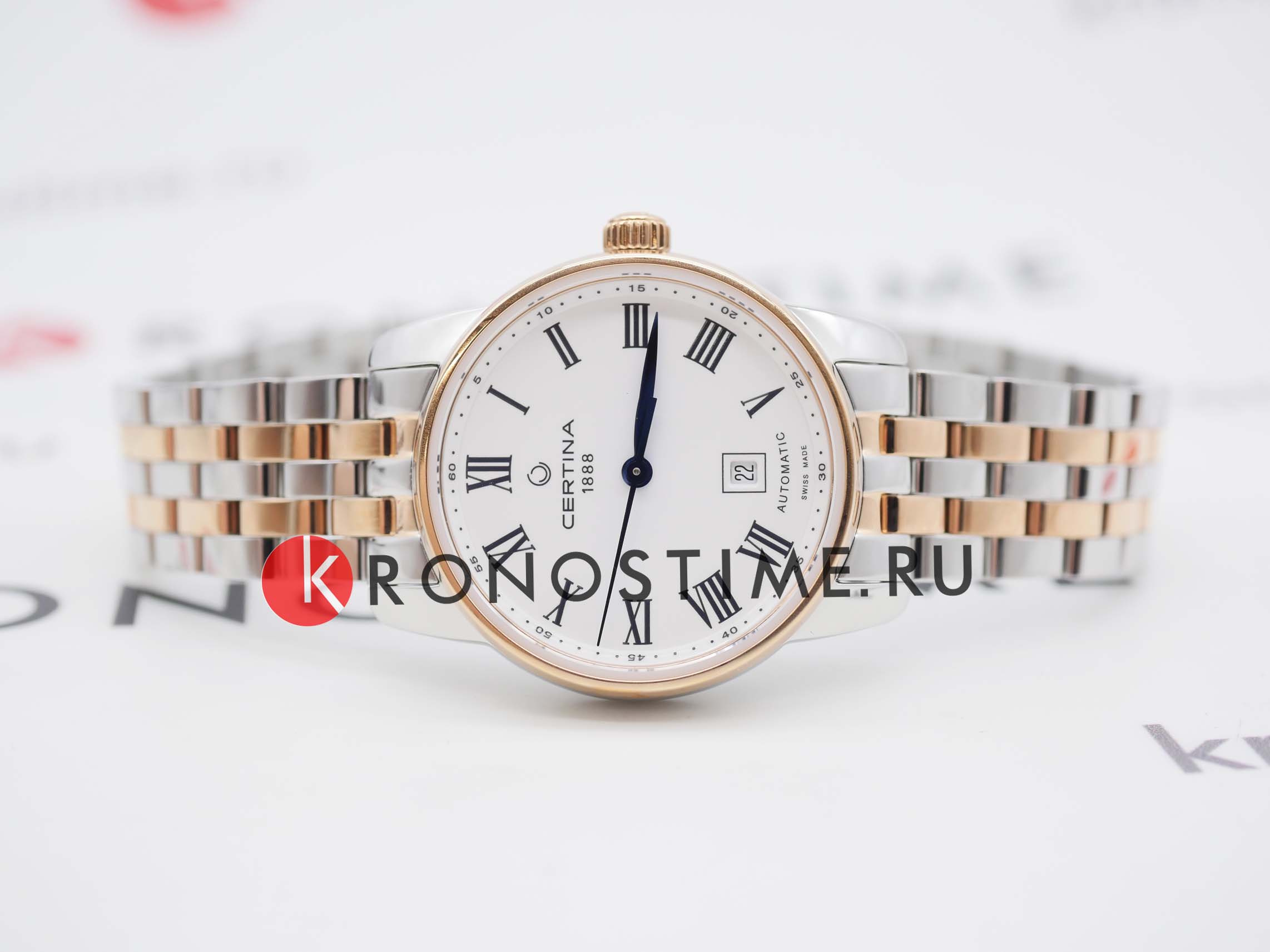 Элегантный аксессуар обладает вневременным дизайном, белый циферблат дополнен римскими цифрами с винтажным оттенком. Часы с автоматической системой завода для своей работы используют энергию от движений руки носительницы, позволяя забыть о необходимости регулярного завода. Швейцарский механизм ETA 2671 с 38-часовым запасом хода. Скелетонизированная задняя крышка. Сапфировое стеклоСапфировое стеклоПрочный и надёжный материал из кристалла сапфира синтетического происхождения, характеризующийся особой твёрдостью и устойчивостью к царапинам и повреждениям. с двухсторонней обработкой «антиблик». Концепция Double SecurityDS ConceptDouble Security Concept, обозначает двойную надёжность и безупречную точность часов Certina. Двойная система защиты подразумевает обеспечение максимальной устойчивости к ударам и высоких показателей водонепроницаемости.. Корпус и браслет из нержавеющей стали 316L с PVD-покрытиемPVDУльтратонкое покрытие наносится в технике вакуумного напыления, сочетает в себе нитрид титана особой прочности со слоем золота или оксида хрома. Несёт в себе декоративную или защитную функцию. «розовое золото». Водозащита 100 метров. Застёжка «бабочка» с кнопкамиЗастёжка "бабочка"Такой вид застёжки дополняется предохранителями, помогающими избежать случайного раскрытия браслета. Обладают изящным исполнением. . Отображение числа. Диаметр корпуса: 29 мм.
