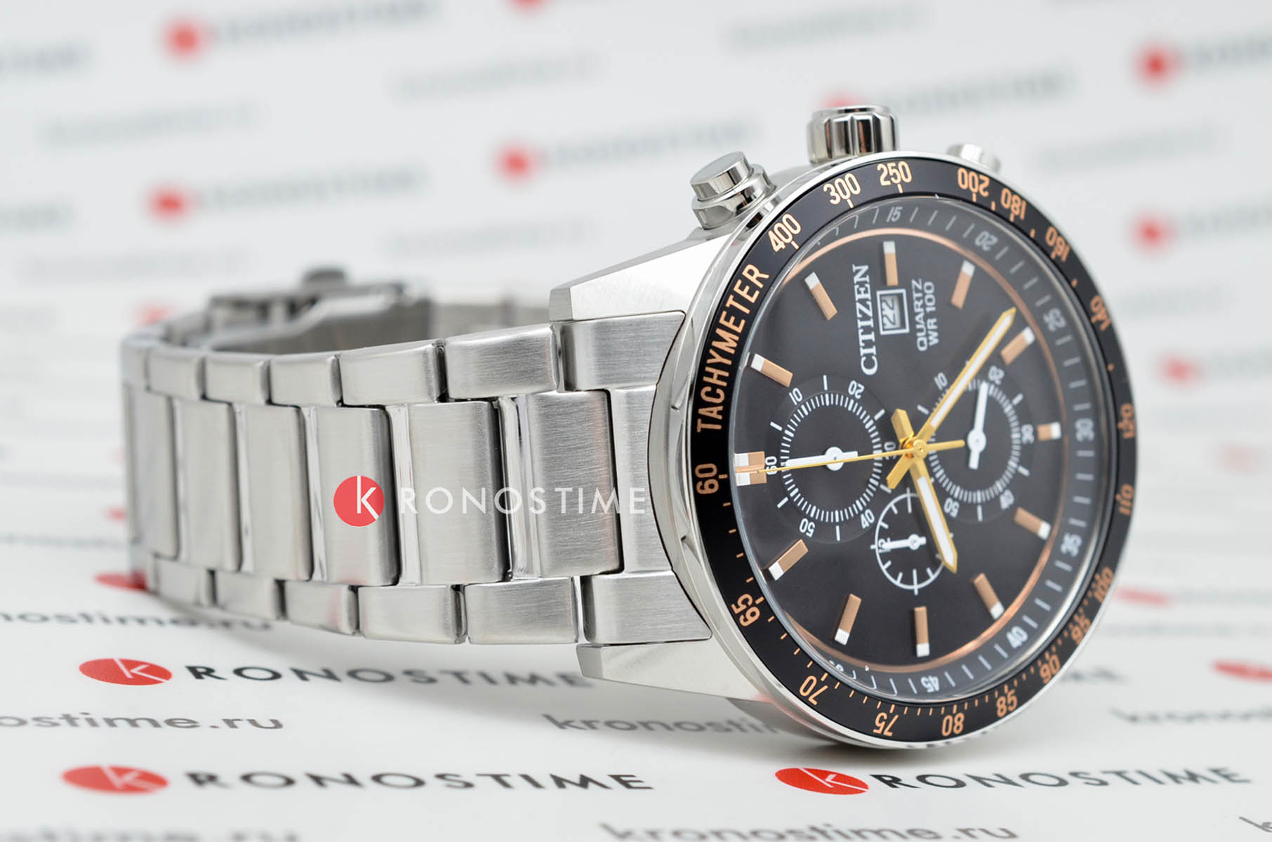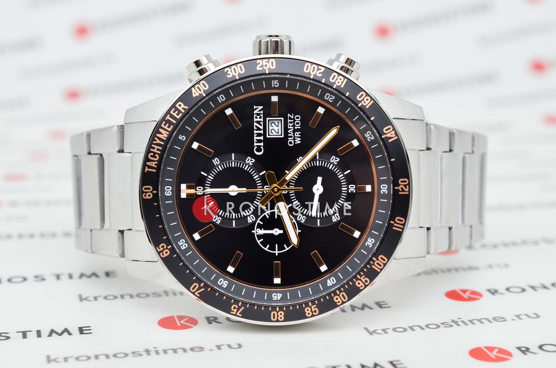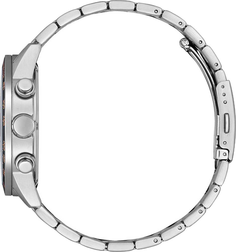 Citizen Chronograph AN3681-57E часы-хронографХронографФункция позволяет измерять отрезки времени с особой точностью: часы, минуты, секунды. Верным признаком хронографа является наличие на циферблате 3 дополнительных окошек-счётчиков. с секундомеромСекундомерСекундоме́р — прибор, способный измерять интервалы времени с точностью до долей секунды. спортивного дизайна с высоким уровнем водозащиты. Корпус из нержавеющей стали диаметром 44 мм идеально сбалансирован. Минеральное стеклоМинеральное стеклоМинеральное стекло представляет собой искусственно выращенный минерал кварца. Такое стекло отличается особой устойчивостью к повреждениям и царапинам. Уступает по некоторым качествам сапфировому стеклу. обеспечивает отличную защиту циферблата от царапин. Часы работают на основе кварцевого механизма. Стальной браслет на раскладной застёжкеРаскладная застёжкаТакой тип застёжки используется только на браслетах из металла. Она никогда не раскрывается полностью, происходит разделение на 2 и более частей. Раскладывающая застёжка снизит вероятность потери часов к минимуму. идеально дополняют дизайн часов, обеспечивая комфортное ношение. Стрелки и метки на циферблате имеют люминесцентное покрытиеЛюминесцентное покрытиеПозволяет считывать показания времени в темноте. Производители наносят на стрелки, часовые индексы, безель или поверхность циферблата светонакопительный состав, дающий холодное свечение. позволяющее легко определять время даже в темноте. БезельБезельВнешний ободок, закрепляющий стекло. В спортивных часах так называется поворотное кольцо с делениями на циферблате, выполняет роль таймера – замеряет отрезки времени на шкале. Неподвижный безель – элемент декора. Однонаправленно вращающийся безель на дайверских часах позволяет фиксировать моменты погружения и выныривания на поверхность. с IP-покрытиемIP-покрытиеМетод ионного напыления. Демонстрирует повышенную устойчивость к истиранию, окислению и химическим веществам. Под воздействием высокого давления и температуры около 1500°C молекулы металла надёжно соединяются с частицами корпуса часов. и шкалой тахиметраТахиметрРазмеченная шкала, располагается на ободке или безеле часов. Тахиметр позволяет рассчитать скорость на определённом участке пути, расстояние измеряется в километрах или милях.. Секундомер с точностью 1с и временем измерения 12ч отображается центральной стрелкой. Циферблат с метками в виде штрихов выполнен по технологии Sunray (солнечные лучи). Окошко даты находится в положении 3 часа. Часы обладают впечатляющей водонепроницаемостью до 100WR, что делает их идеальными для повседневной носки.