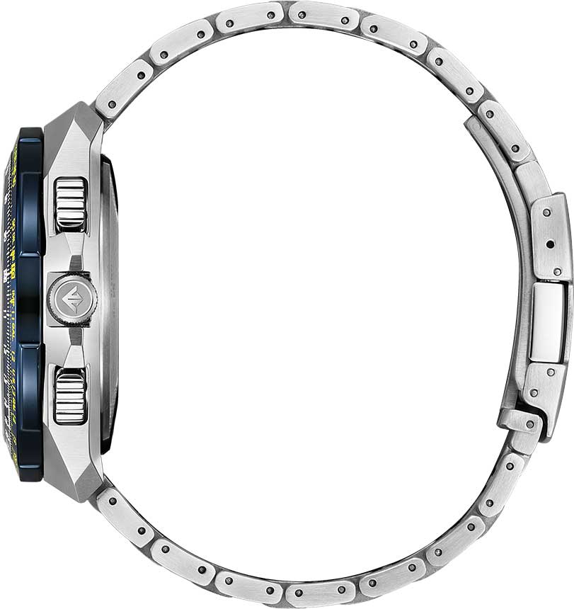 Citizen Promaster JY8125-54L часы-хронографХронографФункция позволяет измерять отрезки времени с особой точностью: часы, минуты, секунды. Верным признаком хронографа является наличие на циферблате 3 дополнительных окошек-счётчиков. с секундомеромСекундомерСекундоме́р — прибор, способный измерять интервалы времени с точностью до долей секунды. спортивного дизайна с высоким уровнем водозащиты. Корпус из нержавеющей стали диаметром 45,7 мм идеально сбалансирован. Сапфировое стеклоСапфировое стеклоПрочный и надёжный материал из кристалла сапфира синтетического происхождения, характеризующийся особой твёрдостью и устойчивостью к царапинам и повреждениям. с антибликовым покрытием обеспечивает отличную защиту циферблата от царапин. Часы работают на основе кварцевого механизма, питание от солнечной энергии. Стальной браслет на раскладной застёжкеРаскладная застёжкаТакой тип застёжки используется только на браслетах из металла. Она никогда не раскрывается полностью, происходит разделение на 2 и более частей. Раскладывающая застёжка снизит вероятность потери часов к минимуму. идеально дополняют дизайн часов, обеспечивая комфортное ношение. Стрелки и метки на циферблате имеют люминесцентное покрытиеЛюминесцентное покрытиеПозволяет считывать показания времени в темноте. Производители наносят на стрелки, часовые индексы, безель или поверхность циферблата светонакопительный состав, дающий холодное свечение. позволяющее легко определять время даже в темноте. Поворотный безельБезельВнешний ободок, закрепляющий стекло. В спортивных часах так называется поворотное кольцо с делениями на циферблате, выполняет роль таймера – замеряет отрезки времени на шкале. Неподвижный безель – элемент декора. Однонаправленно вращающийся безель на дайверских часах позволяет фиксировать моменты погружения и выныривания на поверхность. с IP-покрытиемIP-покрытиеМетод ионного напыления. Демонстрирует повышенную устойчивость к истиранию, окислению и химическим веществам. Под воздействием высокого давления и температуры около 1500°C молекулы металла надёжно соединяются с частицами корпуса часов.. Автоматический прием сигналов от радиовышек, расположенных в различных точках земного шара, которые передают временные сигналы от определенных атомных часов. Коррекция текущего времени радиосигналом на территории почти всей Европы, США, Японии и Китая. Функция индикации заряда (EOL) и предотвращения перезарядки. Мировое времяМировое время Полезное часовое усложнение, отображающее время в основных городах и известных областях по всему миру, оно связано с часовыми поясами, удобно для путешественников и бизнесменов. - 43 города, переход на зимнее и летнее время. Всемирное координированное время UTCUTCВсемирное кординационное время, не имеющее привязки к географическому положению Гринвича, основывается на атомном отсчёте времени. Регулировка времени осуществляется более точно, чем устаревшее GMT.