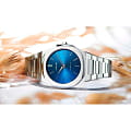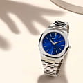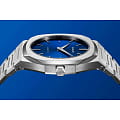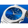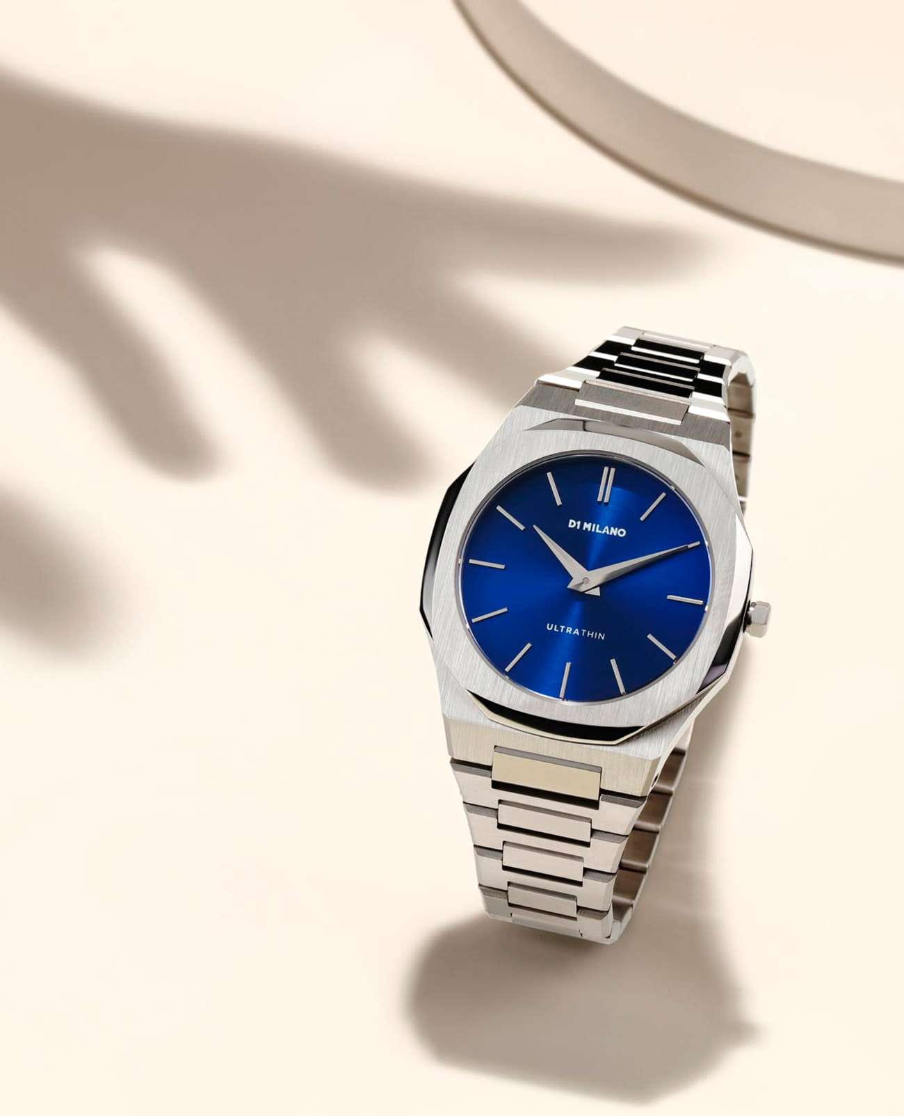 Наручные часы D1 Milano UTBL21 из коллекции Ultra Thin Mini Geo сочетают в себе элегантный дизайн и современные технологии. Модель обладает круглым корпусом диаметром 34 мм, изготовленным из нержавеющей стали, что обеспечивает высокую устойчивость к внешним воздействиям. Для защиты циферблата используется сапфировое стеклоСапфировое стеклоПрочный и надёжный материал из кристалла сапфира синтетического происхождения, характеризующийся особой твёрдостью и устойчивостью к царапинам и повреждениям., которое эффективно противостоит царапинам и механическим повреждениям. Часы оснащены кварцевым механизмом Miyota 1L22, гарантирующим точное время без необходимости подзаводки. Водонепроницаемость модели достигает 5 атмосфер (50 метров), что позволяет использовать их при контакте с водой, например, во время мытья рук или дождя. Браслет выполнен из нержавеющей стали с раскладной застежкойРаскладной замокДанный вариант застежки используется только на часах с металлическим браслетом. Отличительная особенность такого крепления в том, что длина браслета становится универсальной и вы можете самостоятельно отрегулировать нужный вам размер – застежка просто двигается по браслету часов., обеспечивающей комфортное ношение и безопасность. Циферблат синего цвета с метками в виде штрихов, что придает часам особую изысканность и делает их идеальным выбором для повседневного использования или особых случаев.