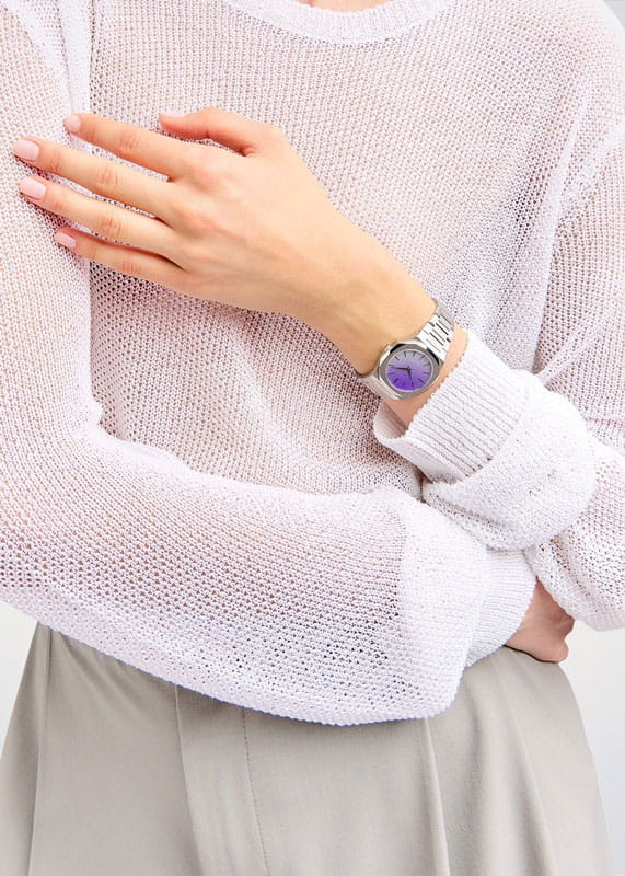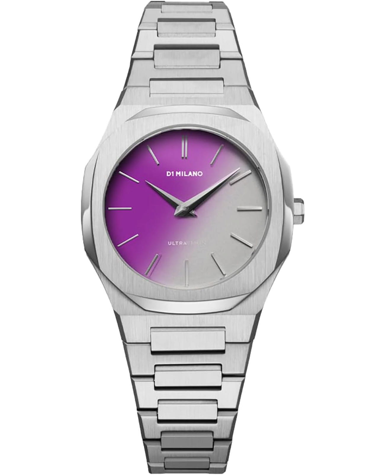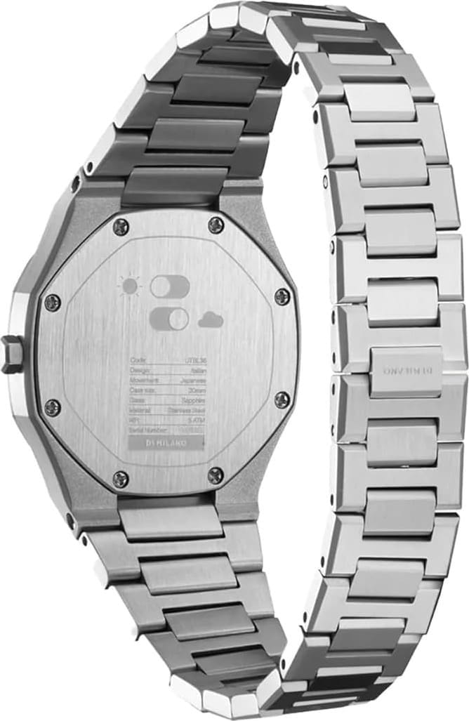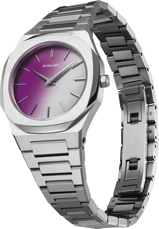 Женские наручные часы D1 Milano Solar Sync UTBL36 из коллекции Ultra Thin сочетают в себе элегантный дизайн и современные технологии. Модель обладает круглым корпусом диаметром 30 мм, изготовленным из нержавеющей стали 316L, что обеспечивает высокую устойчивость к внешним воздействиям. Для защиты циферблата используется сапфировое стеклоСапфировое стеклоПрочный и надёжный материал из кристалла сапфира синтетического происхождения, характеризующийся особой твёрдостью и устойчивостью к царапинам и повреждениям. с антибликовым покрытиемАнтибликовое покрытиеСлой оксида металла в 0,13-0,3 микрон, благодаря которому стекло часов не бликует и не отражает свет. Антибликовое покрытие уменьшает отражение света в 10 раз, обеспечивая отличную читаемость показателей циферблата., которое эффективно противостоит царапинам и механическим повреждениям. Часы оснащены кварцевым механизмом Miyota 1L22, гарантирующим точное время без необходимости подзаводки. Водонепроницаемость модели достигает 5 атмосфер (50 метров), что позволяет использовать их при контакте с водой, например, во время мытья рук или дождя. Браслет выполнен из нержавеющей стали с застежкой «бабочка»Застёжка "бабочка"Такой вид застёжки дополняется предохранителями, помогающими избежать случайного раскрытия браслета. Обладают изящным исполнением. , обеспечивающей комфортное ношение и безопасность. Фотохромный циферблат. цвет изменяется от серого до фиолетового в зависимости от интенсивности ультрафиолетовых лучей. что придает часам особую изысканность и делает их идеальным выбором для повседневного использования или особых случаев.