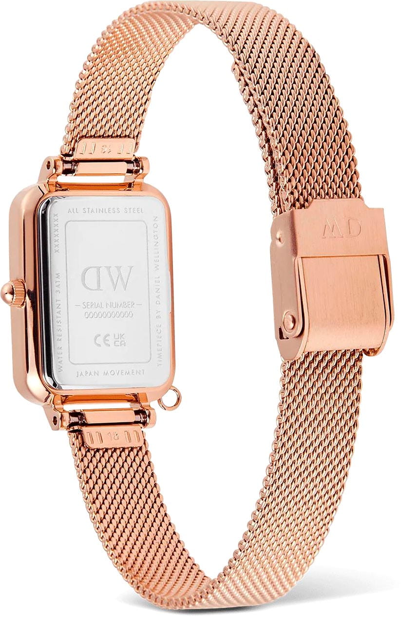 Женские наручные часы с минеральным стекломМинеральное стеклоМинеральное стекло представляет собой искусственно выращенный минерал кварца. Такое стекло отличается особой устойчивостью к повреждениям и царапинам. Уступает по некоторым качествам сапфировому стеклу. Daniel Wellington Quadro Crystal Zodiac Melrose DW00100748, кварцевый механизм с высокой точностью. Корпус часов изготовлен из нержавеющей стали с PVD-покрытиемPVDУльтратонкое покрытие наносится в технике вакуумного напыления, сочетает в себе нитрид титана особой прочности со слоем золота или оксида хрома. Несёт в себе декоративную или защитную функцию.. БезельБезельВнешний ободок, закрепляющий стекло. В спортивных часах так называется поворотное кольцо с делениями на циферблате, выполняет роль таймера – замеряет отрезки времени на шкале. Неподвижный безель – элемент декора. Однонаправленно вращающийся безель на дайверских часах позволяет фиксировать моменты погружения и выныривания на поверхность. украшен кристаллами Swarovski. Матовый циферблат украшен фирменным логотипом Daniel Wellington. Накладные метки в виде штрихов. Японский кварцевый механизм. Рифленая заводная головка. Класс водозащиты: 30 метров, позволит защитить корпус от случайных брызг или капель дождя. Стальной браслет миланского плетения с PVD-покрытиемPVDУльтратонкое покрытие наносится в технике вакуумного напыления, сочетает в себе нитрид титана особой прочности со слоем золота или оксида хрома. Несёт в себе декоративную или защитную функцию. на раскладном замкеРаскладной замокДанный вариант застежки используется только на часах с металлическим браслетом. Отличительная особенность такого крепления в том, что длина браслета становится универсальной и вы можете самостоятельно отрегулировать нужный вам размер – застежка просто двигается по браслету часов.. Корпус дополнен колечком для подвески.