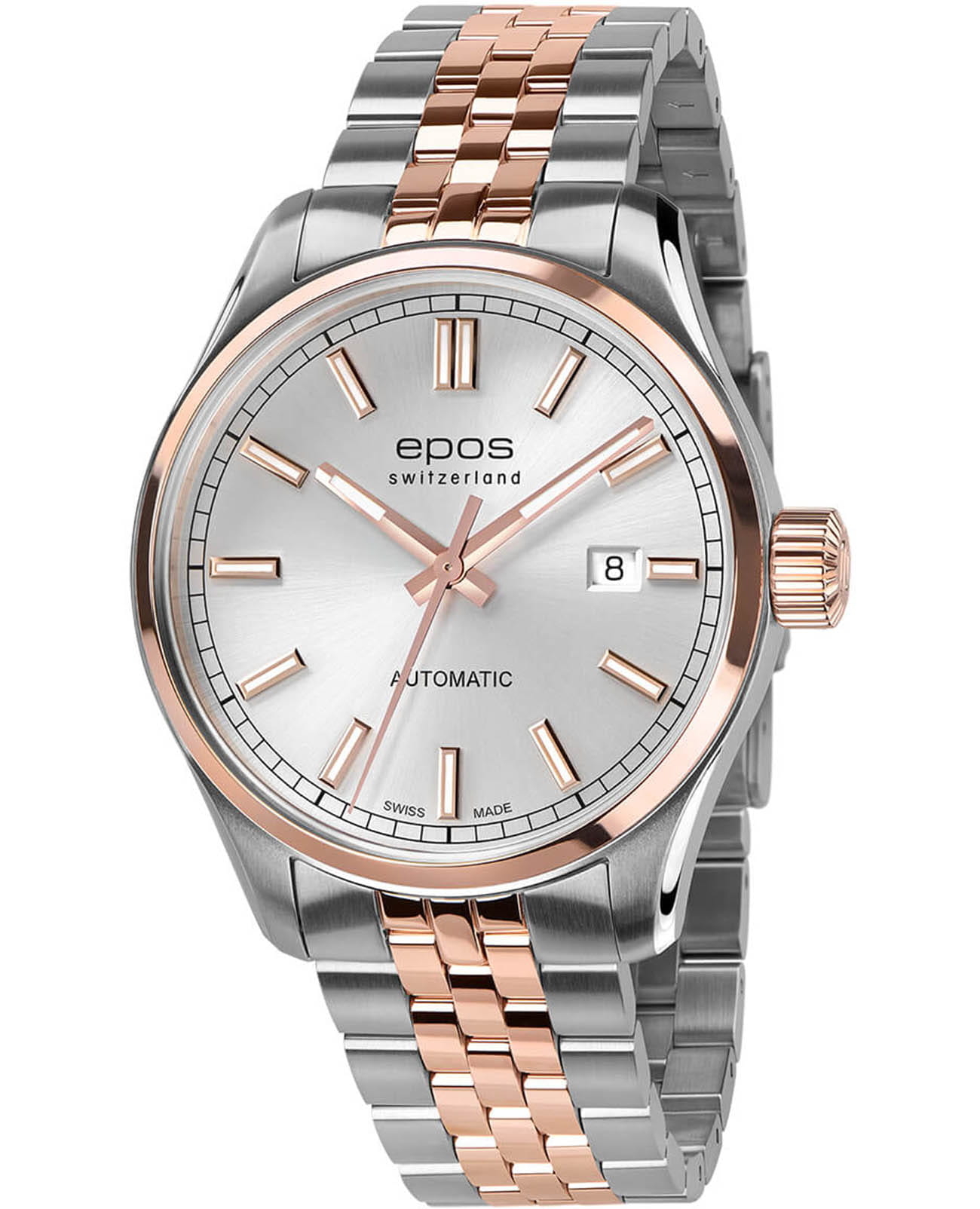 Мужские механические часы с автоподзаводом Epos 3501.132.34.18.44 образец швейцарской элегантности и точности. Круглый корпус размером 41 мм из нержавеющей стали. БезельБезельВнешний ободок, закрепляющий стекло. В спортивных часах так называется поворотное кольцо с делениями на циферблате, выполняет роль таймера – замеряет отрезки времени на шкале. Неподвижный безель – элемент декора. Однонаправленно вращающийся безель на дайверских часах позволяет фиксировать моменты погружения и выныривания на поверхность. с PVD-покрытиемPVDУльтратонкое покрытие наносится в технике вакуумного напыления, сочетает в себе нитрид титана особой прочности со слоем золота или оксида хрома. Несёт в себе декоративную или защитную функцию. цвета розового золота, серебристый циферблат с солнечной текстурой Sunray и накладными штрихами. Окошко даты расположено в положении 3 часов. Стекло — сапфировоеСапфировое стеклоПрочный и надёжный материал из кристалла сапфира синтетического происхождения, характеризующийся особой твёрдостью и устойчивостью к царапинам и повреждениям.. Стрелки и метки с люминесцентным покрытиемЛюминесцентное покрытиеПозволяет считывать показания времени в темноте. Производители наносят на стрелки, часовые индексы, безель или поверхность циферблата светонакопительный состав, дающий холодное свечение.. Механизм — швейцарский ETA 2824, запас хода до 38 часов. Водонепроницаемость 100 м. Браслет — стальной с частичным PVD-покрытиемPVDУльтратонкое покрытие наносится в технике вакуумного напыления, сочетает в себе нитрид титана особой прочности со слоем золота или оксида хрома. Несёт в себе декоративную или защитную функцию. на раскладной застёжкеРаскладная застёжкаТакой тип застёжки используется только на браслетах из металла. Она никогда не раскрывается полностью, происходит разделение на 2 и более частей. Раскладывающая застёжка снизит вероятность потери часов к минимуму.. Идеальный выбор для тех, кто ценит швейцарское качество и классический стиль.