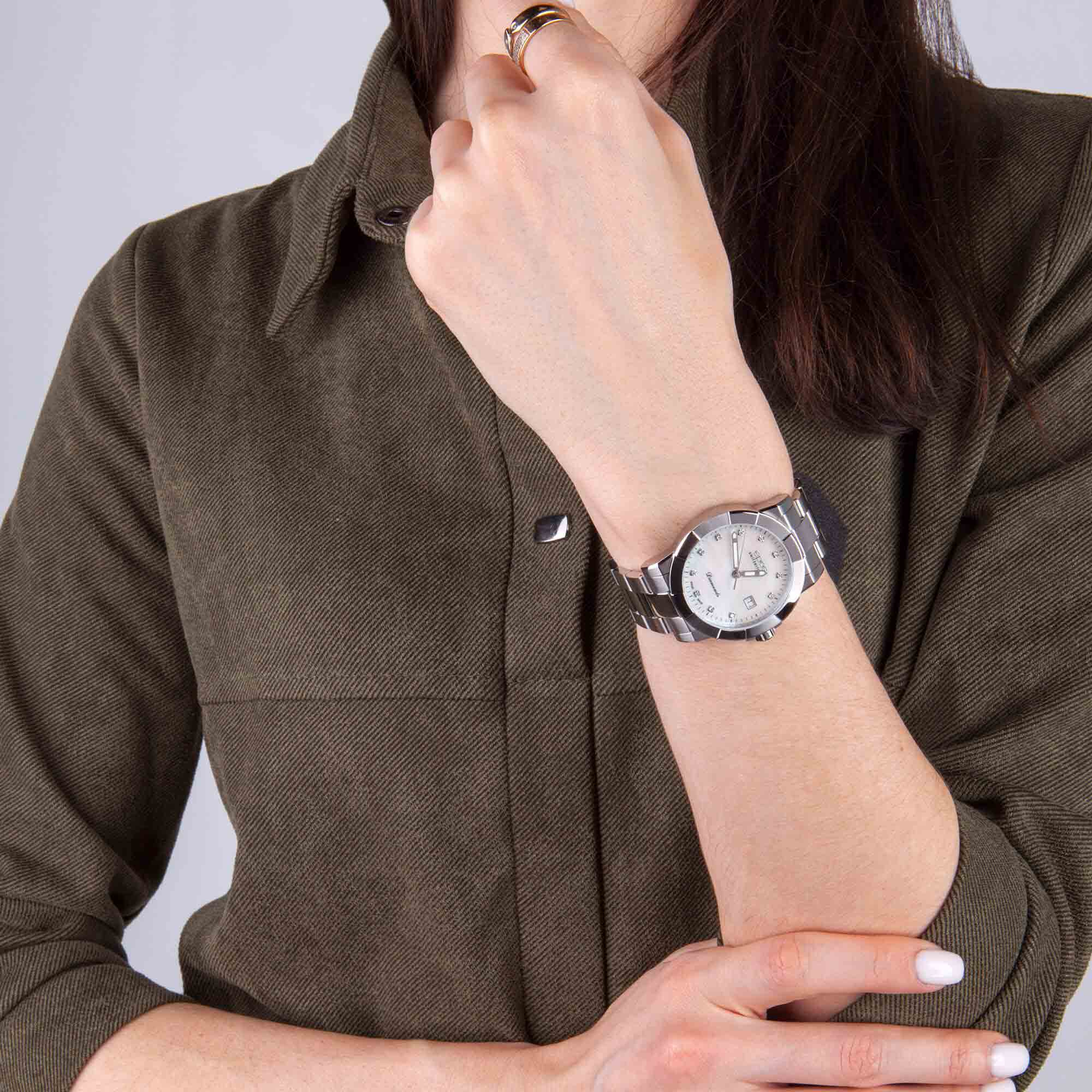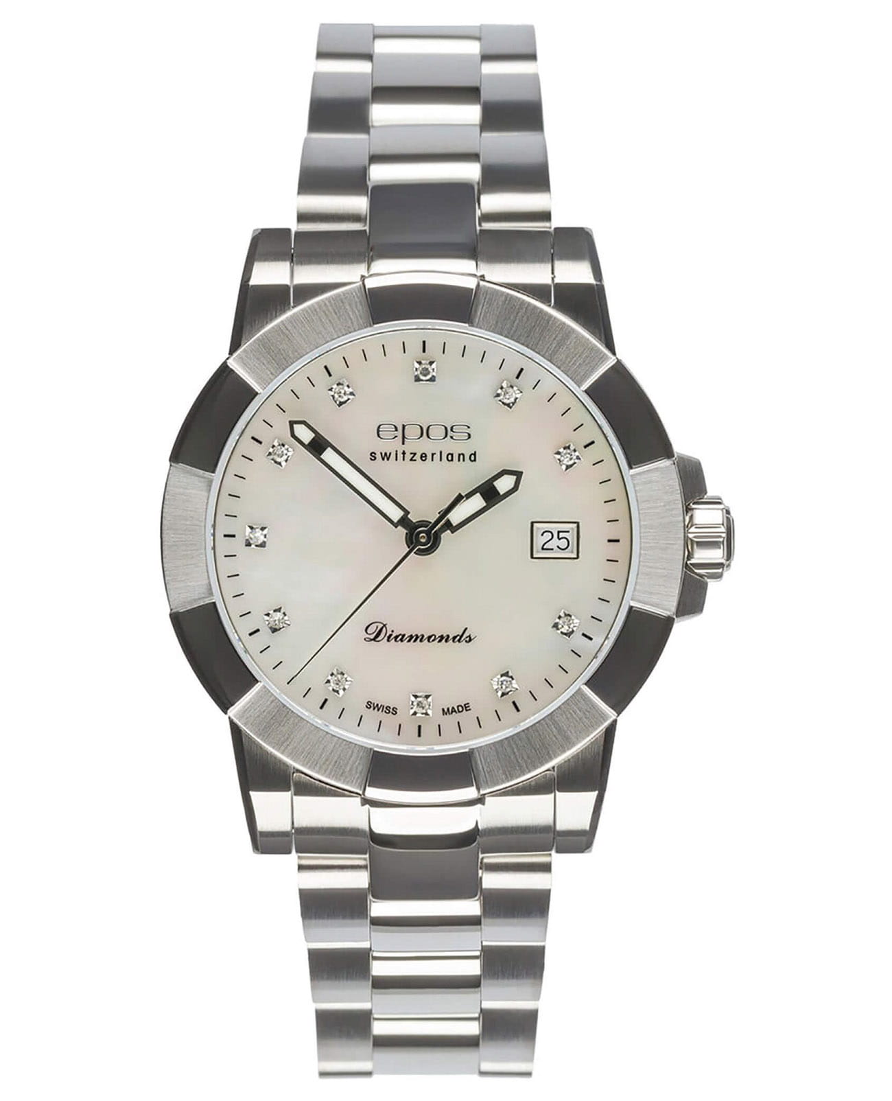 Женские швейцарские наручные часы с кварцевым механизмом с высокой точностью Epos Ladies 001.700.20.80.30. Сапфировое стеклоСапфировое стеклоПрочный и надёжный материал из кристалла сапфира синтетического происхождения, характеризующийся особой твёрдостью и устойчивостью к царапинам и повреждениям. устойчивое к появлению царапин, обладающее высокой прозрачностью. Корпус часов изготовлен из нержавеющей стали. Циферблат украшен бриллиантами. Окошко даты находится в положении 3 часа. Класс водозащиты: 50 метров, позволит защитить корпус от случайных брызг или капель дождя. Стальной браслет на раскладной застёжкеРаскладная застёжкаТакой тип застёжки используется только на браслетах из металла. Она никогда не раскрывается полностью, происходит разделение на 2 и более частей. Раскладывающая застёжка снизит вероятность потери часов к минимуму..