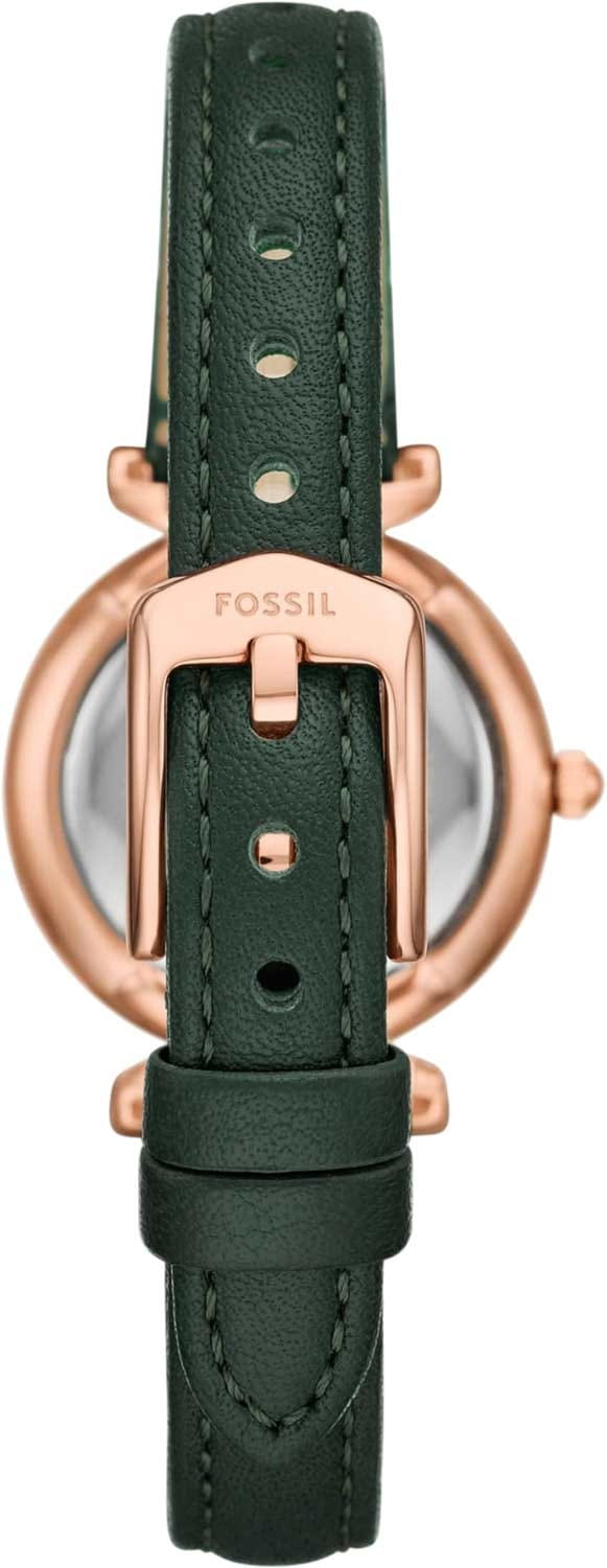 Часы Fossil ES5370 представляют собой стильный аксессуар, который станет отличным дополнением к вашему образу. Эти женские наручные часы, произведенные в США, оснащены надежным кварцевым механизмом. Корпус выполнен из стали с розово-золотистым IP-покрытиемIP-покрытиеМетод ионного напыления. Демонстрирует повышенную устойчивость к истиранию, окислению и химическим веществам. Под воздействием высокого давления и температуры около 1500°C молекулы металла надёжно соединяются с частицами корпуса часов., а безельБезельВнешний ободок, закрепляющий стекло. В спортивных часах так называется поворотное кольцо с делениями на циферблате, выполняет роль таймера – замеряет отрезки времени на шкале. Неподвижный безель – элемент декора. Однонаправленно вращающийся безель на дайверских часах позволяет фиксировать моменты погружения и выныривания на поверхность. украшен кристаллами, что придает часам утонченный и изысканный вид. Зеленый циферблат, изготовленный по технологии Sunray, создает эффект солнечных лучей и привлекает внимание своей глубиной. Метки в виде штрихов и римских цифр VI и XII подчеркивают классический стиль, а рифленая заводная головка добавляет изящества. Стрелки с люминесцентным покрытиемЛюминесцентное покрытиеПозволяет считывать показания времени в темноте. Производители наносят на стрелки, часовые индексы, безель или поверхность циферблата светонакопительный состав, дающий холодное свечение. позволяют легко считывать время даже в условиях низкой освещенности. Часы комплектуются фирменным кожаным ремешком LiteHide с классической застежкой, который обеспечивает комфортное ношение и надежную фиксацию на запястье. Водозащита 50WR позволяет не беспокоиться о случайных брызгах воды. Минеральное стеклоМинеральное стеклоМинеральное стекло представляет собой искусственно выращенный минерал кварца. Такое стекло отличается особой устойчивостью к повреждениям и царапинам. Уступает по некоторым качествам сапфировому стеклу. защищает циферблат от царапин и повреждений. С диаметром корпуса 28 мм и шириной ремешка 12 мм, эти часы идеально подойдут для тех, кто ценит элегантность и качество.