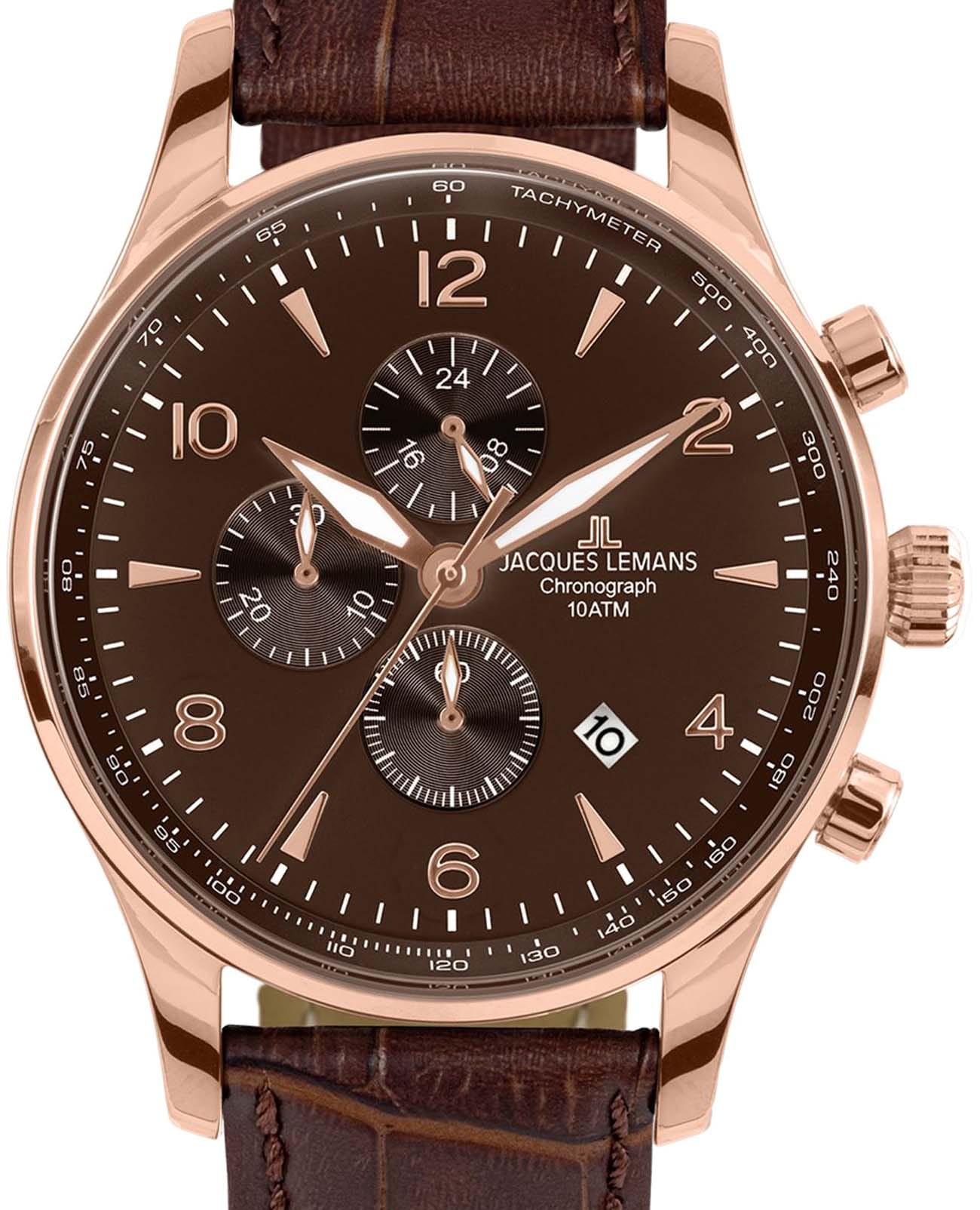 Мужские часы Jacques Lemans London 1-1844ZQ представляют собой стильный хронографХронографФункция позволяет измерять отрезки времени с особой точностью: часы, минуты, секунды. Верным признаком хронографа является наличие на циферблате 3 дополнительных окошек-счётчиков., отражающий идеальное сочетание современного дизайна, надёжности и функциональности. Элегантный облик позволяют носить часы как со строгой рубашкой, так и с повседневными джинсами. Корпус из нержавеющей стали с PVD-покрытиемPVDУльтратонкое покрытие наносится в технике вакуумного напыления, сочетает в себе нитрид титана особой прочности со слоем золота или оксида хрома. Несёт в себе декоративную или защитную функцию. цвета розового золота, диаметром 44 мм идеально сбалансирован и элегантен. Ударопрочное минеральное стеклоМинеральное стеклоМинеральное стекло представляет собой искусственно выращенный минерал кварца. Такое стекло отличается особой устойчивостью к повреждениям и царапинам. Уступает по некоторым качествам сапфировому стеклу. Crystex защищает циферблат от царапин. Кожаный ремешок на стандартной застёжке обеспечивает комфортное ношение. ТахиметрТахиметрРазмеченная шкала, располагается на ободке или безеле часов. Тахиметр позволяет рассчитать скорость на определённом участке пути, расстояние измеряется в километрах или милях. по внешнему краю. Водозащита 100 метров позволит плавать, нырять и заниматься другими водными видами спорта. Стрелки с люминесцентным покрытиемЛюминесцентное покрытиеПозволяет считывать показания времени в темноте. Производители наносят на стрелки, часовые индексы, безель или поверхность циферблата светонакопительный состав, дающий холодное свечение. позволяющие легко определять время даже в темноте. Окошко даты находится в положении между 4 и 5 часов. Это аксессуар для мужчины, который ценит классический стиль и функциональность.