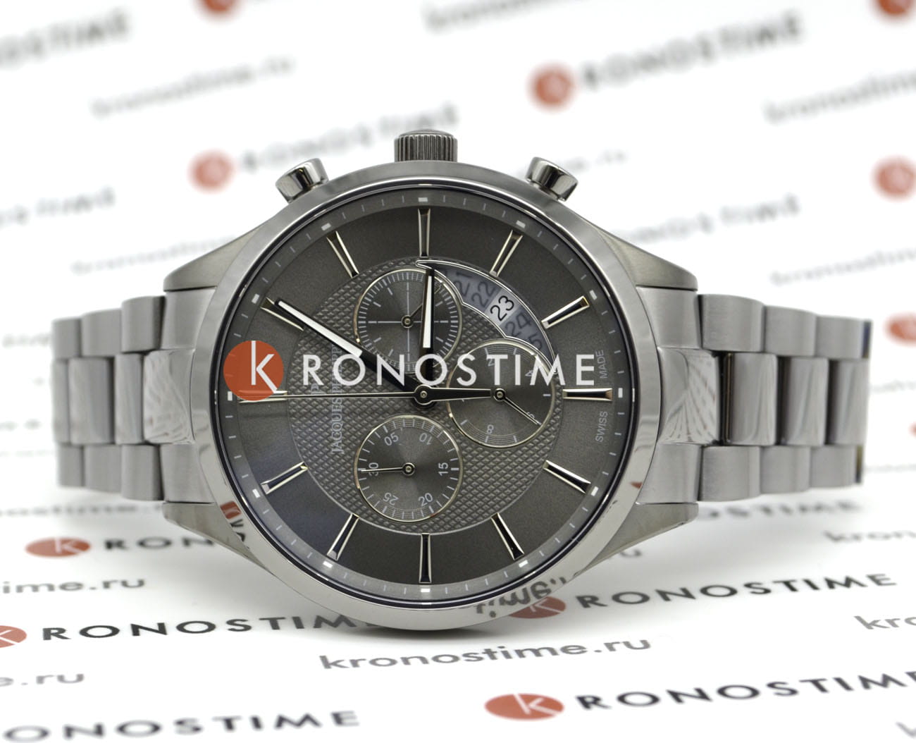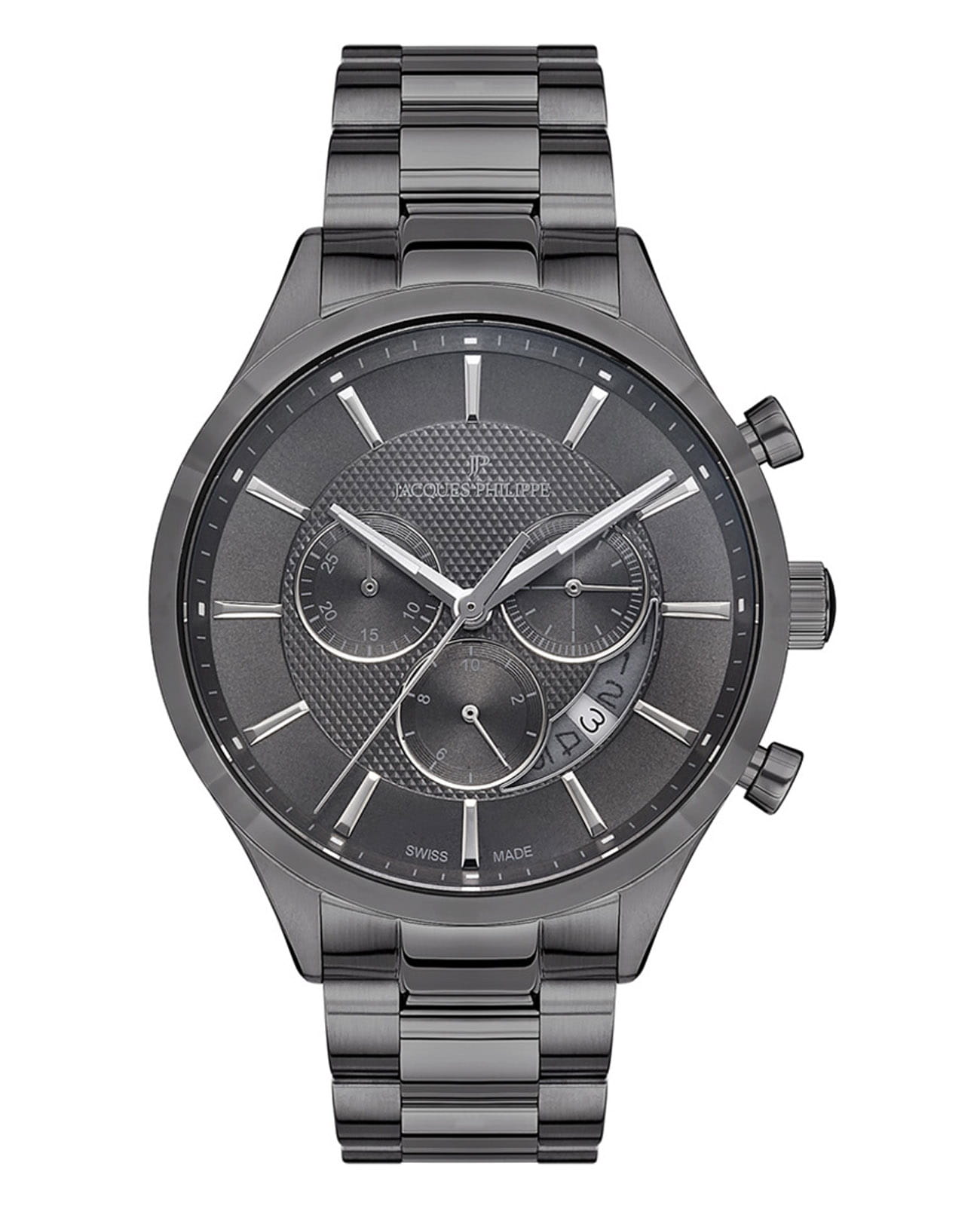 Швейцарские мужские часы-хронографХронографФункция позволяет измерять отрезки времени с особой точностью: часы, минуты, секунды. Верным признаком хронографа является наличие на циферблате 3 дополнительных окошек-счётчиков. с секундомеромСекундомерСекундоме́р — прибор, способный измерять интервалы времени с точностью до долей секунды. Jacques Philippe Gallant JPQGC038347, кварцевый механизм с высокой точностью. Сапфировое стеклоСапфировое стеклоПрочный и надёжный материал из кристалла сапфира синтетического происхождения, характеризующийся особой твёрдостью и устойчивостью к царапинам и повреждениям. устойчивое к появлению царапин, обладающее высокой прозрачностью. Корпус часов изготовлен из нержавеющей стали. На циферблате три дополнительных индикатора. Стрелки с люминесцентным покрытиемЛюминесцентное покрытиеПозволяет считывать показания времени в темноте. Производители наносят на стрелки, часовые индексы, безель или поверхность циферблата светонакопительный состав, дающий холодное свечение.. Окошко даты находится между 4 и 5 часами. Класс водозащиты: 50 метров, позволит защитить корпус от случайных брызг или капель дождя. Стальной браслет на застёжке «бабочка» с кнопкамиЗастёжка "бабочка"Такой вид застёжки дополняется предохранителями, помогающими избежать случайного раскрытия браслета. Обладают изящным исполнением. .