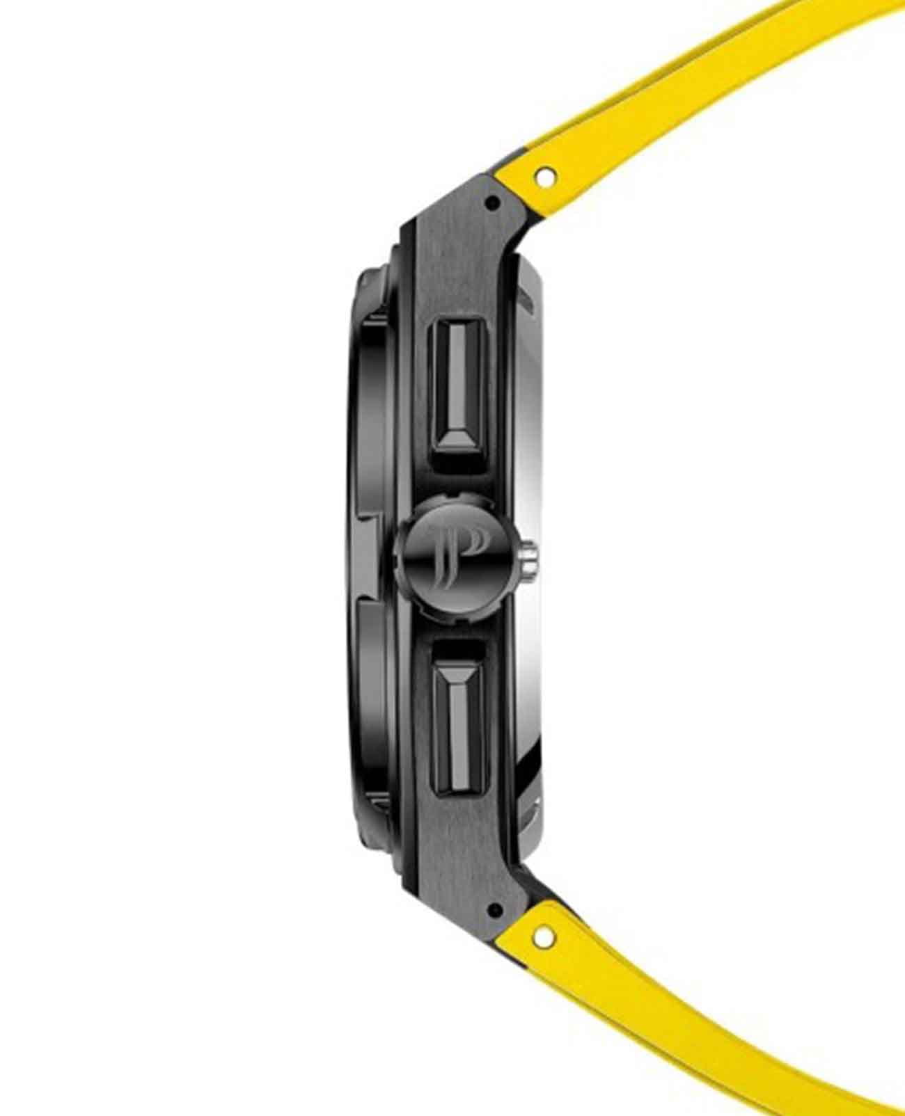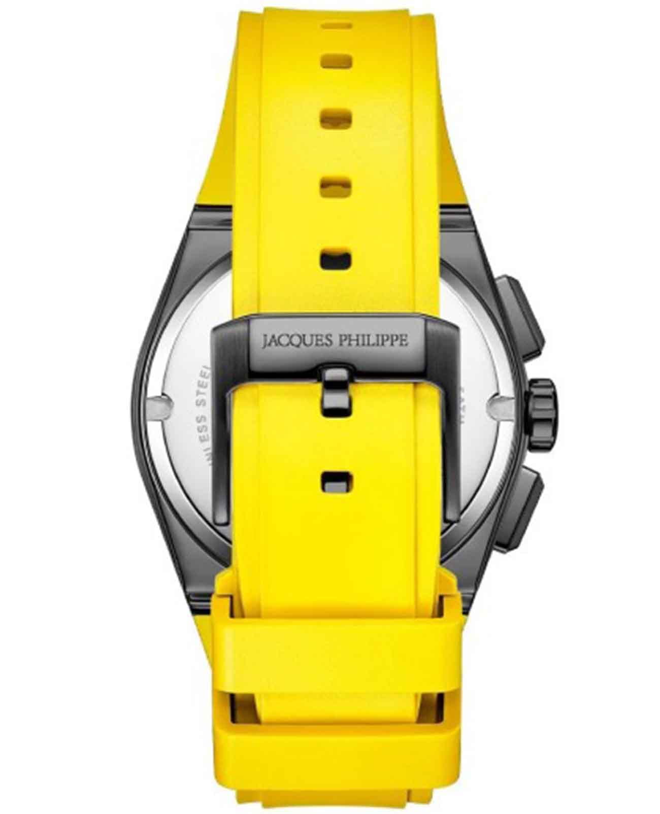 Часы-хронографаХронографФункция позволяет измерять отрезки времени с особой точностью: часы, минуты, секунды. Верным признаком хронографа является наличие на циферблате 3 дополнительных окошек-счётчиков. с секундомеромСекундомерСекундоме́р — прибор, способный измерять интервалы времени с точностью до долей секунды. Jacques Philippe JPQGC41841XY из коллекции Aurora — это гармоничное сочетание швейцарского качества, современного спортивного стиля и функциональности. Модель оснащена точным кварцевым механизмом калибра Ronda 5030.D, который гарантирует надежную работу и высокую точность хода. Корпус выполнен из прочной нержавеющей стали 316L с черным IP-покрытиемIP-покрытиеМетод ионного напыления. Демонстрирует повышенную устойчивость к истиранию, окислению и химическим веществам. Под воздействием высокого давления и температуры около 1500°C молекулы металла надёжно соединяются с частицами корпуса часов., устойчив к износу и сохраняет презентабельный вид даже при ежедневной эксплуатации. Сапфировое стеклоСапфировое стеклоПрочный и надёжный материал из кристалла сапфира синтетического происхождения, характеризующийся особой твёрдостью и устойчивостью к царапинам и повреждениям. с антибликовым покрытиемАнтибликовое покрытиеСлой оксида металла в 0,13-0,3 микрон, благодаря которому стекло часов не бликует и не отражает свет. Антибликовое покрытие уменьшает отражение света в 10 раз, обеспечивая отличную читаемость показателей циферблата. защищает черный циферблат от царапин и обеспечивает отличную читаемость информации при любом освещении. На циферблате расположены три дополнительных индикатора и окошко даты в положении «4 часа», а стрелки с люминесцентным покрытиемЛюминесцентное покрытиеПозволяет считывать показания времени в темноте. Производители наносят на стрелки, часовые индексы, безель или поверхность циферблата светонакопительный состав, дающий холодное свечение. позволяют легко определить время даже в темноте. Комфорт в носке обеспечивает силиконовый желтый ремешок шириной 27 мм, который плотно прилегает к запястью и отличается долговечностью. Водозащита 5 ATM позволяет не переживать за сохранность часов во время мытья рук или прогулок под дождём.