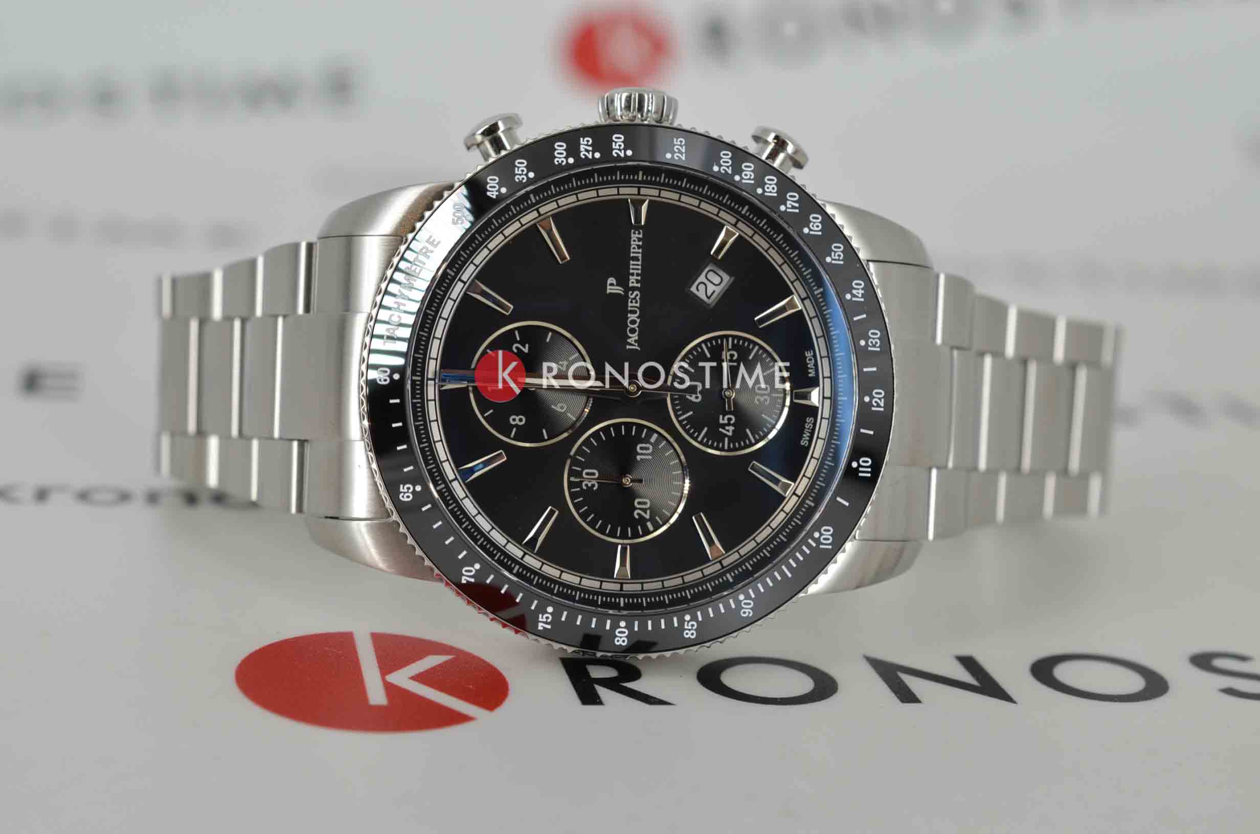 Швейцарские наручные часы Jacques Philippe JPQGC691316 сочетают в себе современный дизайн, надежность и функциональность, это стильные швейцарские часы с функцией хронографаХронографФункция позволяет измерять отрезки времени с особой точностью: часы, минуты, секунды. Верным признаком хронографа является наличие на циферблате 3 дополнительных окошек-счётчиков. и секундомераСекундомерСекундоме́р — прибор, способный измерять интервалы времени с точностью до долей секунды.. Корпус круглой формы диаметром 42 мм выполнен из прочной нержавеющей стали, а безельБезельВнешний ободок, закрепляющий стекло. В спортивных часах так называется поворотное кольцо с делениями на циферблате, выполняет роль таймера – замеряет отрезки времени на шкале. Неподвижный безель – элемент декора. Однонаправленно вращающийся безель на дайверских часах позволяет фиксировать моменты погружения и выныривания на поверхность. с элегантным черным IP-покрытиемIP-покрытиеМетод ионного напыления. Демонстрирует повышенную устойчивость к истиранию, окислению и химическим веществам. Под воздействием высокого давления и температуры около 1500°C молекулы металла надёжно соединяются с частицами корпуса часов.. Сапфировое стеклоСапфировое стеклоПрочный и надёжный материал из кристалла сапфира синтетического происхождения, характеризующийся особой твёрдостью и устойчивостью к царапинам и повреждениям. с антибликовым покрытиемАнтибликовое покрытиеСлой оксида металла в 0,13-0,3 микрон, благодаря которому стекло часов не бликует и не отражает свет. Антибликовое покрытие уменьшает отражение света в 10 раз, обеспечивая отличную читаемость показателей циферблата. надежно защищает черный циферблат от царапин и повреждений. Модель оснащена точным кварцевым механизмом, а также дополнительными функциями — тахиметромТахиметрРазмеченная шкала, располагается на ободке или безеле часов. Тахиметр позволяет рассчитать скорость на определённом участке пути, расстояние измеряется в километрах или милях. и индикатором даты, что делает часы не только стильным аксессуаром, но и практичным помощником на каждый день. Серебряный браслет шириной 22 мм удобно фиксируется на запястье с помощью застежки «бабочка»Застёжка "бабочка"Такой вид застёжки дополняется предохранителями, помогающими избежать случайного раскрытия браслета. Обладают изящным исполнением. . Стрелки имеют люминесцентное покрытиеЛюминесцентное покрытиеПозволяет считывать показания времени в темноте. Производители наносят на стрелки, часовые индексы, безель или поверхность циферблата светонакопительный состав, дающий холодное свечение. для удобства чтения времени в темноте. Водозащита 5 АТМ позволяет не снимать часы при дожде и случайных контактах с водой.