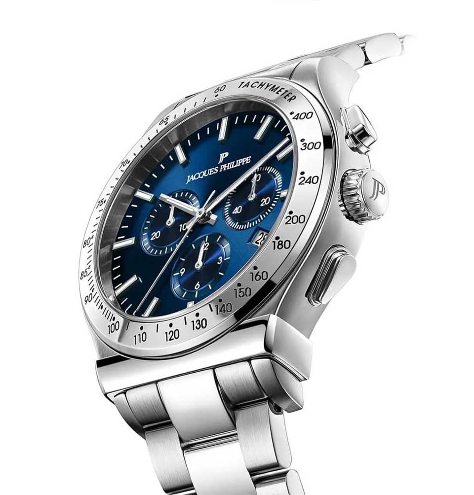 Jacques Philippe JPQGC701336 — швейцарские наручные часы, которые станут идеальным дополнением к образу современного мужчины, ценящего стиль и качество, это стильные швейцарские часы с функцией хронографаХронографФункция позволяет измерять отрезки времени с особой точностью: часы, минуты, секунды. Верным признаком хронографа является наличие на циферблате 3 дополнительных окошек-счётчиков. и секундомераСекундомерСекундоме́р — прибор, способный измерять интервалы времени с точностью до долей секунды.. Корпус и браслет выполнены из высокопрочной нержавеющей стали 316L, что подчеркивает статус владельца и гарантирует долговечность аксессуара. Классический дизайн с синим циферблатом гармонично сочетается с современными деталями: тахиметрическаяТахиметрРазмеченная шкала, располагается на ободке или безеле часов. Тахиметр позволяет рассчитать скорость на определённом участке пути, расстояние измеряется в километрах или милях. шкала на безелеБезельВнешний ободок, закрепляющий стекло. В спортивных часах так называется поворотное кольцо с делениями на циферблате, выполняет роль таймера – замеряет отрезки времени на шкале. Неподвижный безель – элемент декора. Однонаправленно вращающийся безель на дайверских часах позволяет фиксировать моменты погружения и выныривания на поверхность. добавляет функциональности, а окошко даты, расположенное на отметке «4 часа», обеспечивает дополнительное удобство. Сапфировое стеклоСапфировое стеклоПрочный и надёжный материал из кристалла сапфира синтетического происхождения, характеризующийся особой твёрдостью и устойчивостью к царапинам и повреждениям. надежно защищает часы от царапин и повреждений, сохраняя их безупречный внешний вид. Кварцевый механизм обеспечивает точный ход и не требует частого обслуживания. Водозащита до 10 атмосфер (100 метров) позволяет не снимать часы во время плавания. Стрелки имеют люминесцентное покрытиеЛюминесцентное покрытиеПозволяет считывать показания времени в темноте. Производители наносят на стрелки, часовые индексы, безель или поверхность циферблата светонакопительный состав, дающий холодное свечение. для удобства чтения времени в темноте. Стальной браслет шириной 20 мм оснащен застежкой «бабочка»Застёжка "бабочка"Такой вид застёжки дополняется предохранителями, помогающими избежать случайного раскрытия браслета. Обладают изящным исполнением. для комфортного ношения в течение всего дня.