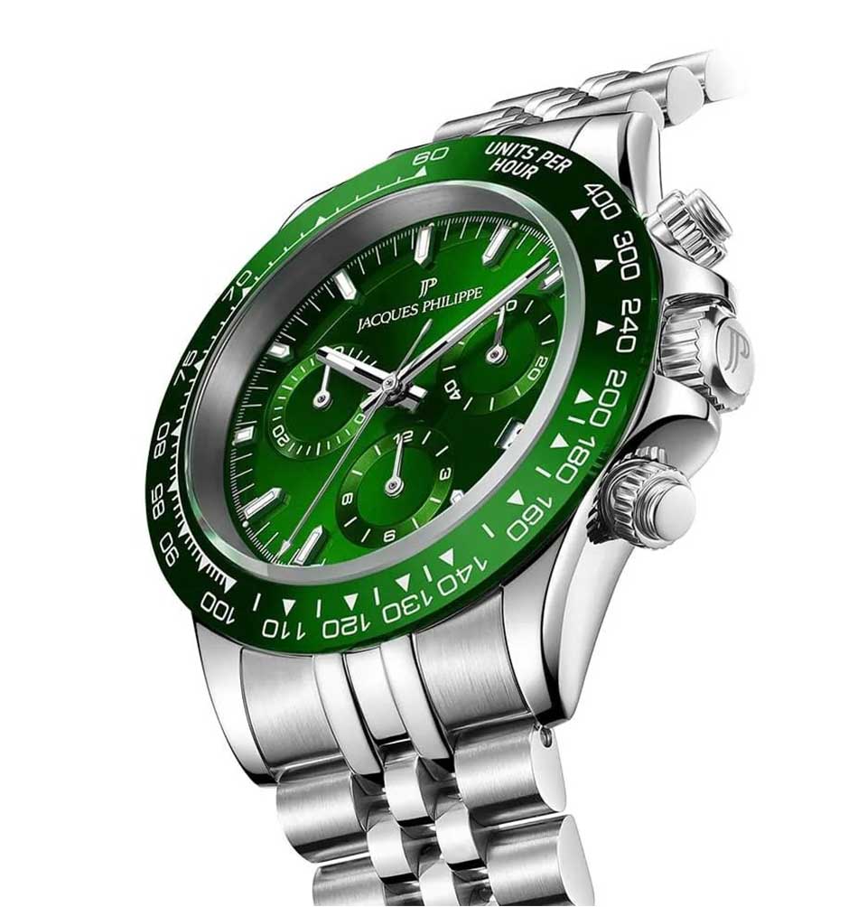 Швейцарские наручные часы Jacques Philippe JPQGC7113X6SBG сочетают в себе современный дизайн, надежность и функциональность, это стильные швейцарские часы с функцией хронографаХронографФункция позволяет измерять отрезки времени с особой точностью: часы, минуты, секунды. Верным признаком хронографа является наличие на циферблате 3 дополнительных окошек-счётчиков. и секундомераСекундомерСекундоме́р — прибор, способный измерять интервалы времени с точностью до долей секунды.. Корпус круглой формы диаметром 39 мм выполнен из прочной нержавеющей стали, а безельБезельВнешний ободок, закрепляющий стекло. В спортивных часах так называется поворотное кольцо с делениями на циферблате, выполняет роль таймера – замеряет отрезки времени на шкале. Неподвижный безель – элемент декора. Однонаправленно вращающийся безель на дайверских часах позволяет фиксировать моменты погружения и выныривания на поверхность. с элегантным зеленым IP-покрытиемIP-покрытиеМетод ионного напыления. Демонстрирует повышенную устойчивость к истиранию, окислению и химическим веществам. Под воздействием высокого давления и температуры около 1500°C молекулы металла надёжно соединяются с частицами корпуса часов., а сапфировое стеклоСапфировое стеклоПрочный и надёжный материал из кристалла сапфира синтетического происхождения, характеризующийся особой твёрдостью и устойчивостью к царапинам и повреждениям. надежно защищает зеленый циферблат от царапин и повреждений. Модель оснащена точным кварцевым механизмом RONDA 5030.D-4H, а также дополнительными функциями — тахиметромТахиметрРазмеченная шкала, располагается на ободке или безеле часов. Тахиметр позволяет рассчитать скорость на определённом участке пути, расстояние измеряется в километрах или милях. и индикатором даты, что делает часы не только стильным аксессуаром, но и практичным помощником на каждый день. Серебристый браслет шириной 20 мм удобно фиксируется на запястье с помощью застежки «бабочка»Застёжка "бабочка"Такой вид застёжки дополняется предохранителями, помогающими избежать случайного раскрытия браслета. Обладают изящным исполнением. . Стрелки имеют люминесцентное покрытиеЛюминесцентное покрытиеПозволяет считывать показания времени в темноте. Производители наносят на стрелки, часовые индексы, безель или поверхность циферблата светонакопительный состав, дающий холодное свечение. для удобства чтения времени в темноте. Водозащита 5 АТМ позволяет не снимать часы при дожде и случайных контактах с водой.