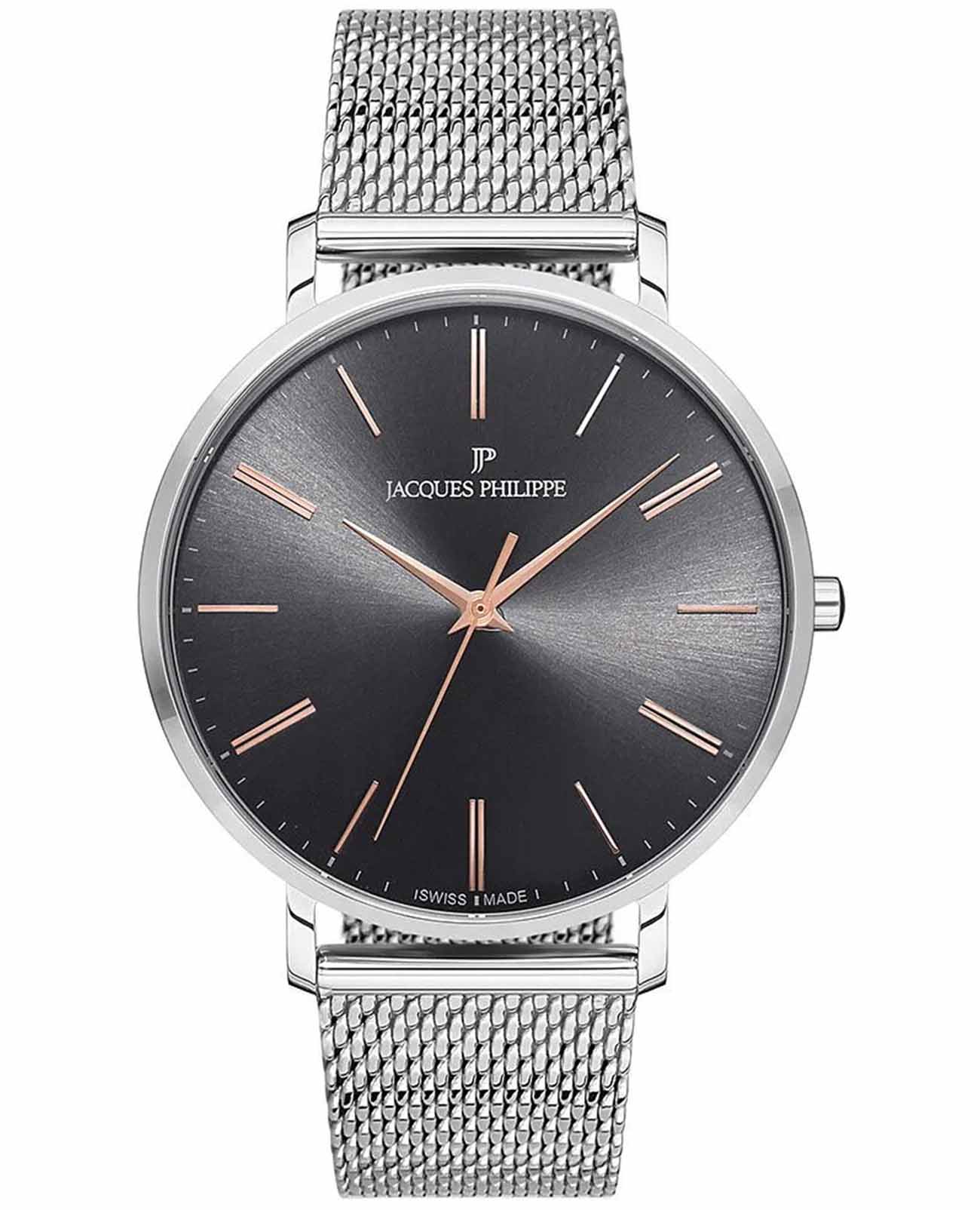 Jacques Philippe JPQGS071246N — изящные мужские часы, сочетающие элегантную сдержанность и функциональную простоту. Корпус диаметром 41 мм выполнен из нержавеющей стали и отличается тонким профилем — всего 7 мм, что делает модель особенно удобной для повседневного ношения и идеальной под манжету рубашки.