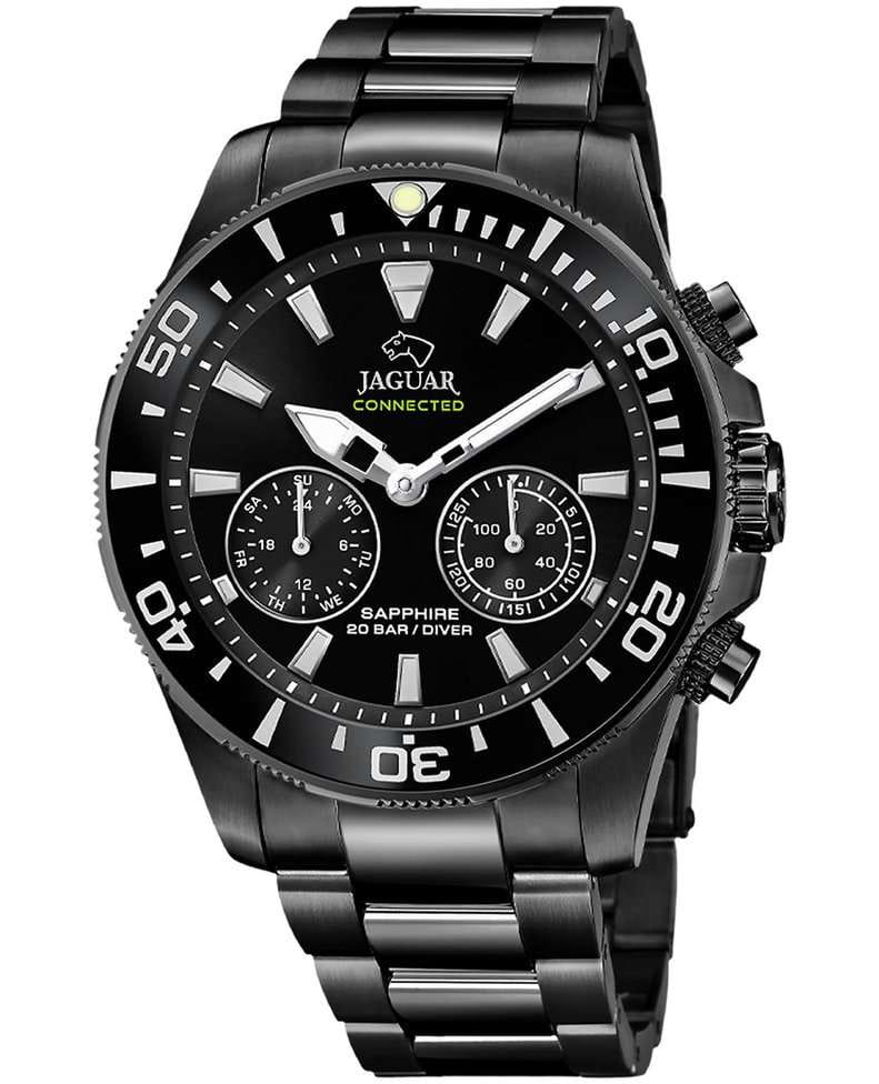 Мужские швейцарские часы Jaguar Connected J929/1. Сапфировое стеклоСапфировое стеклоПрочный и надёжный материал из кристалла сапфира синтетического происхождения, характеризующийся особой твёрдостью и устойчивостью к царапинам и повреждениям. устойчивое к мелким механическим повреждениям. Корпус часов изготовлен из нержавеющей стали с PVD-покрытиемPVDУльтратонкое покрытие наносится в технике вакуумного напыления, сочетает в себе нитрид титана особой прочности со слоем золота или оксида хрома. Несёт в себе декоративную или защитную функцию.. Стрелки и метки с люминесцентным покрытиемЛюминесцентное покрытиеПозволяет считывать показания времени в темноте. Производители наносят на стрелки, часовые индексы, безель или поверхность циферблата светонакопительный состав, дающий холодное свечение.. Календарь находится в положении 8 часов. Класс водозащиты: 200 метров, позволит плавать, нырять и заниматься другими водными видами спорта. Стальной браслет с PVD-покрытиемPVDУльтратонкое покрытие наносится в технике вакуумного напыления, сочетает в себе нитрид титана особой прочности со слоем золота или оксида хрома. Несёт в себе декоративную или защитную функцию. на раскладной застёжкеРаскладная застёжкаТакой тип застёжки используется только на браслетах из металла. Она никогда не раскрывается полностью, происходит разделение на 2 и более частей. Раскладывающая застёжка снизит вероятность потери часов к минимуму.. БезельБезельВнешний ободок, закрепляющий стекло. В спортивных часах так называется поворотное кольцо с делениями на циферблате, выполняет роль таймера – замеряет отрезки времени на шкале. Неподвижный безель – элемент декора. Однонаправленно вращающийся безель на дайверских часах позволяет фиксировать моменты погружения и выныривания на поверхность. с PVD-покрытиемPVDУльтратонкое покрытие наносится в технике вакуумного напыления, сочетает в себе нитрид титана особой прочности со слоем золота или оксида хрома. Несёт в себе декоративную или защитную функцию.. За точный ход работы часов, из коллекции Connected, отвечает кварцевый гибридный механизм швейцарского производства со Смарт-Модулем. Данный тип механизма обеспечивает возможность подключить часы к телефону через Bluetooth и управлять большим рядом дополнительных функций на выбор с помошью приложения Jaguar. Дополнительные функции: отображение даты и дня недели, секундомер, таймер, GMT, шагомер, поиск телефона, включение/выключение звука телефона при входящих вызовах, переключение музыки, вибро-уведомления.