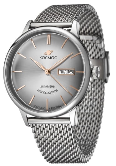 Российские мужские механические часы Космос K 043.10.32 с автоподзаводом оснащены корпусом из нержавеющей стали 316L диаметром 41 мм и защищены минеральным стекломМинеральное стеклоМинеральное стекло представляет собой искусственно выращенный минерал кварца. Такое стекло отличается особой устойчивостью к повреждениям и царапинам. Уступает по некоторым качествам сапфировому стеклу.. Дополнен функциями отображения даты и дня недели. Заводная головка декорирована логотипом бренда в виде стилизованного изображения планеты. Стрелки с люминесцентным покрытиемЛюминесцентное покрытиеПозволяет считывать показания времени в темноте. Производители наносят на стрелки, часовые индексы, безель или поверхность циферблата светонакопительный состав, дающий холодное свечение. обеспечивают хорошую видимость в темное время суток. Часы имеют водонепроницаемость 50 метров, позволит защитить корпус от случайных брызг или капель дождя. Модель комплектуется браслетом из нержавеющей стали 316L с миланским плетением на раскладном замкеРаскладной замокДанный вариант застежки используется только на часах с металлическим браслетом. Отличительная особенность такого крепления в том, что длина браслета становится универсальной и вы можете самостоятельно отрегулировать нужный вам размер – застежка просто двигается по браслету часов.. Специальные крепежи позволяют легко заменить браслет на часах самостоятельно. Прочный корпус и надежный механизм делают эти часы универсальным аксессуаром для повседневного использования. Уникальный дизайн и высокое качество материалов подчеркивают индивидуальность владельца.