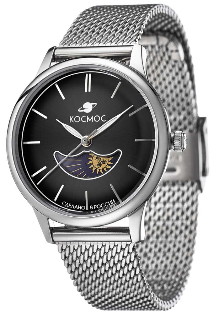 Женские наручные часы Космос Солнце и Луна K 617.10.31 — это сочетание традиций часового искусства 60-70-х годов и футуристического дизайна, вдохновленного космическими исследованиями. Они не только служат напоминанием о прошлом, но и побуждают задуматься о будущем, позволяя наслаждаться качеством и смыслом, вложенными в каждую деталь. Полированный корпус часов выполнен в виде силуэта летающей тарелки благодаря выпуклым формам стекла и нижней части корпуса. Стальные ушки, которые напоминают опоры летающей тарелки, завершает общий образ. На задней крышке часов выгравирован фантазийный сюжет – космическая станция будущего. Элегантные женские часы из серии Солнце и Луна выделяются функцией день/ночь. Циферблат выполнен в ретро-стиле с выгнутыми краями, что требует применения сложных технологий в производстве. Циферблаты такой формы были характерны для часов прошлых эпох. Кончик секундной стрелки изогнут в соответствии с формой циферблата. На градиентном выпуклом циферблате выполнена шлифовка в стиле солнечных лучей, а также размещены индексы, изготовленные вручную и закрепленные на двух штифтах. Часовая и минутная стрелки, а также круг по краю циферблата, напоминающий ореол Земли, с люминесцентным покрытиемЛюминесцентное покрытиеПозволяет считывать показания времени в темноте. Производители наносят на стрелки, часовые индексы, безель или поверхность циферблата светонакопительный состав, дающий холодное свечение., которое светится в темноте, создавая завораживающий эффект. Форма минерального стеклаМинеральное стеклоМинеральное стекло представляет собой искусственно выращенный минерал кварца. Такое стекло отличается особой устойчивостью к повреждениям и царапинам. Уступает по некоторым качествам сапфировому стеклу. тщательно продумана: оно выгнуто как снаружи, так и изнутри. Такое решение позволяет избежать искажения изображения на циферблате, в отличие от стекла с прямой внутренней частью, которое создает эффект линзы. Модель оснащена гибким и прочным браслетом миланского плетения. Заводная головка, застежка и ремешок украшены фирменным логотипом.