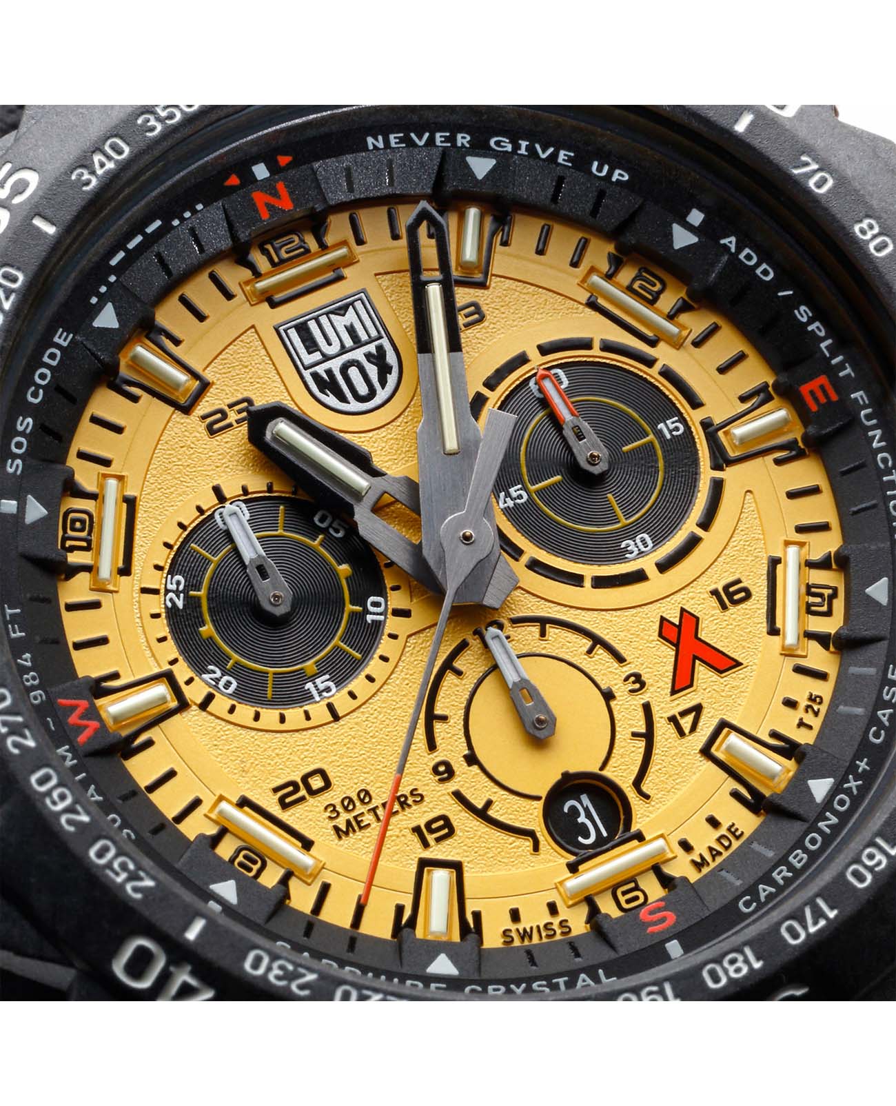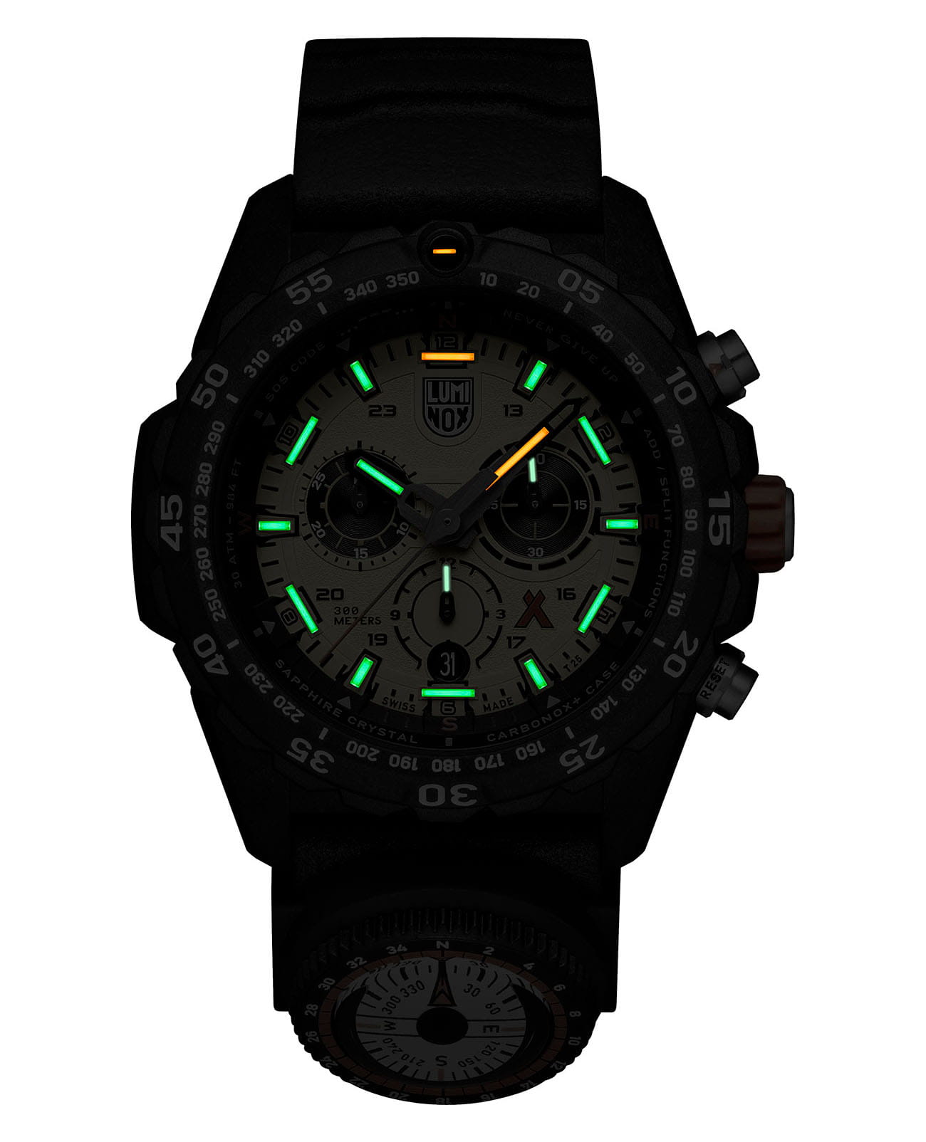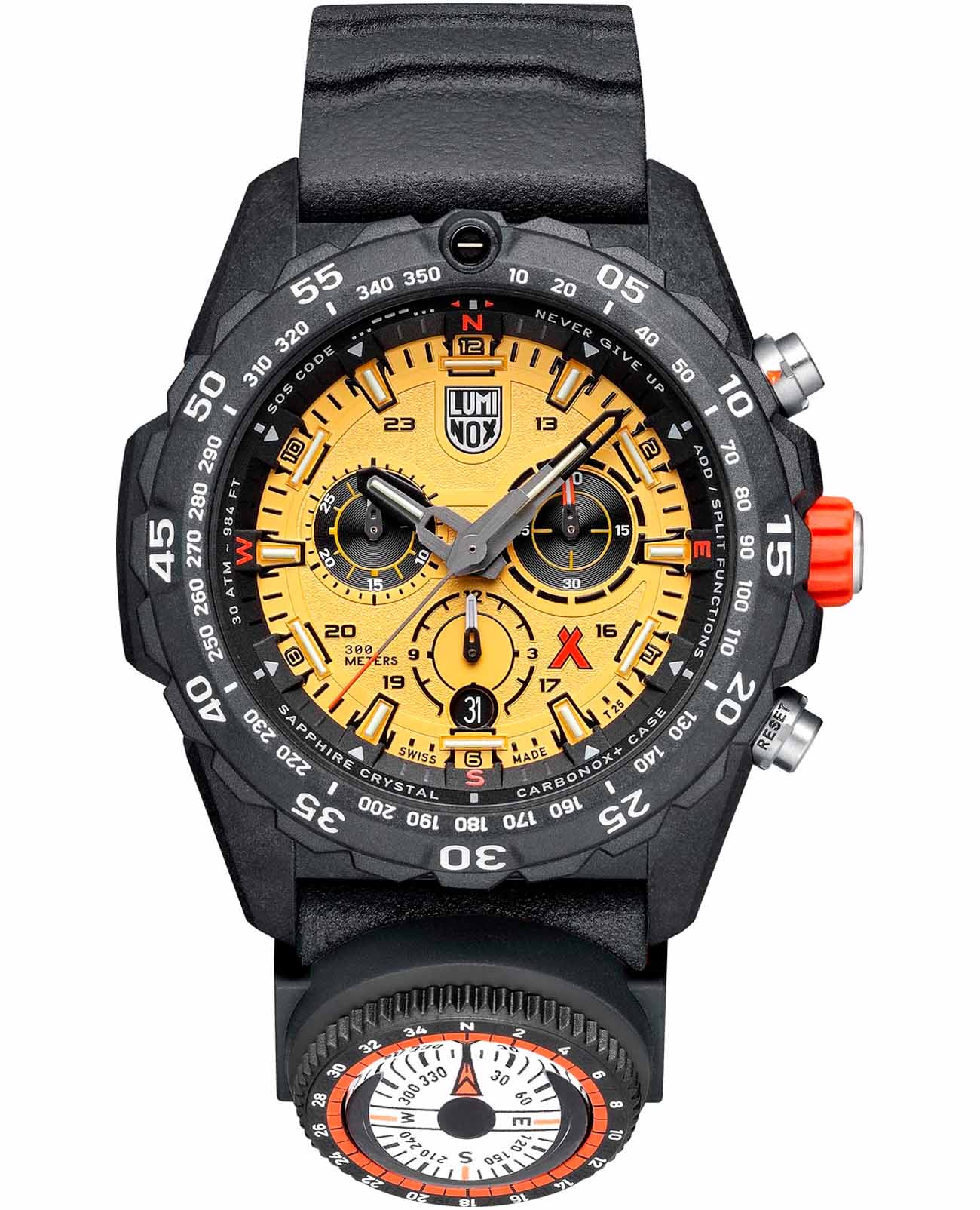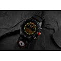 Мужские наручные часы-хронографХронографФункция позволяет измерять отрезки времени с особой точностью: часы, минуты, секунды. Верным признаком хронографа является наличие на циферблате 3 дополнительных окошек-счётчиков. Luminox Bear Grylls Survival Series XB.3745 разработаны для любителей активного образа жизни и экстремальных условий. Модель обладает круглым корпусом диаметром 45 мм, изготовленным из черного пластика, что обеспечивает исключительную прочность и легкость конструкции. Браслет выполнен из полиуретана черного цвета с текстурированной поверхностью, оснащен классической застежкой, гарантирующей комфортное ношение и безопасность. Циферблат украшен крупными индексами и стрелками с люминесцентным покрытиемЛюминесцентное покрытиеПозволяет считывать показания времени в темноте. Производители наносят на стрелки, часовые индексы, безель или поверхность циферблата светонакопительный состав, дающий холодное свечение., обеспечивающим отличную видимость в условиях недостаточной освещенности. Для защиты используется сапфировое стеклоСапфировое стеклоПрочный и надёжный материал из кристалла сапфира синтетического происхождения, характеризующийся особой твёрдостью и устойчивостью к царапинам и повреждениям. с антибликовым покрытиемАнтибликовое покрытиеСлой оксида металла в 0,13-0,3 микрон, благодаря которому стекло часов не бликует и не отражает свет. Антибликовое покрытие уменьшает отражение света в 10 раз, обеспечивая отличную читаемость показателей циферблата., которое не только защищает от царапин, но и обеспечивает четкое чтение времени при ярком свете. Часы работают на кварцевом механизме, который гарантирует точное время без необходимости подзаводки и имеет длительный срок службы батареи — около 3-4 лет. Модель также оснащена односторонним безелемБезельВнешний ободок, закрепляющий стекло. В спортивных часах так называется поворотное кольцо с делениями на циферблате, выполняет роль таймера – замеряет отрезки времени на шкале. Неподвижный безель – элемент декора. Однонаправленно вращающийся безель на дайверских часах позволяет фиксировать моменты погружения и выныривания на поверхность. с делениями для расчета времени погружения или выполнения других задач, а также функцией второго часового поясаВторой часовой поясФункция, позволяющая отображать время двух часовых поясов одновременно., что делает ее удобной для путешествий и международных перелетов. Водонепроницаемость часов достигает 300 метров (30 атмосфер), что позволяет использовать их во время плавания, дайвинга и других водных видов спорта. Luminox XB.3745 создан в сотрудничестве с Bear Grylls, сочетая в себе функциональность, надежность и стиль, необходимые для выживания в самых сложных условиях.